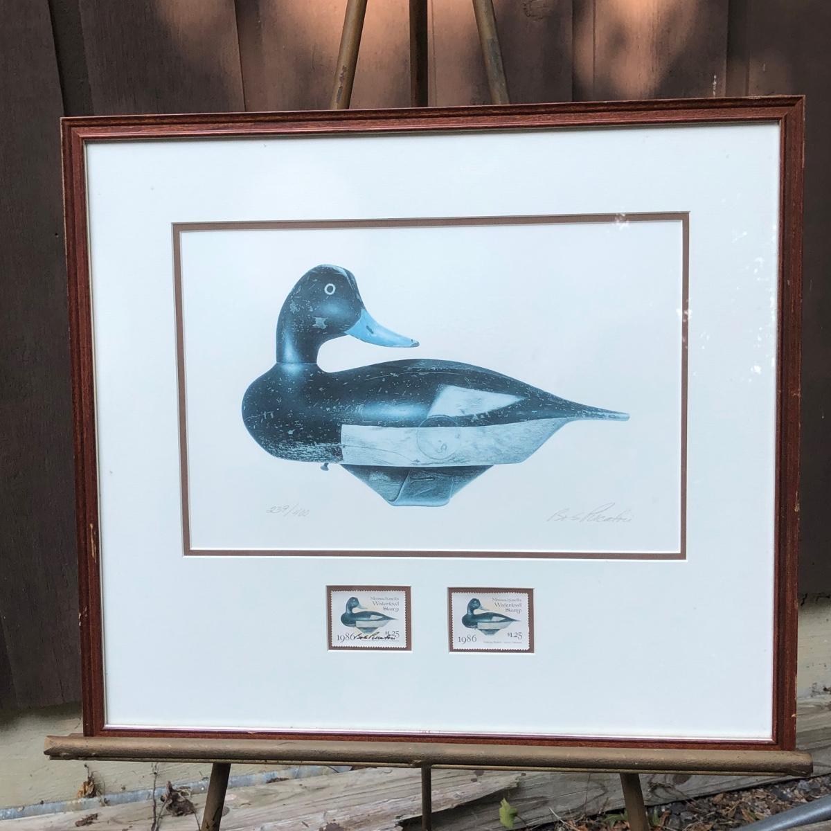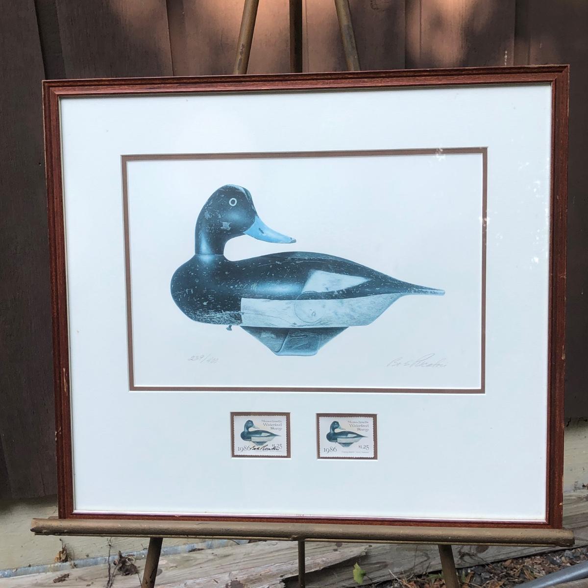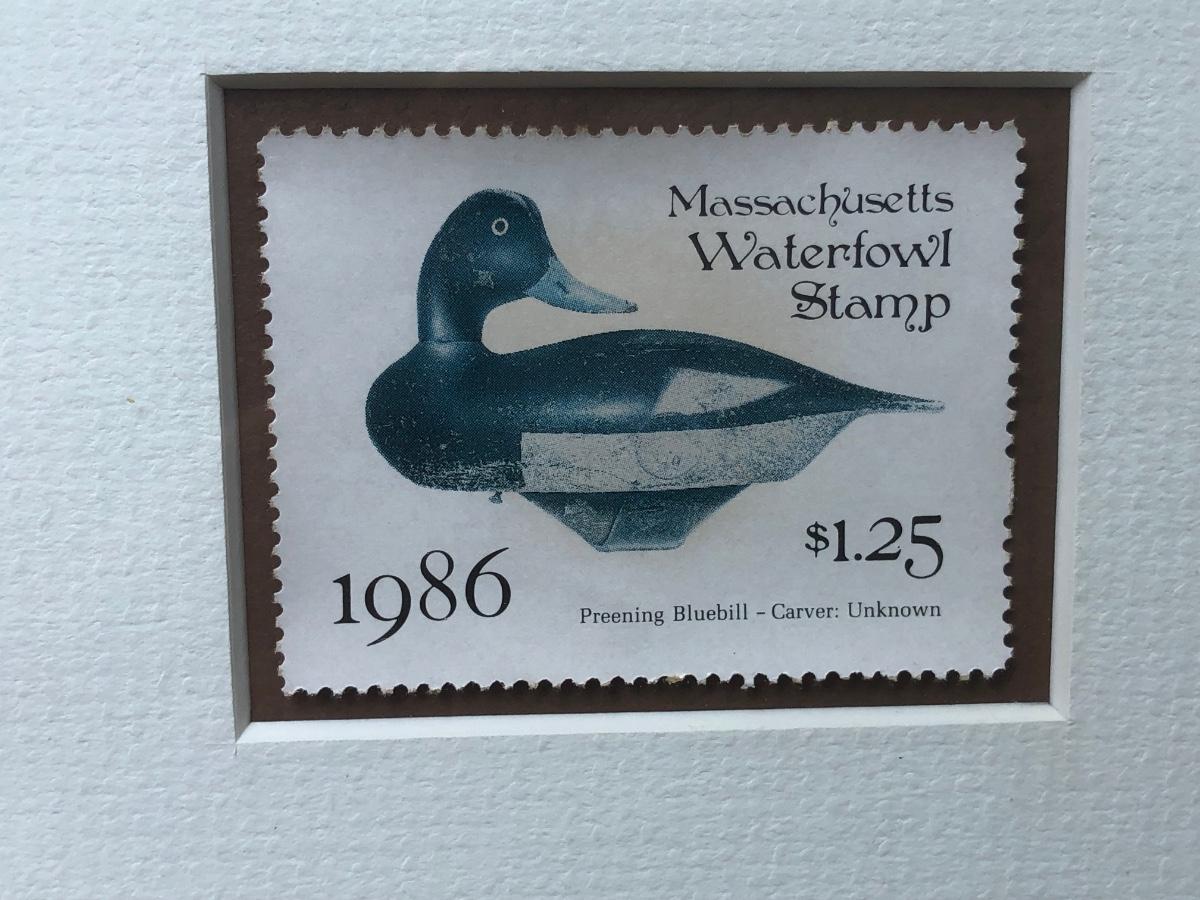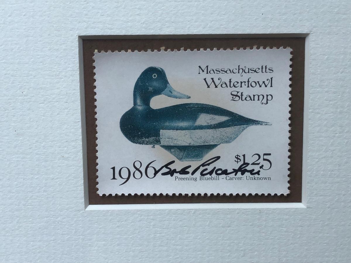 LOT 384G: 1986 Massachusetts Waterfowl Stamp Decoy Duck Photograph & Stamps Signed by Bob Piscatori (American, 20th century)
