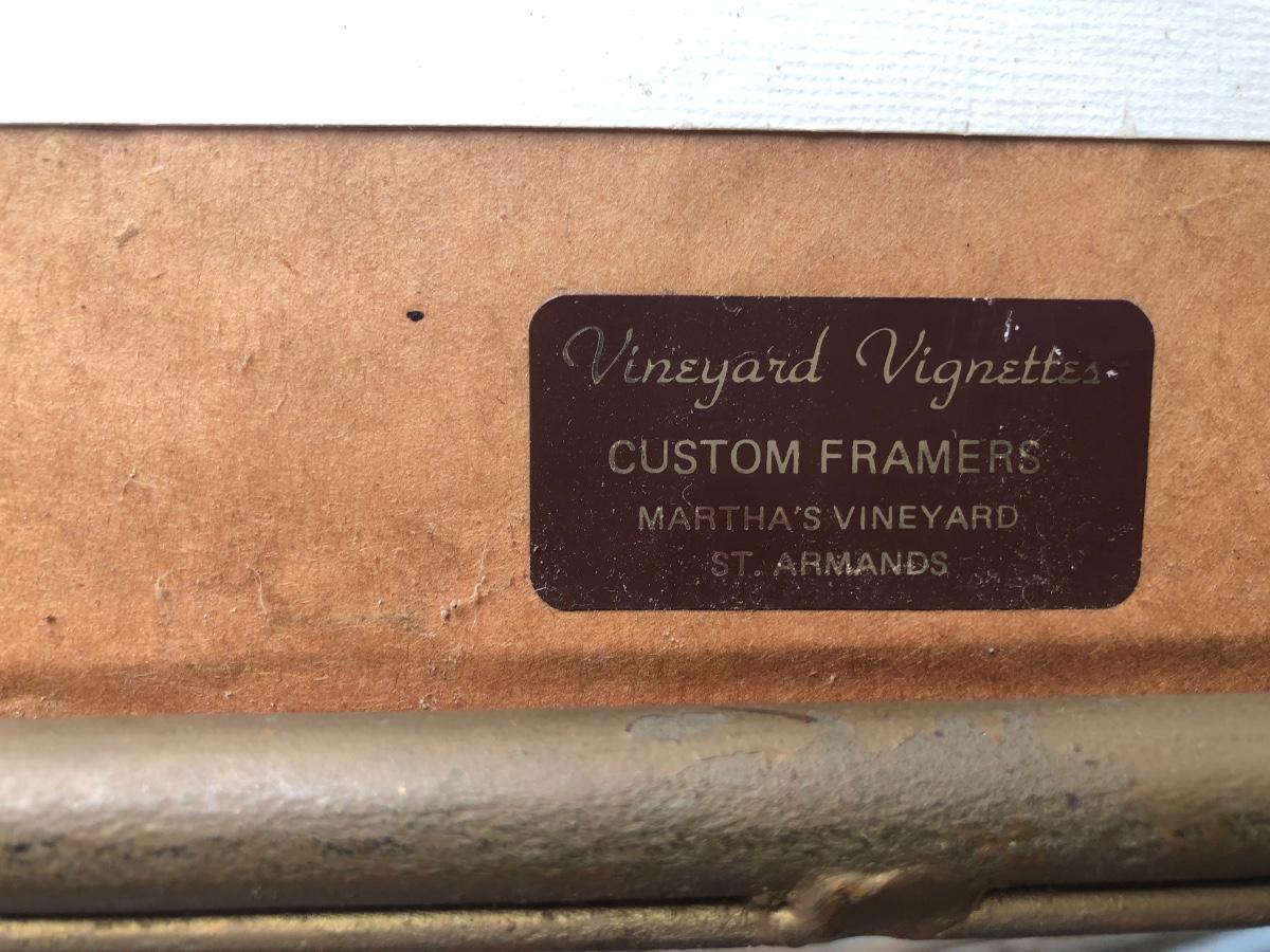 Framed piece measures 19 x 17 inches. Blurb on the back includes artist info.
