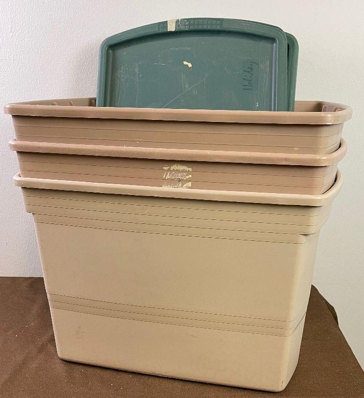 Lot #385  3 Large Storage Tubs Taupe and Green