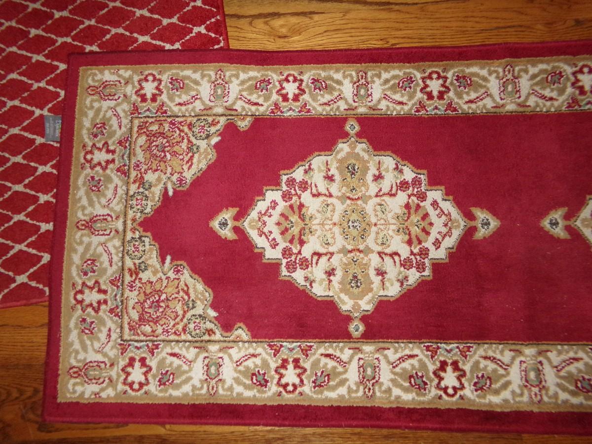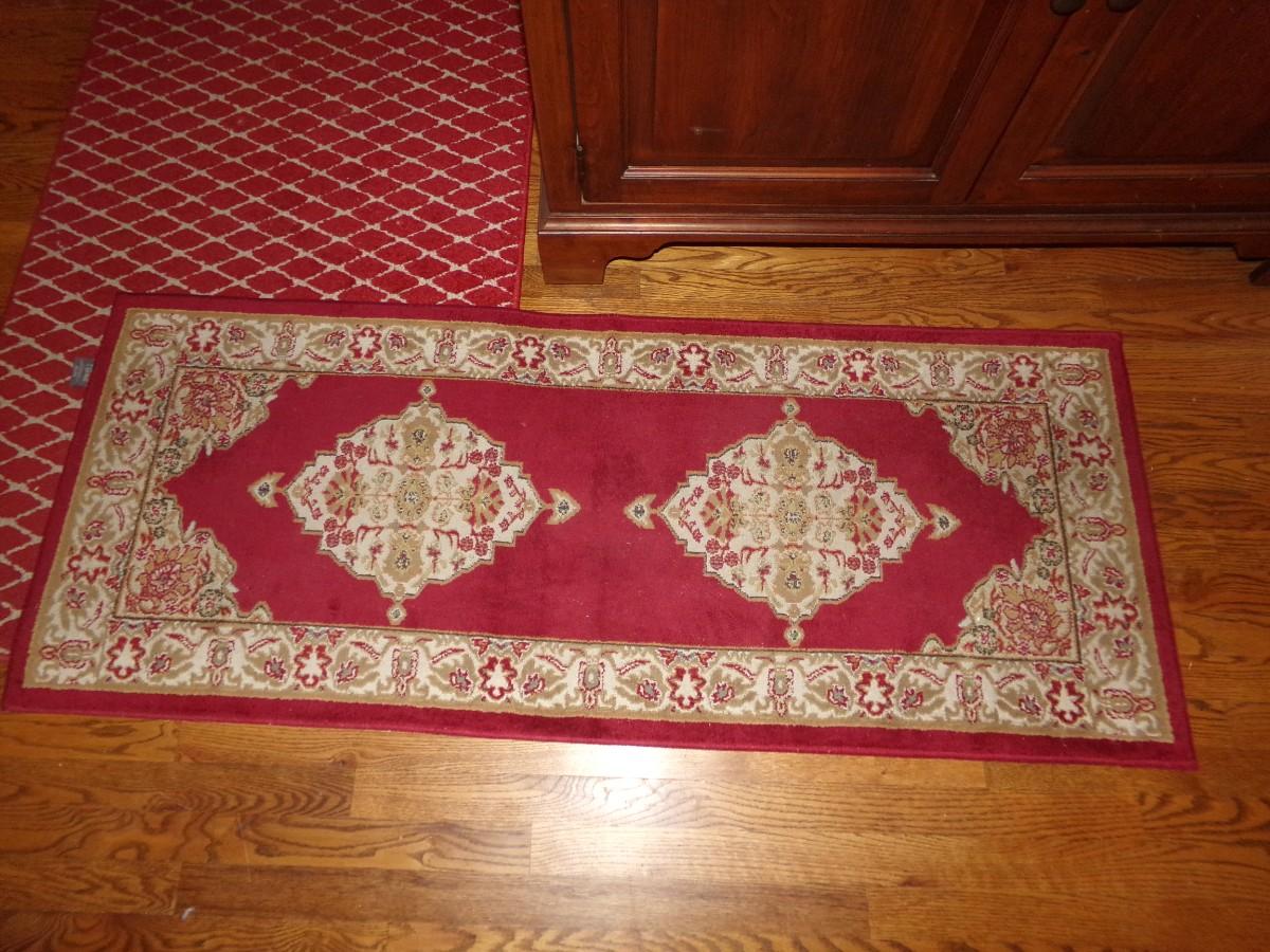 2 RUGS THAT ARE REDDISH IN COLOR. THE DESIGN ON THESE RUGS IS REALLY PRETTY. THEY ARE IN GOOD CONDITION.
