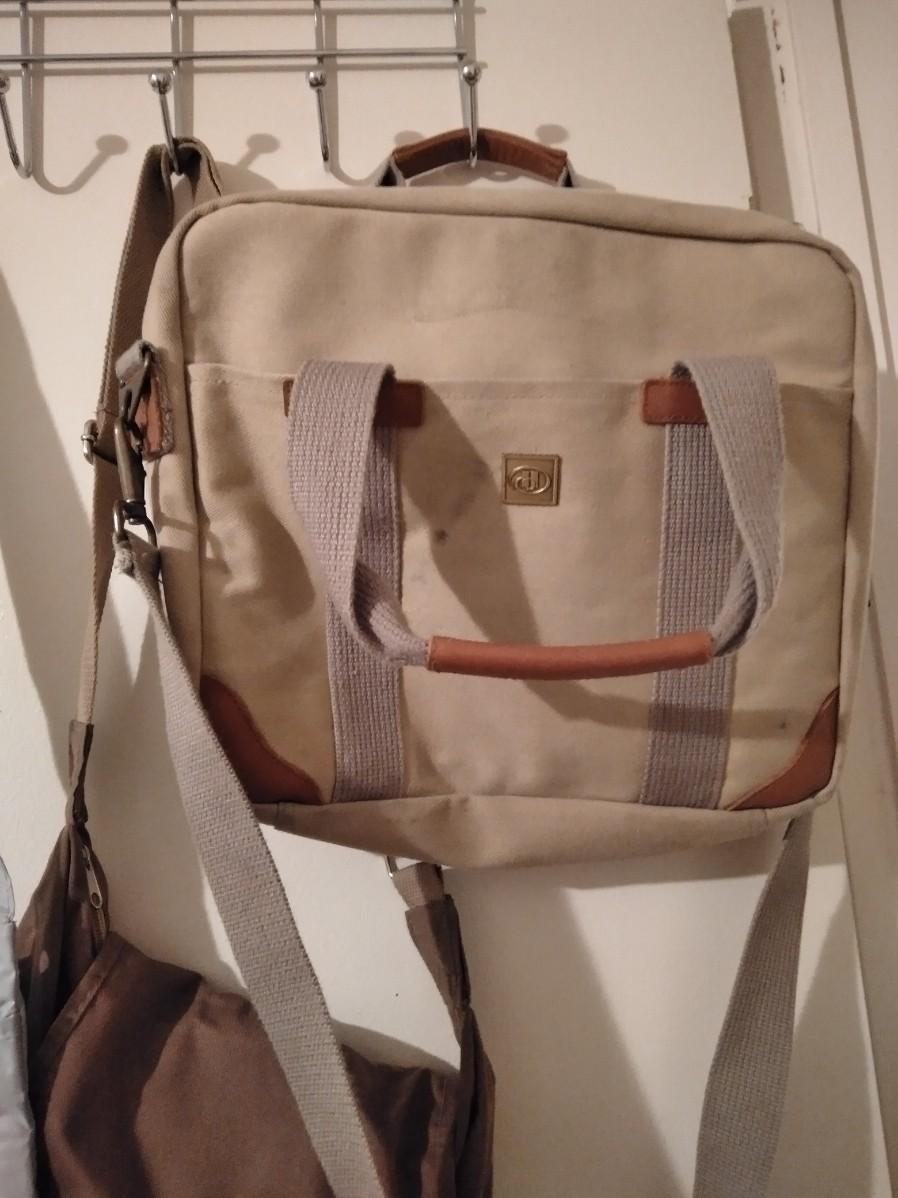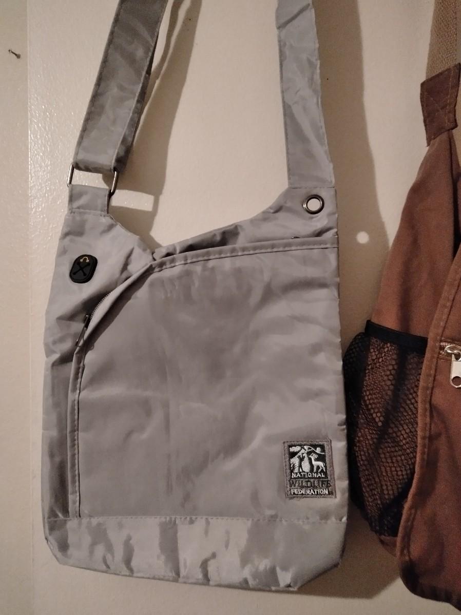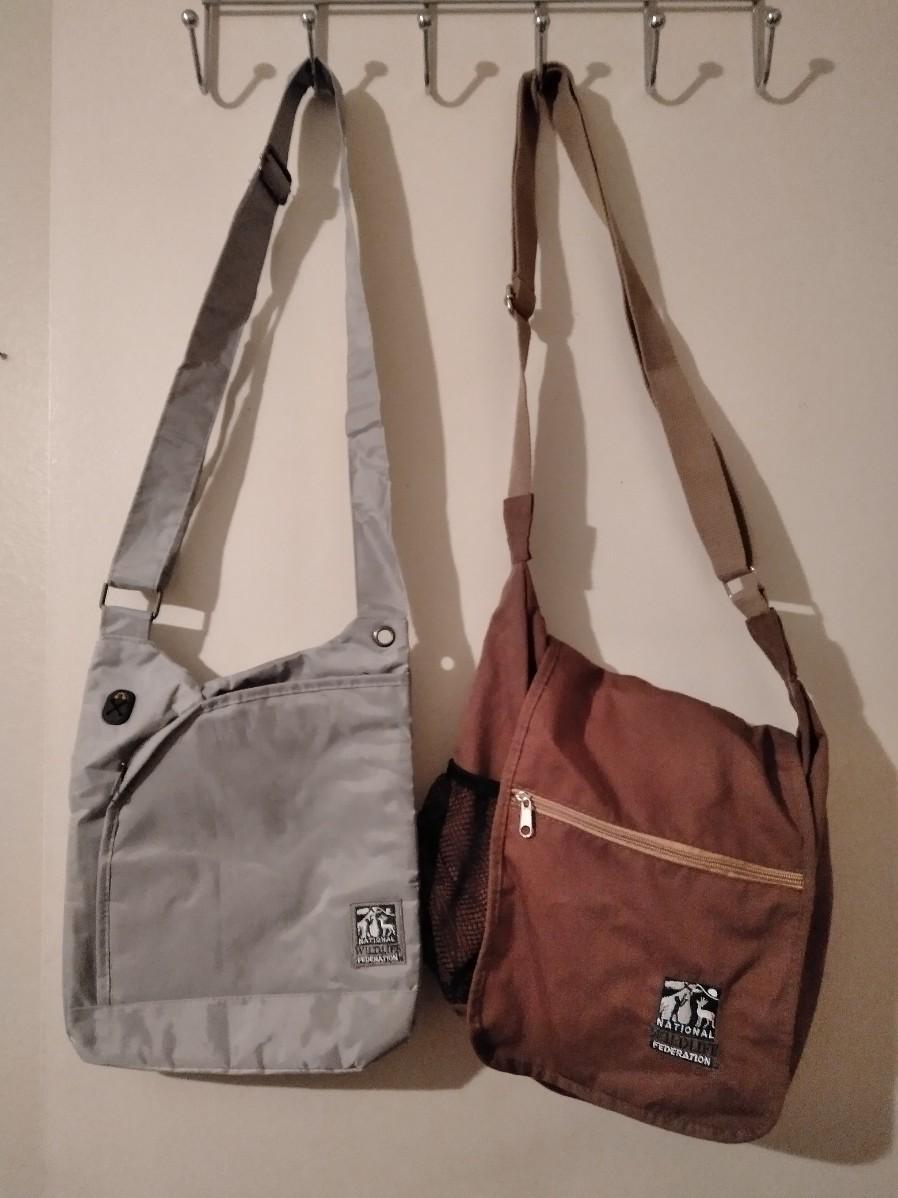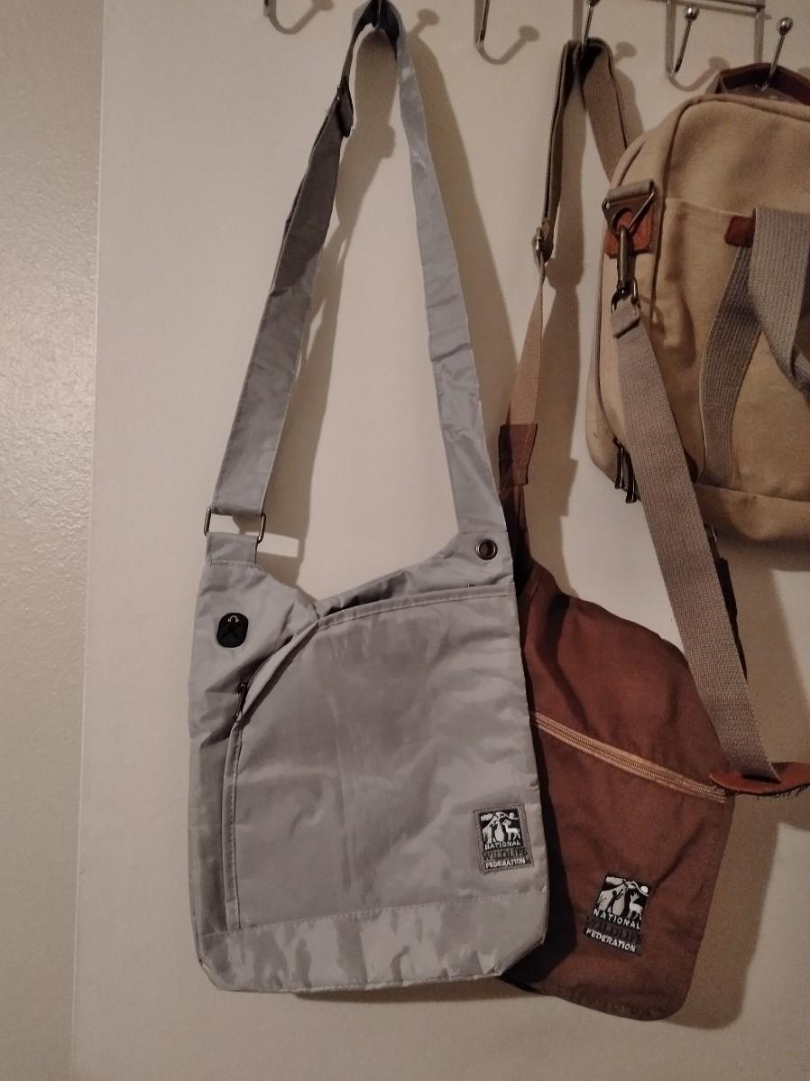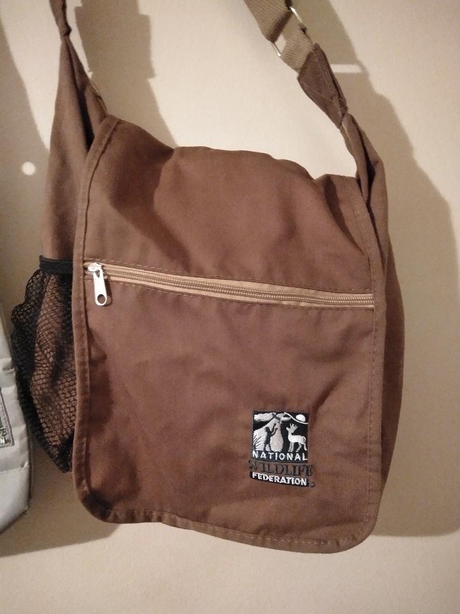 TWO CLOTH NATIONAL WILDLIFE FEDERATION SACS AND A BROWN LAPTOP CASE