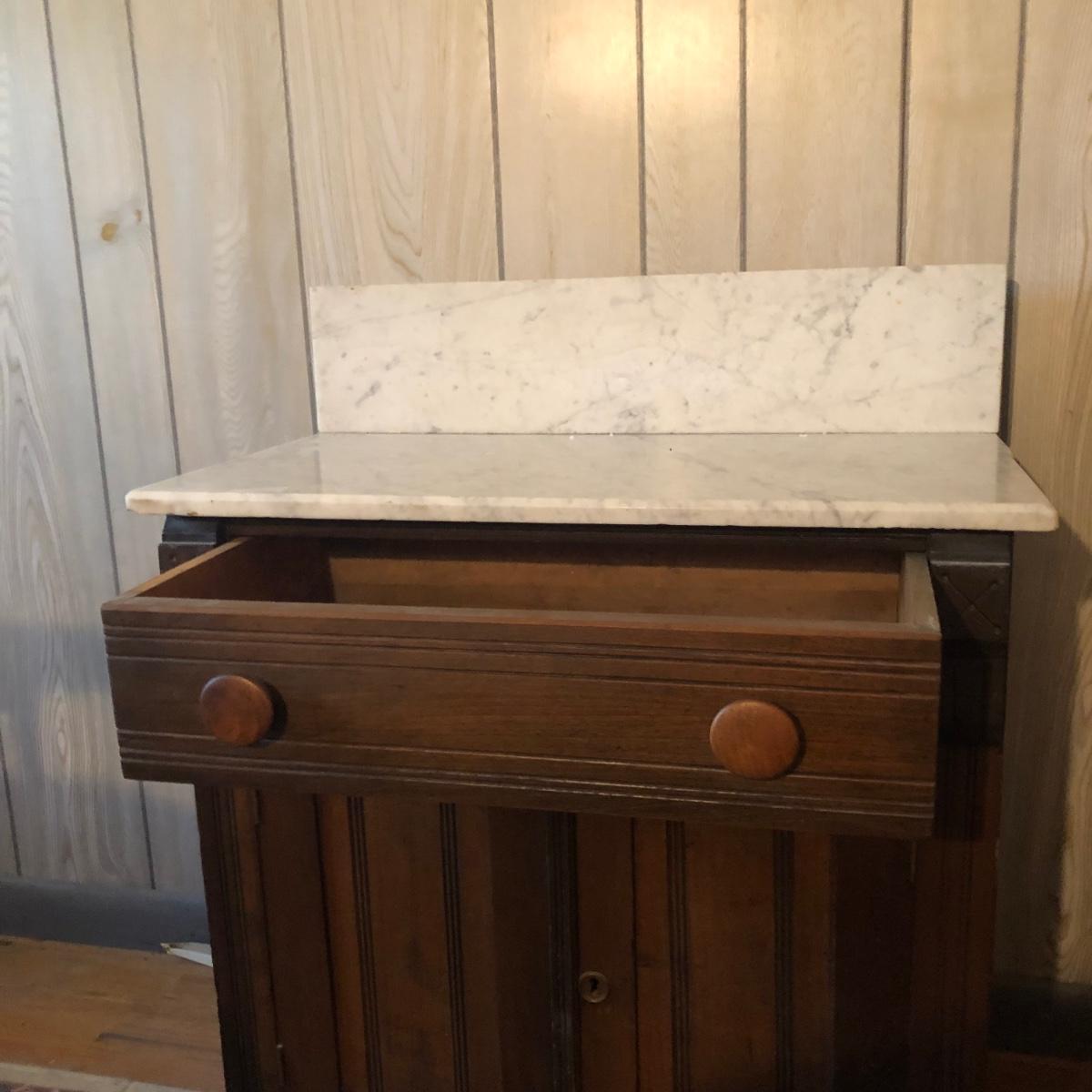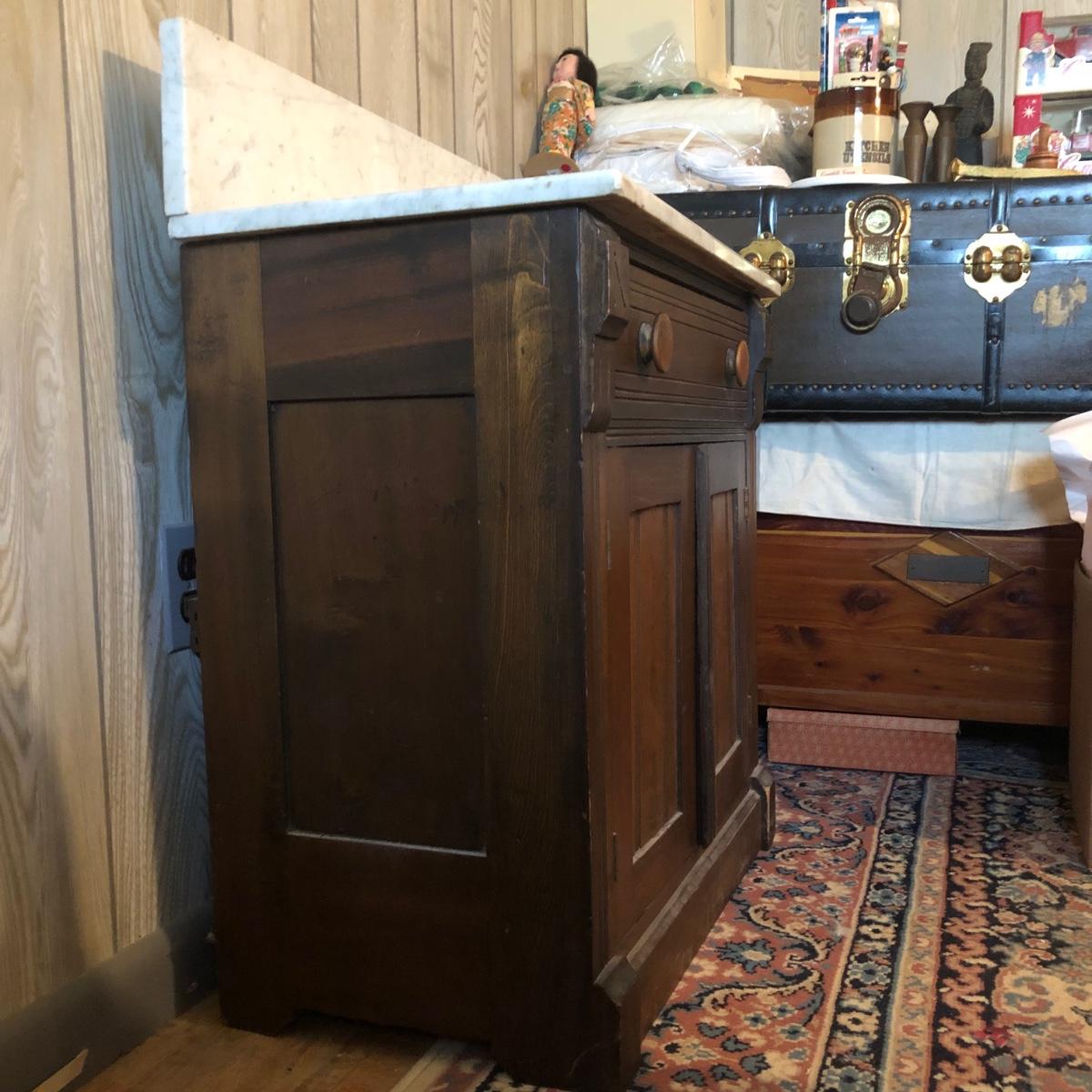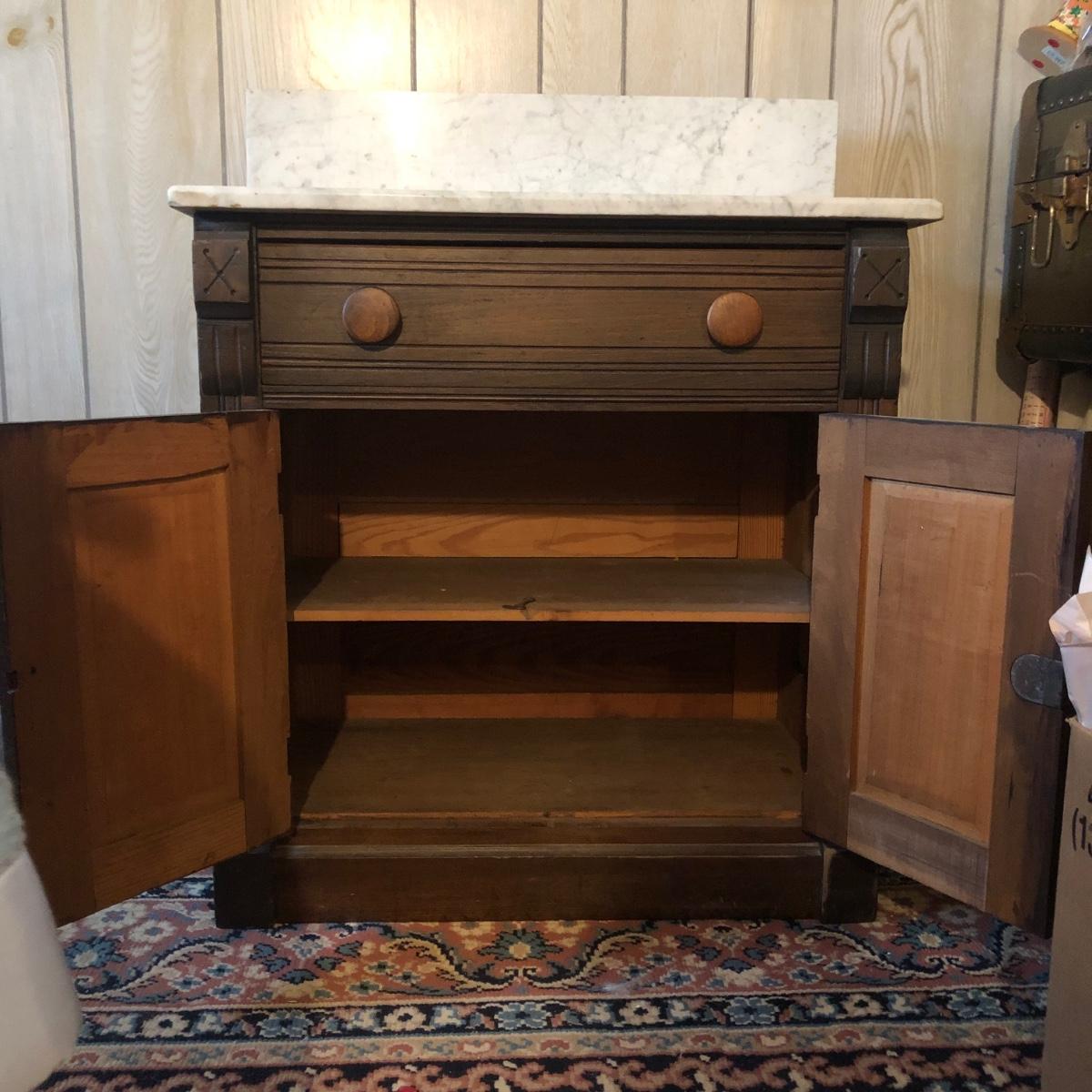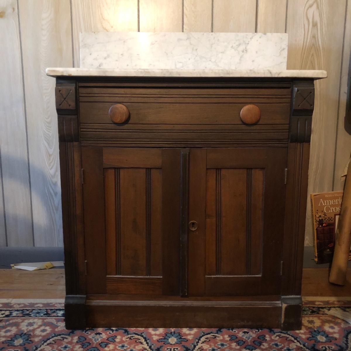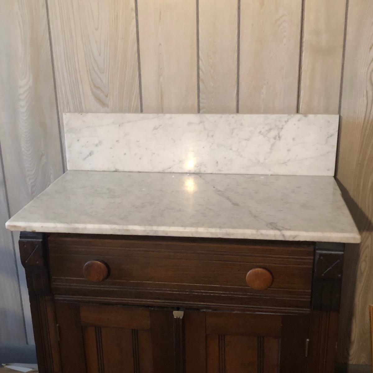 Marble top is a separate piece from the wood part of the cabinet. Measures 27 x 25 x 33 inches.