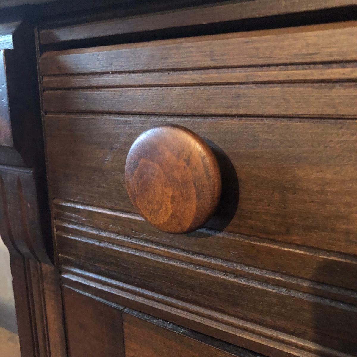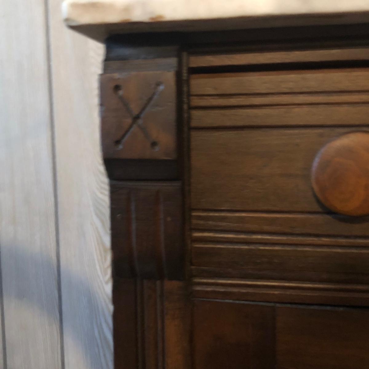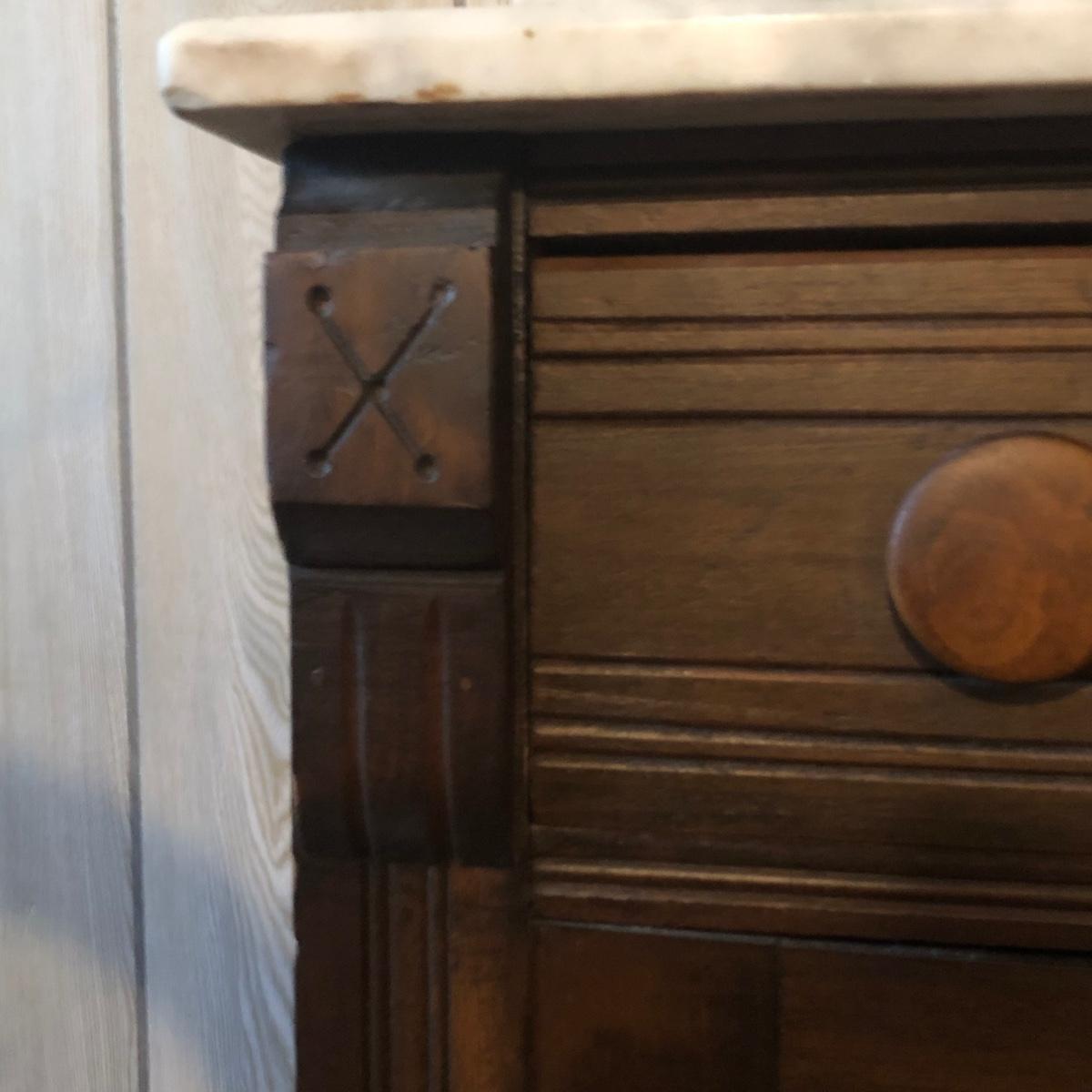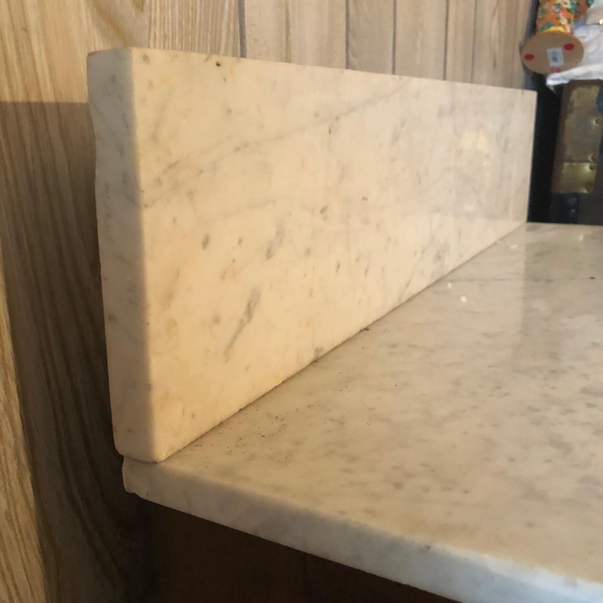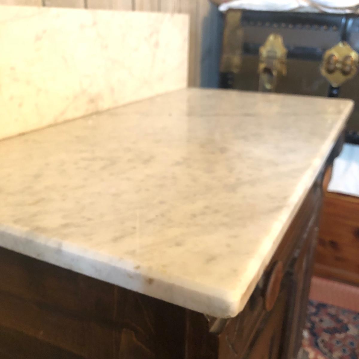 Marble top is a separate piece from the wood part of the cabinet. Measures 27 x 25 x 33 inches.