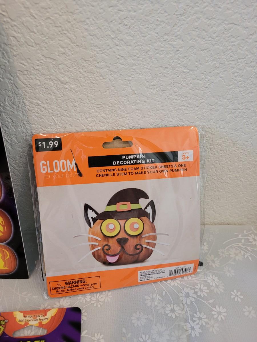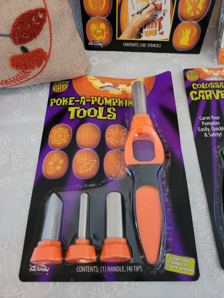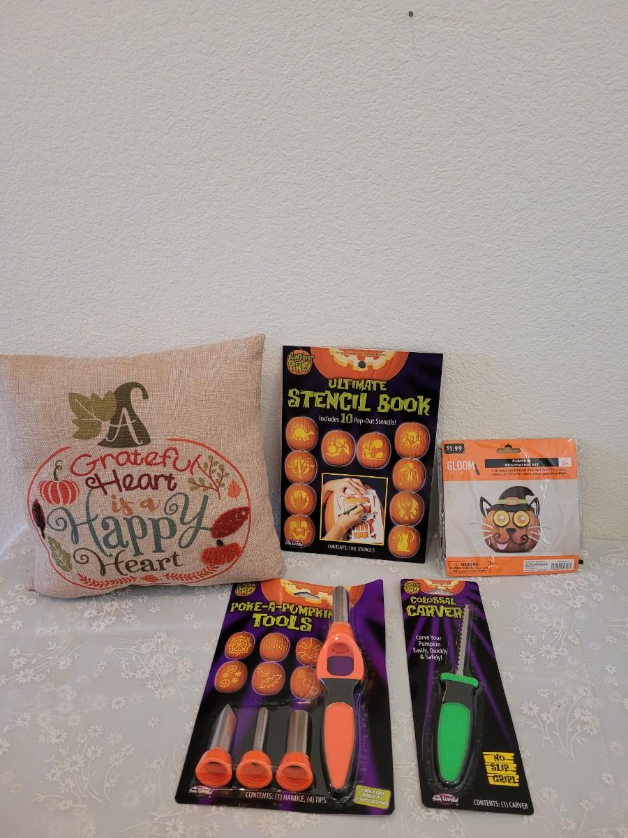 Lot 386: Fall Pillow, Pumpkin Carving kits, Stencils and Decorating Kit