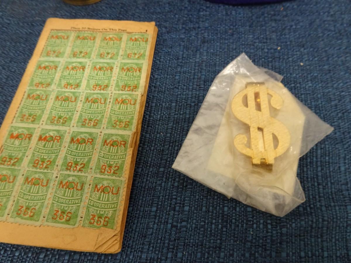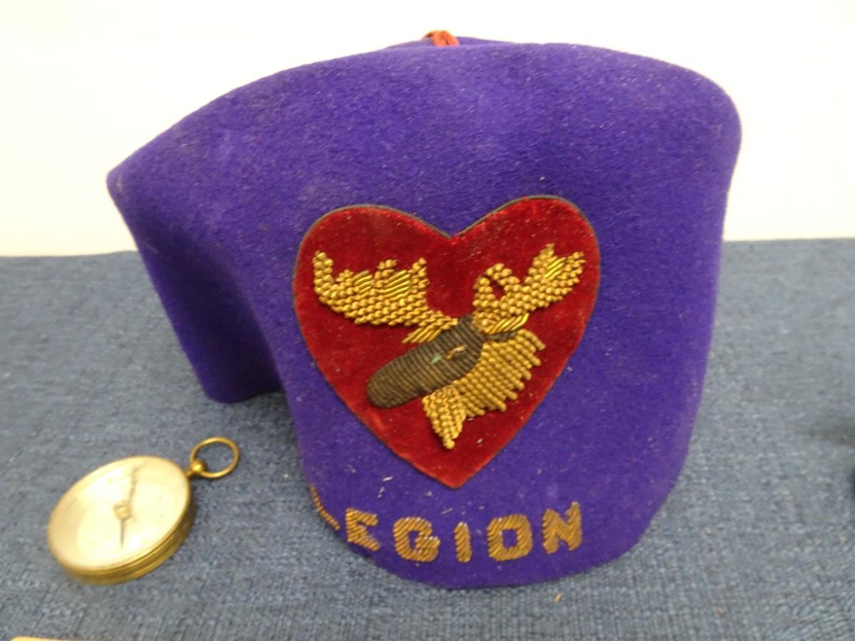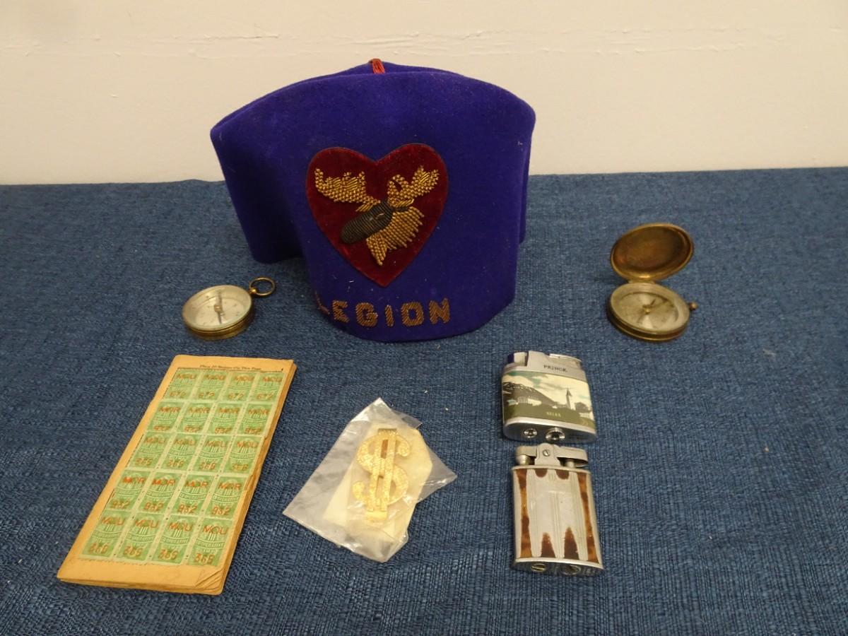 LOT 386. VINTAGE LEGION HAT, TWO COMPASS TWO LIGHTERS AND GREEN STAMP BOOK