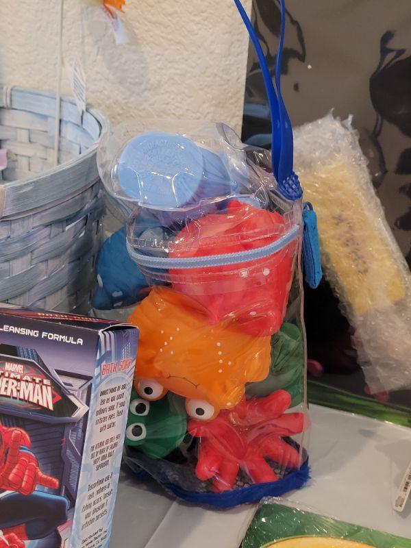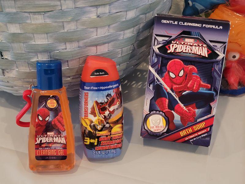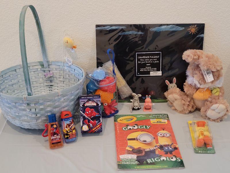 Lot 387: New Easter Basket with Ganz Bunny, Bath Toys, Spider-Man Bath Soap-Shampoo-Cleansing Gel, Pez, Activity Pad