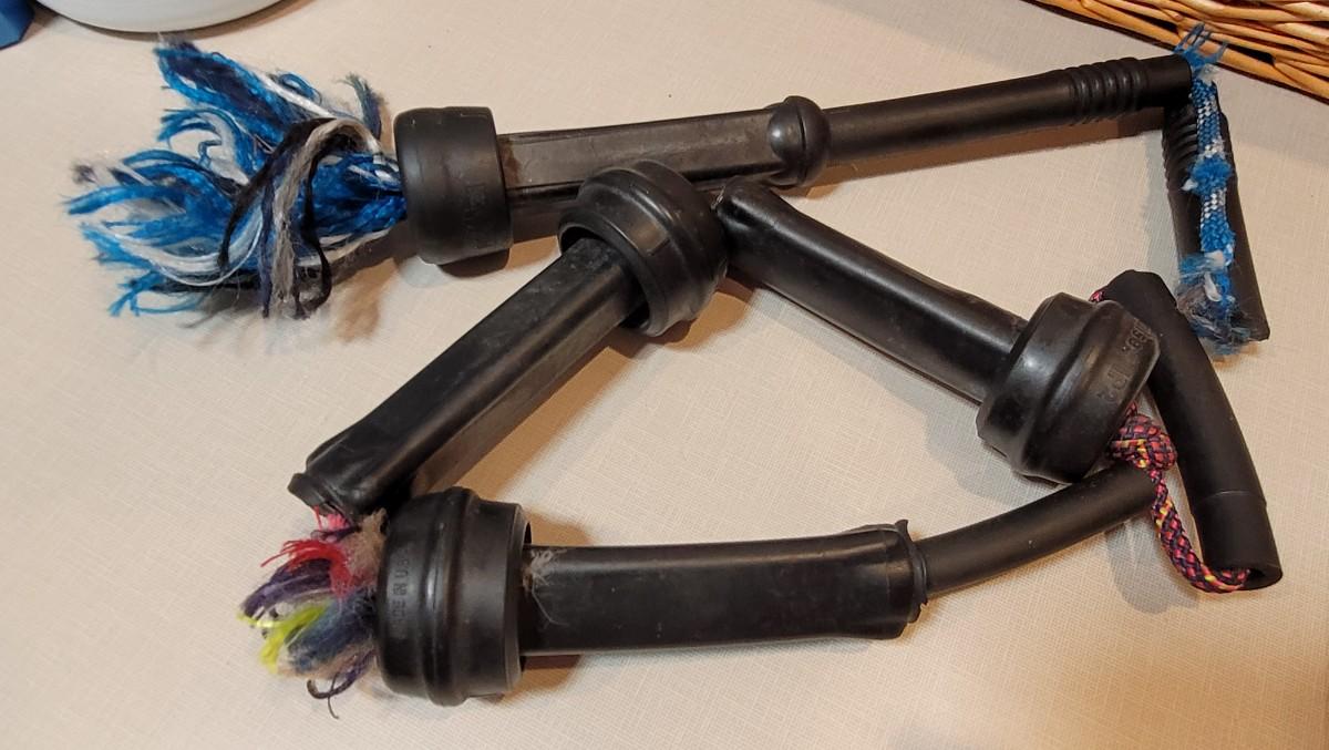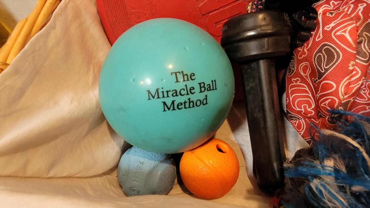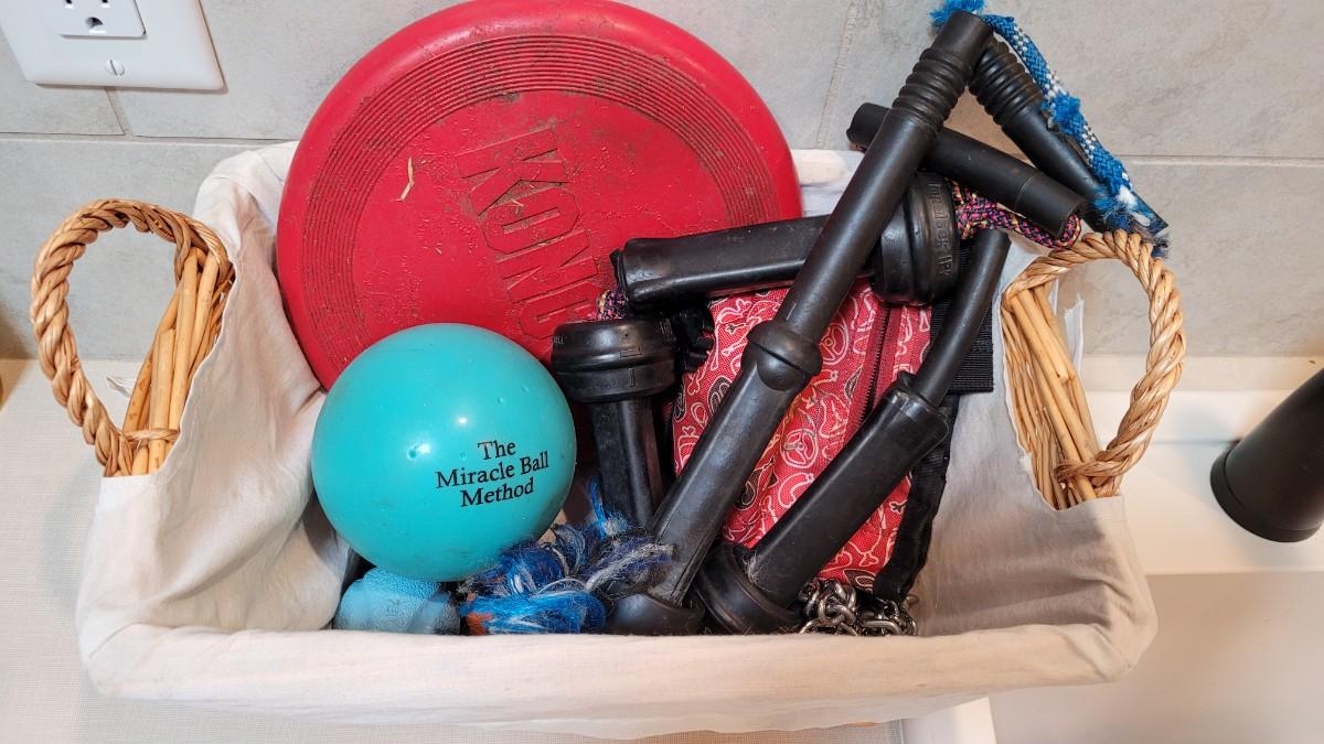 Lot 387: Assortment of Used Dog Toys w/ Basket