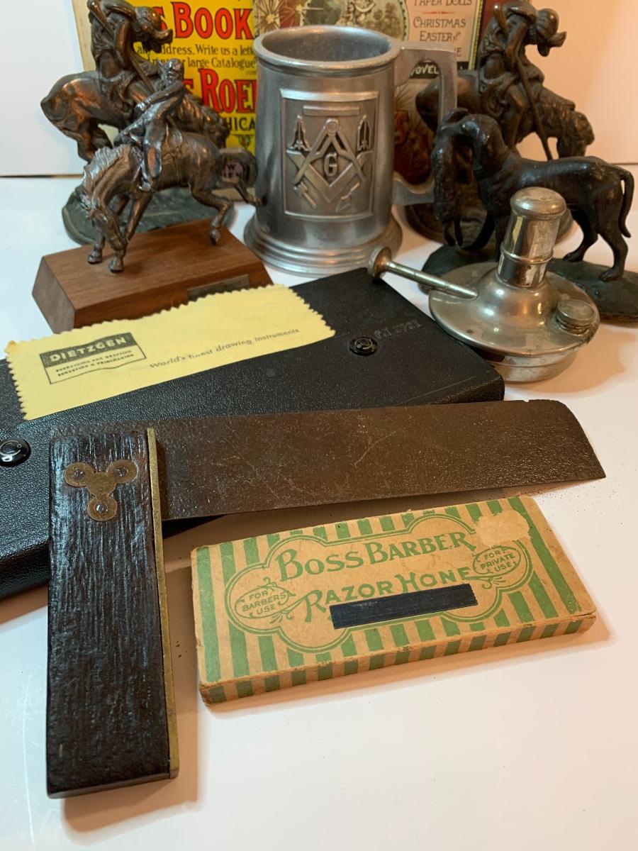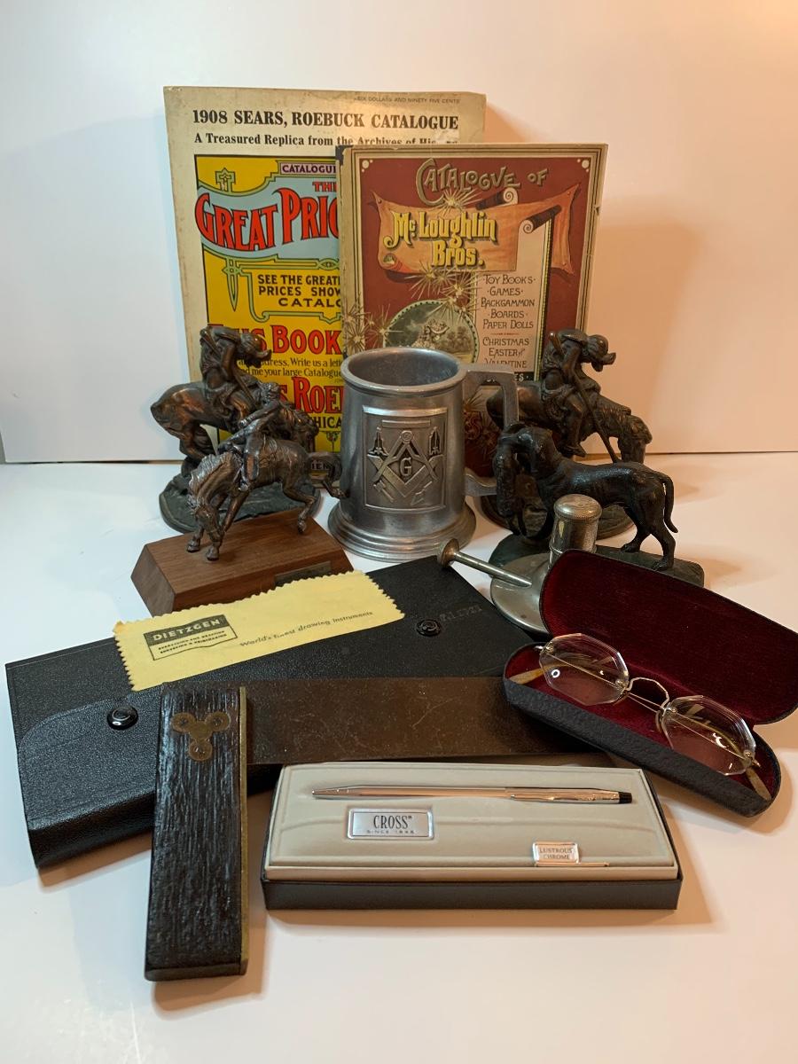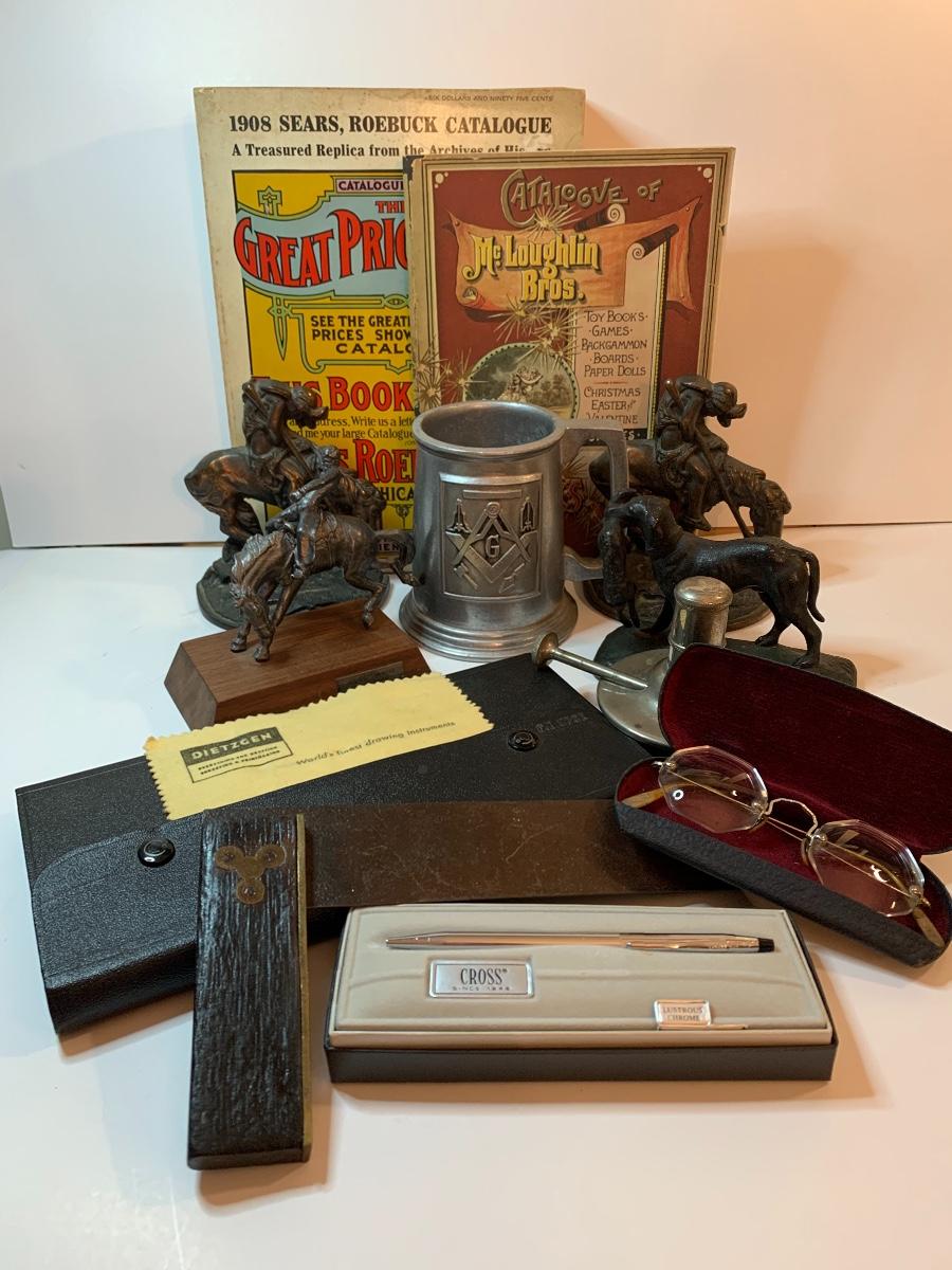 Vintage delicate reading glasses are included with this lot with a Cross Pen in box , a complete set of drawing Instruments, bronze like books end and other items. Please see all pictures as they are the best representation of the items. The pictures show condition, measurements if taken, and what is included in the lot. Due to the large amount that we photograph and the time frame, we are not always able to take measurements. All items unless noted, are pre-owned and have been used. If you purchased furniture, you must bring help. We do not allow one person to carry large furniture out on their own. Bring help, tools and a truck for the safety of our client’s homes, and your personal safety. Company policy. Thank you.