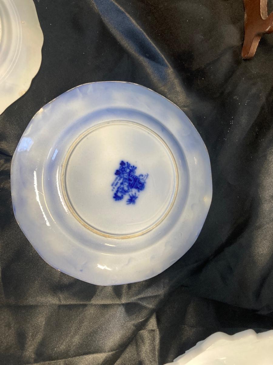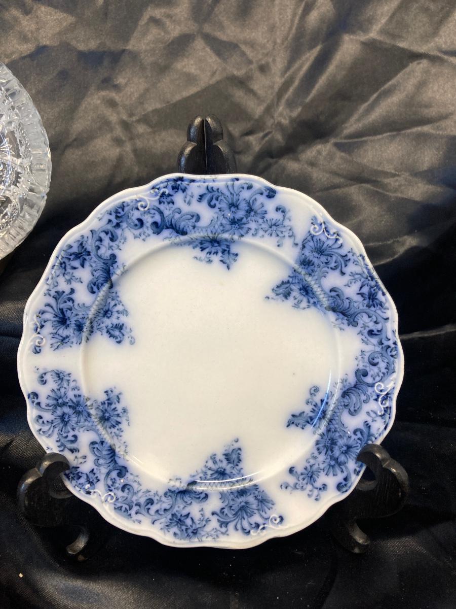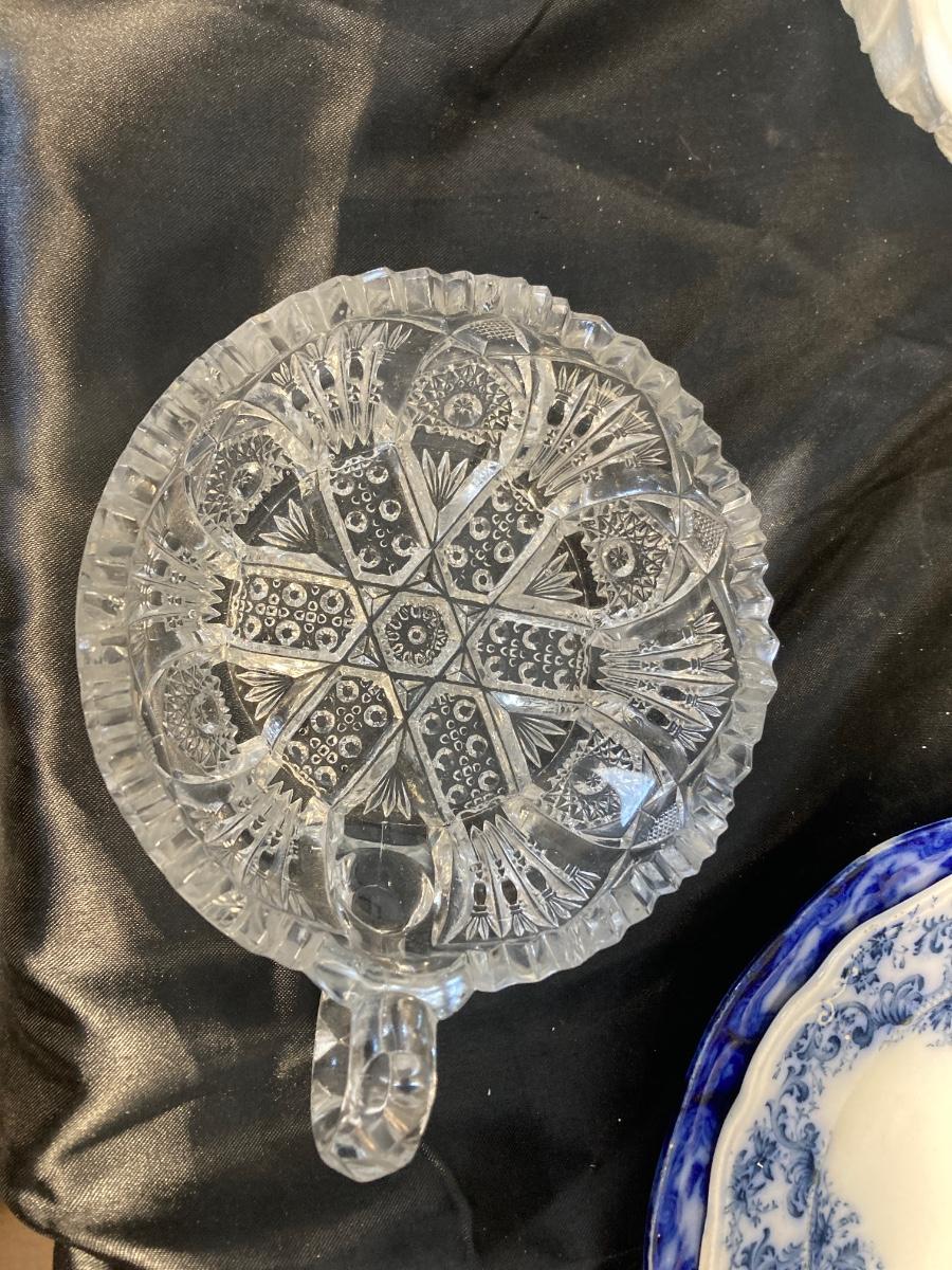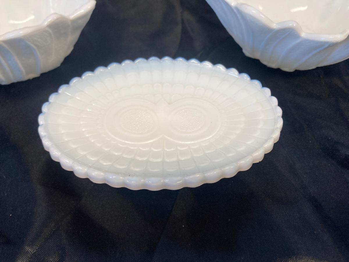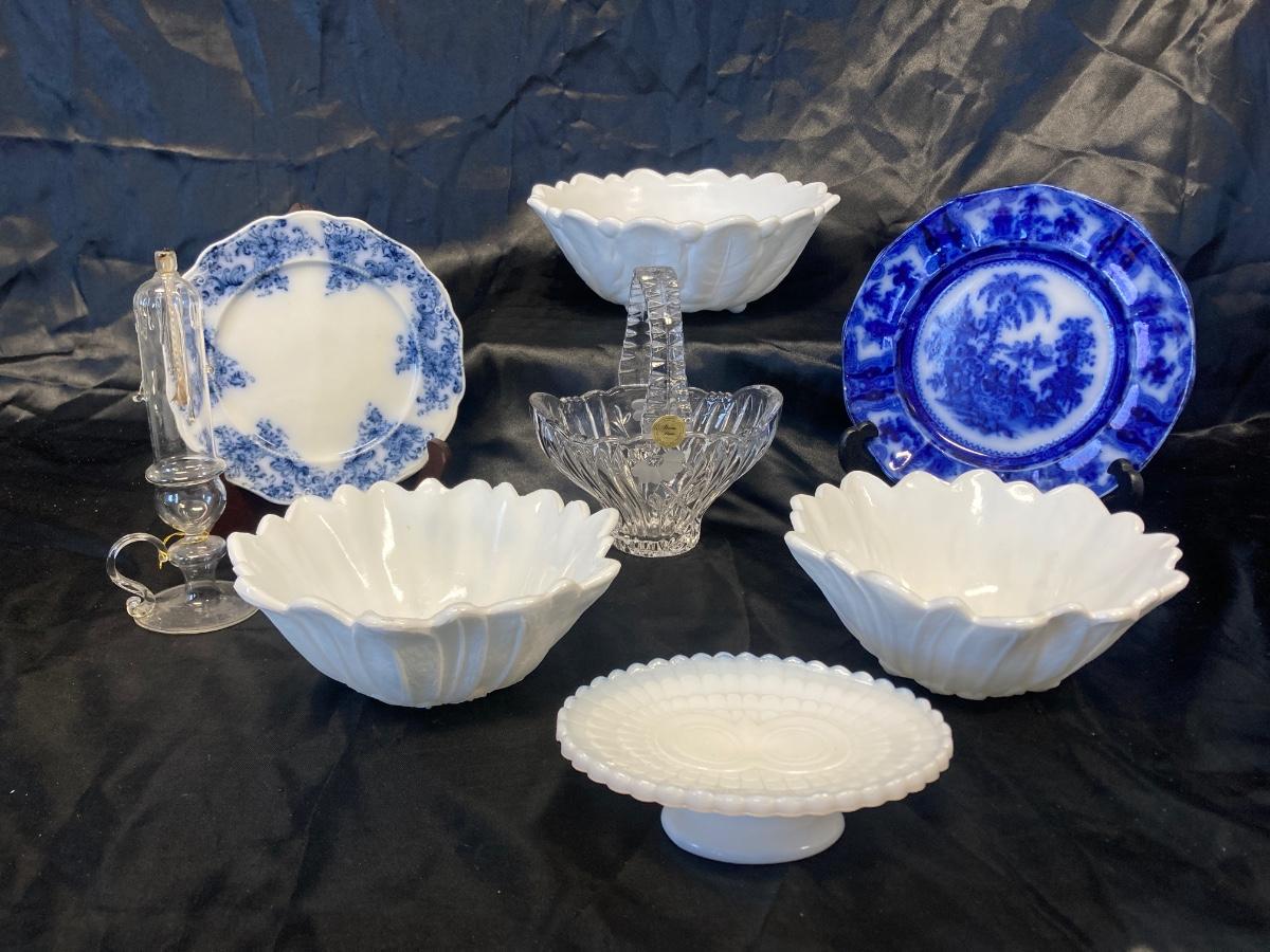 .PRINCESS HOUSE CRYSTAL BOWL, VINTAGE MILK GLASS FLOWER PETAL BOWLS, AVON OWL SOAP DISH, MADDOCK, JOHN & SONS BLUE LUNCHEON PLATE, IMPERIAL GLASS DISH, OIL CANDLE AND A W. ADAMS FLOW BLUE LUNCHEON PLATE