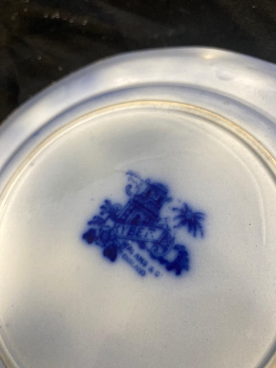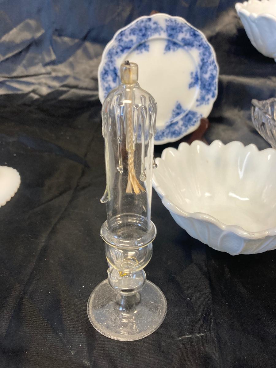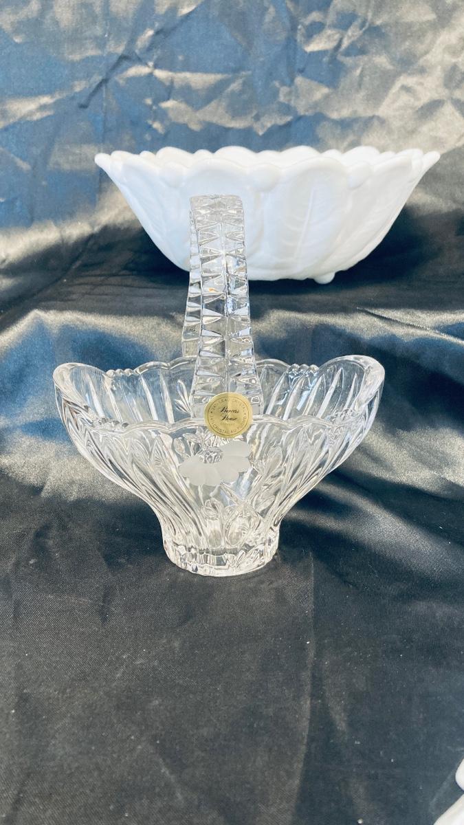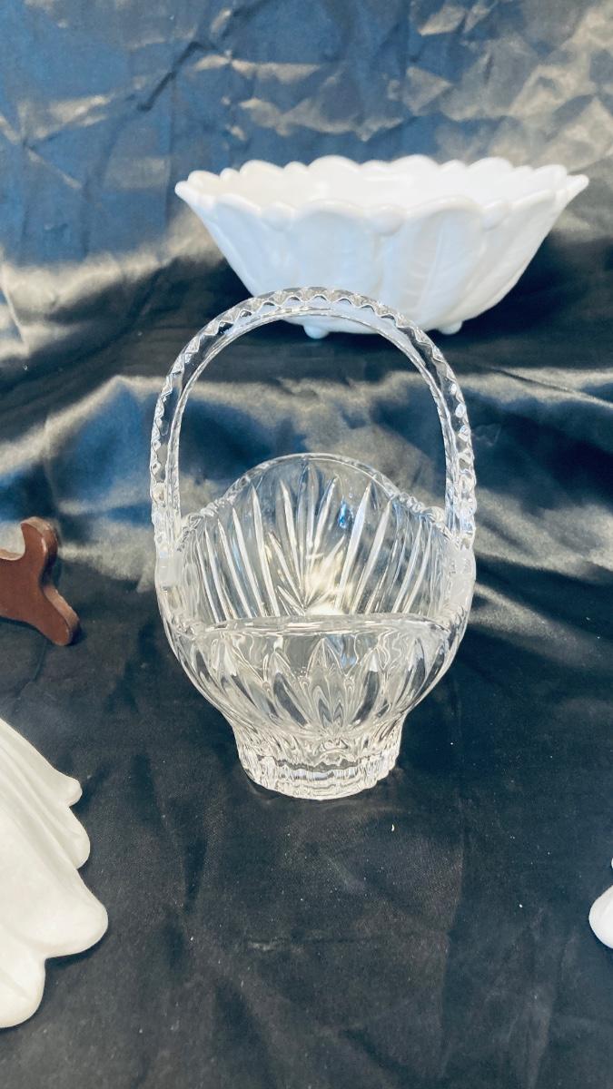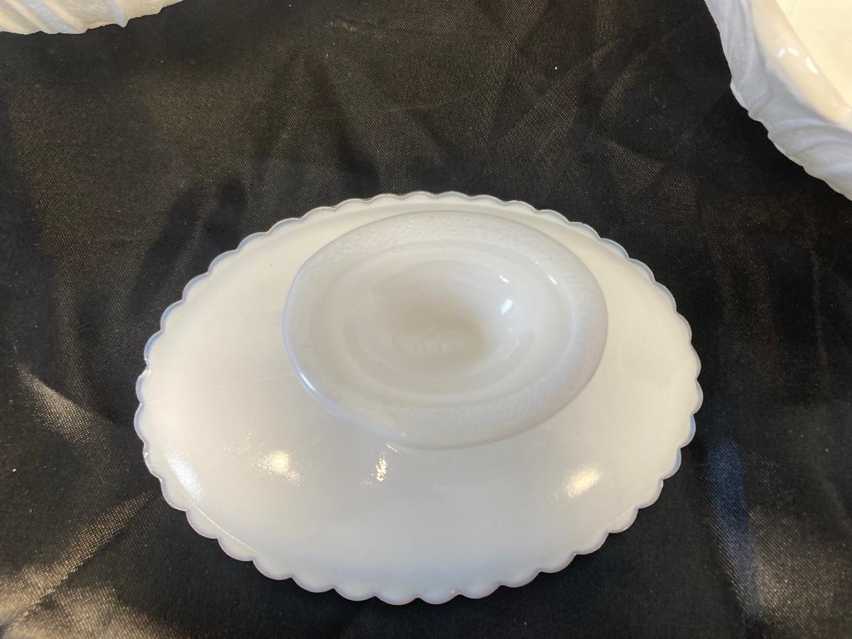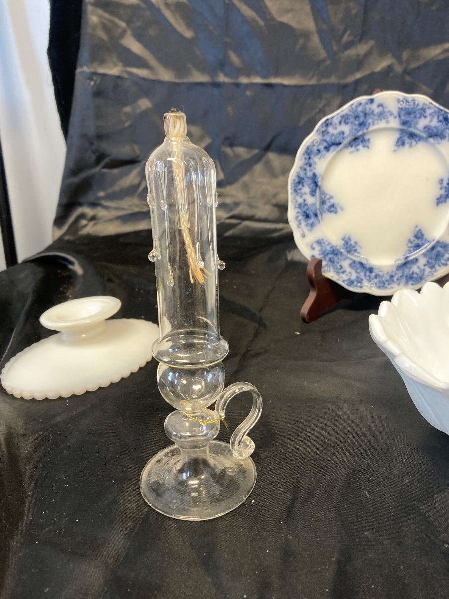 .PRINCESS HOUSE CRYSTAL BOWL, VINTAGE MILK GLASS FLOWER PETAL BOWLS, AVON OWL SOAP DISH, MADDOCK, JOHN & SONS BLUE LUNCHEON PLATE, IMPERIAL GLASS DISH, OIL CANDLE AND A W. ADAMS FLOW BLUE LUNCHEON PLATE