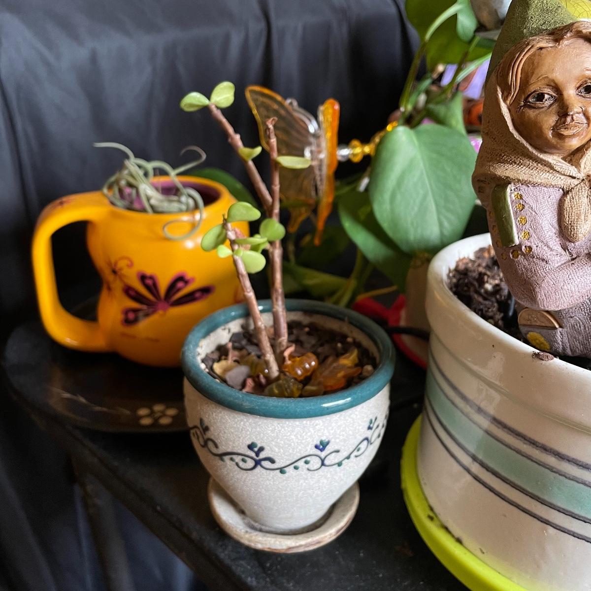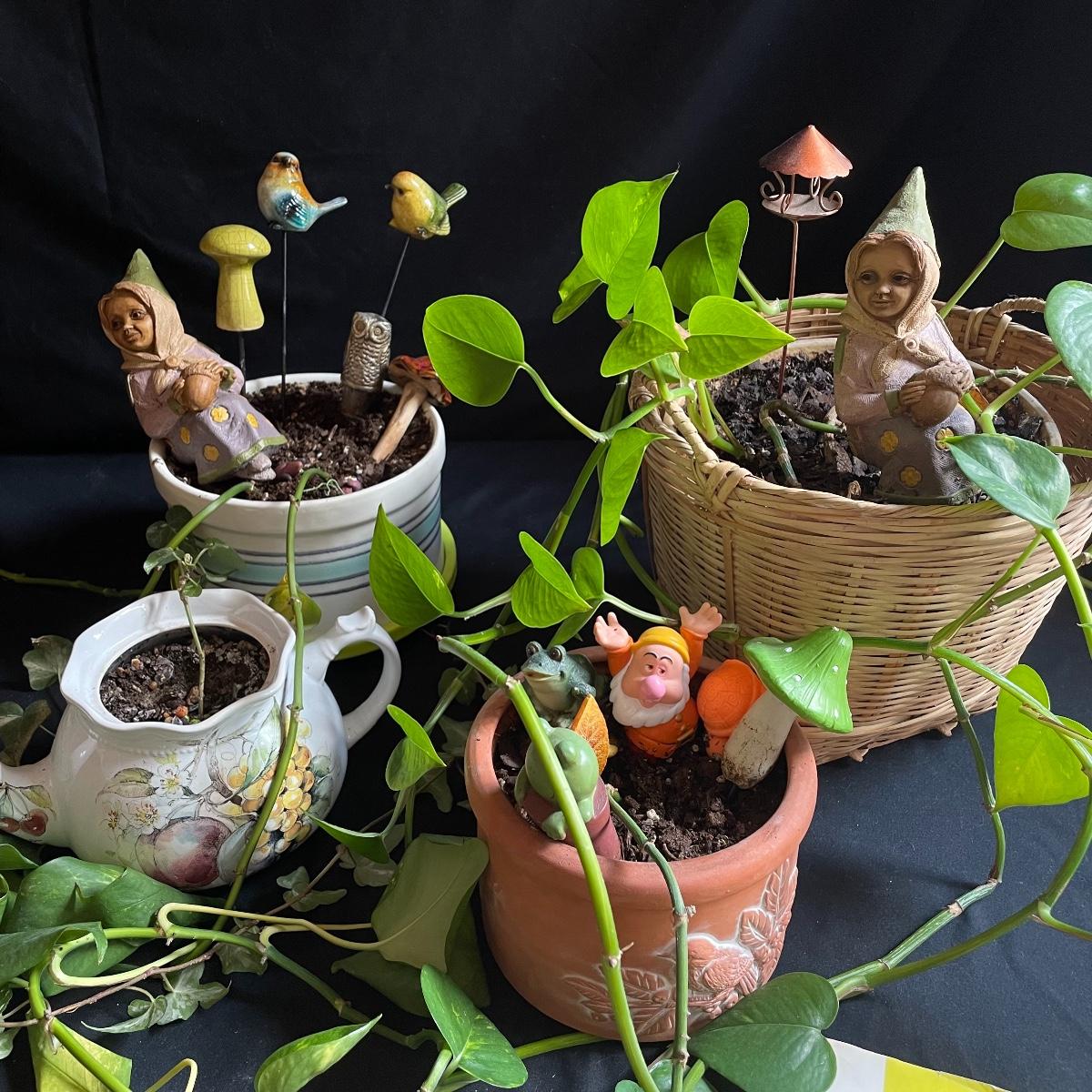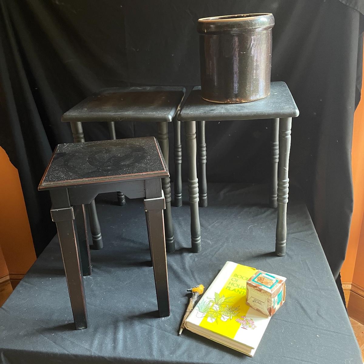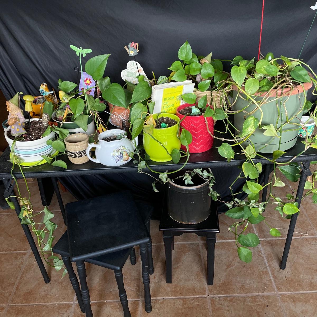 This lot includes money plants with some bamboo and English Ivy to add some life into your home or office. The collection contains so many pot keepers that are adorable and beautiful. There are also over sixteen planters and three black wooden plant stands. (The card table is not included.) The larger two are identical and measure 12” x 13” x 17”. Most planters are ceramic; the largest is 10” tall and is the only plastic planter in the lot. There is a beautiful dark pottery piece that has a few sizable cracks, but seems intact. The plants are a bit droopy, we have watered these plants after photographing, but we cannot guarantee condition at pick-up. See images. Local pick up only