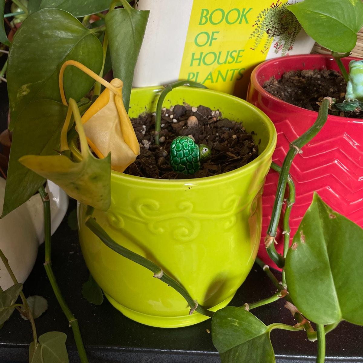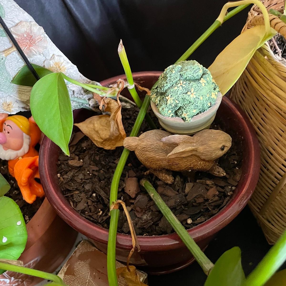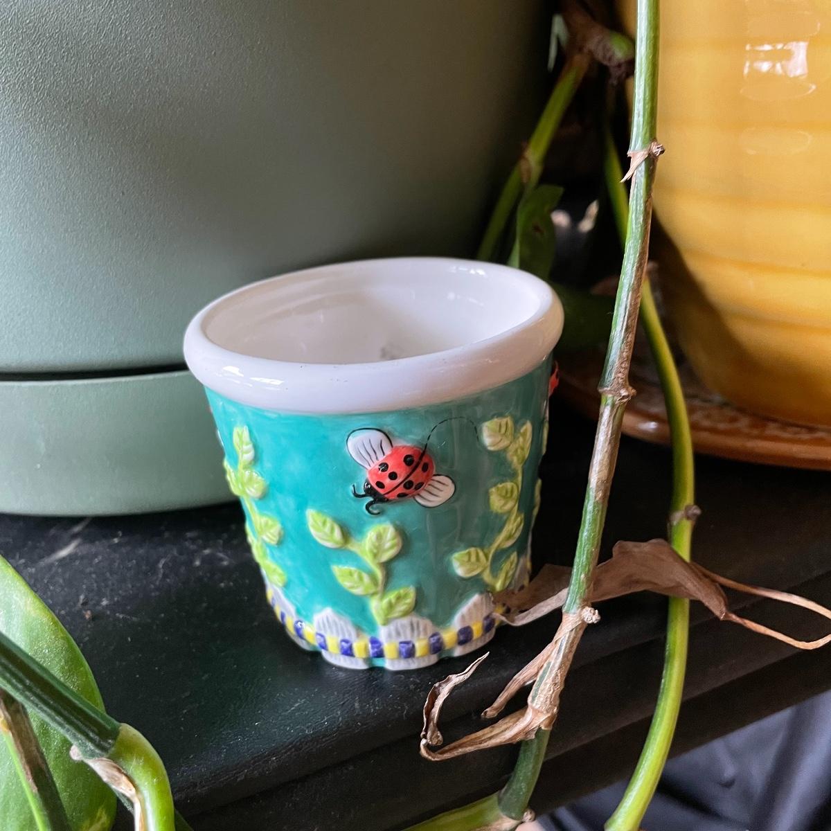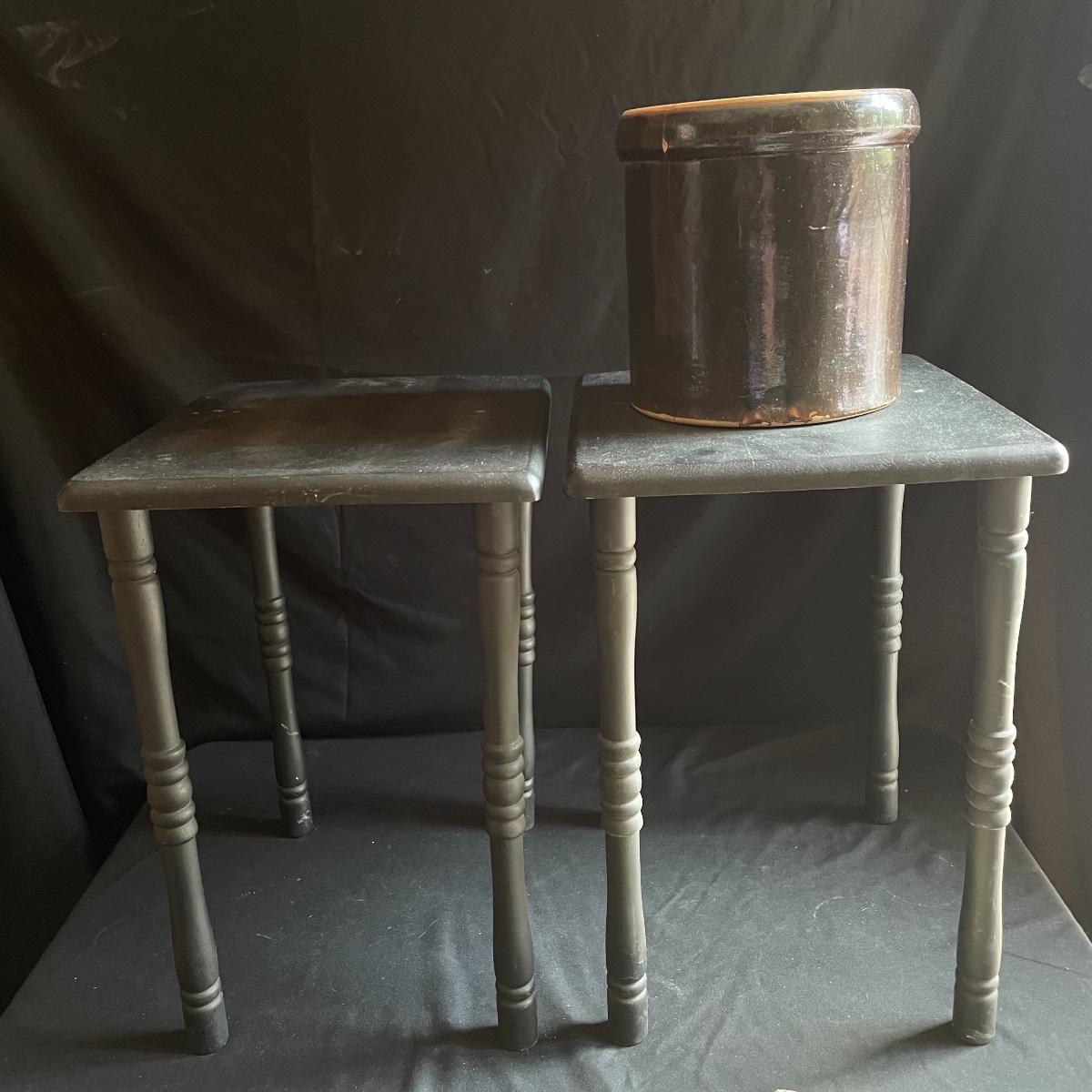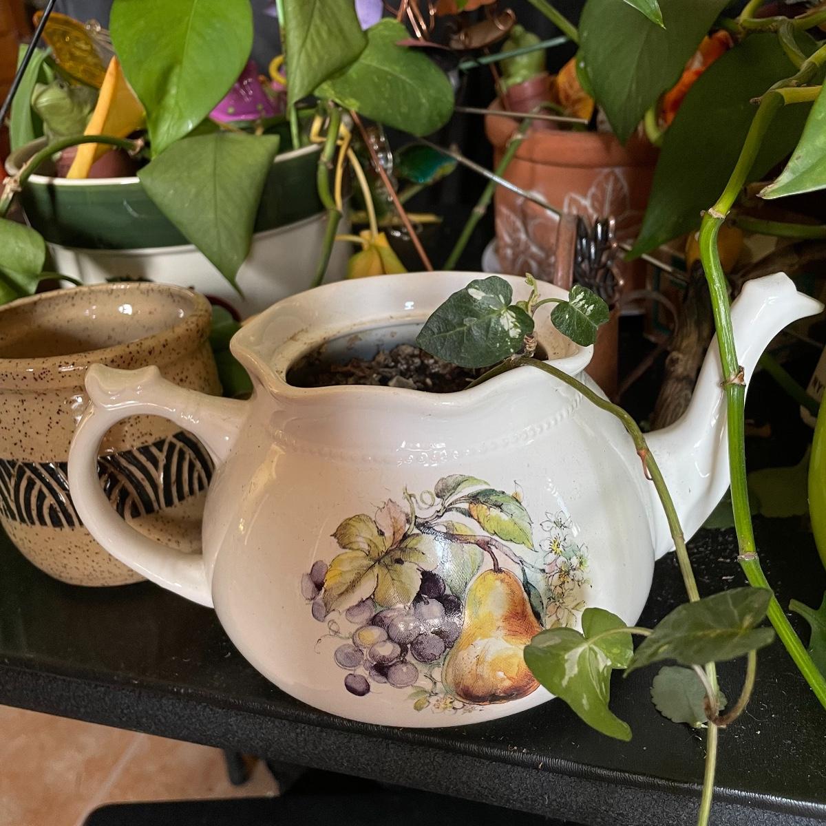 This lot includes money plants with some bamboo and English Ivy to add some life into your home or office. The collection contains so many pot keepers that are adorable and beautiful. There are also over sixteen planters and three black wooden plant stands. (The card table is not included.) The larger two are identical and measure 12” x 13” x 17”. Most planters are ceramic; the largest is 10” tall and is the only plastic planter in the lot. There is a beautiful dark pottery piece that has a few sizable cracks, but seems intact. The plants are a bit droopy, we have watered these plants after photographing, but we cannot guarantee condition at pick-up. See images. Local pick up only