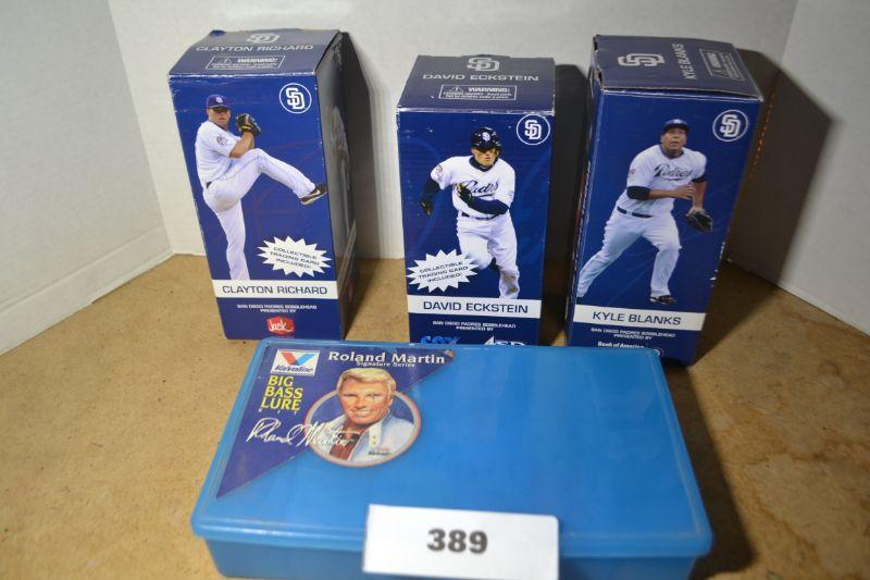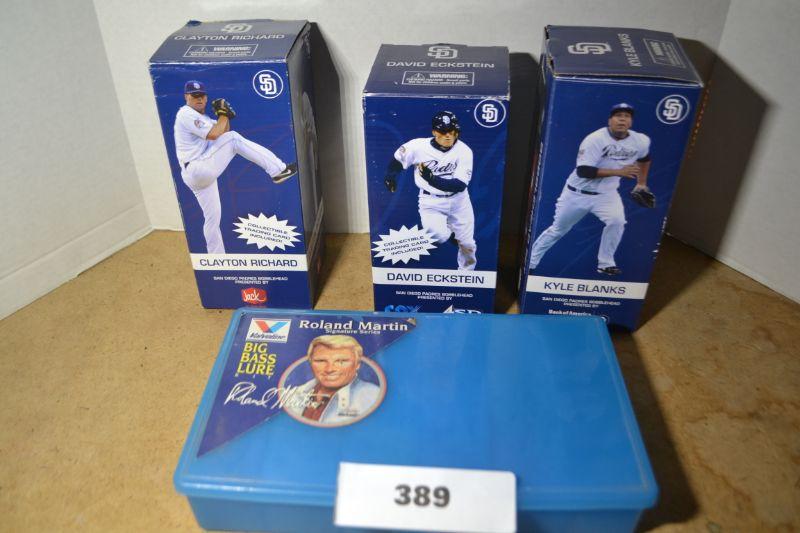 LOT 389 ROLAND MARTIN BIG BASS LURE KIT AMD 3 PADRES BOBBLE HEADS