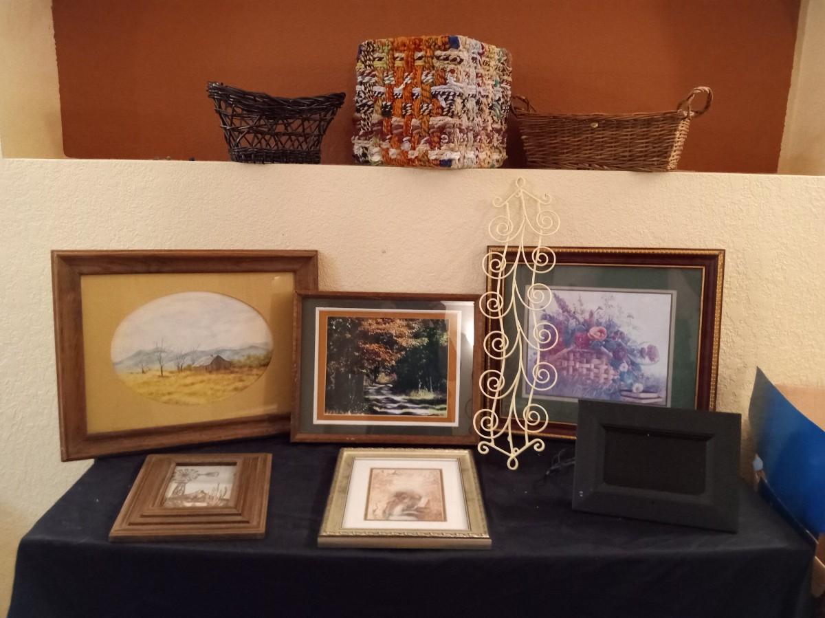 LOT 389 FRAMED PICTURES, 7" DIGITAL FRAME AND BASKETS (HD)
