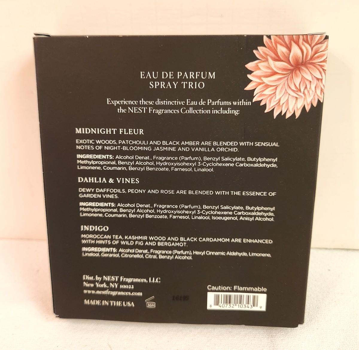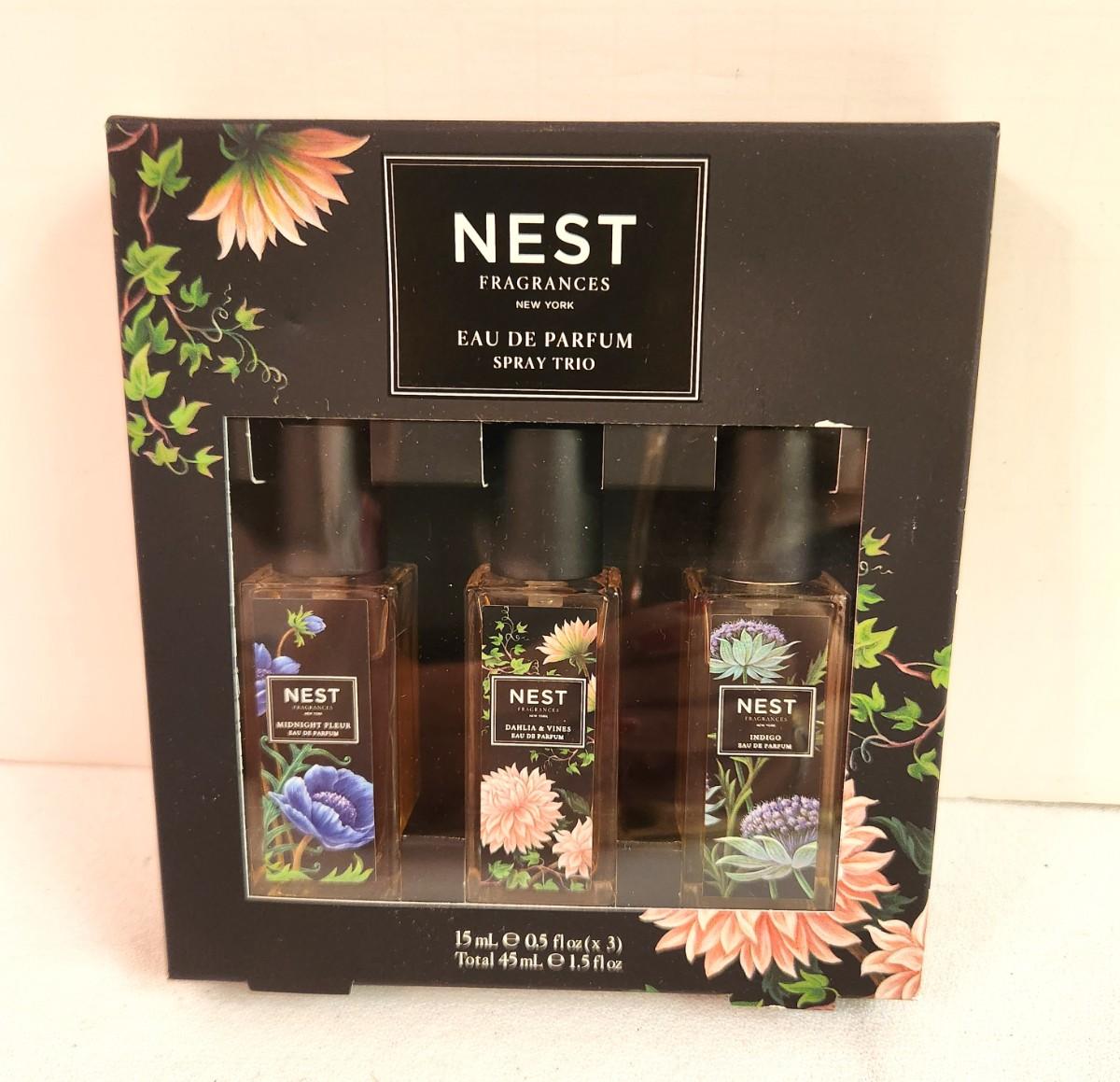 In this NEST collection, you get the Spring Trio - Each 1.5 oz - Indigo - Midnight Fleur - Dahlia & Wood. New and unopened.