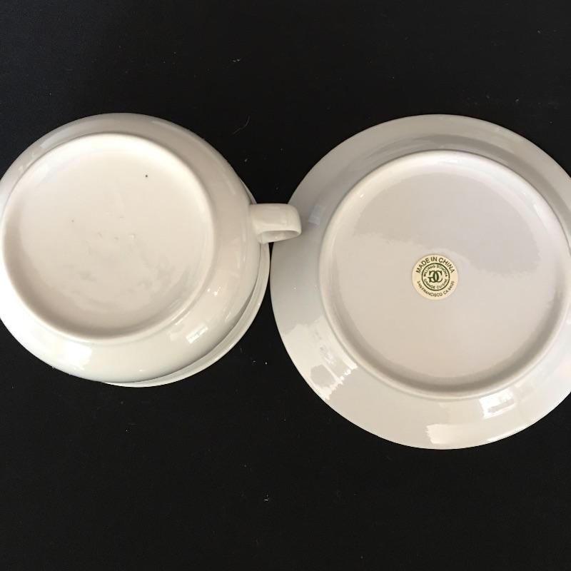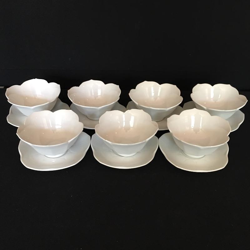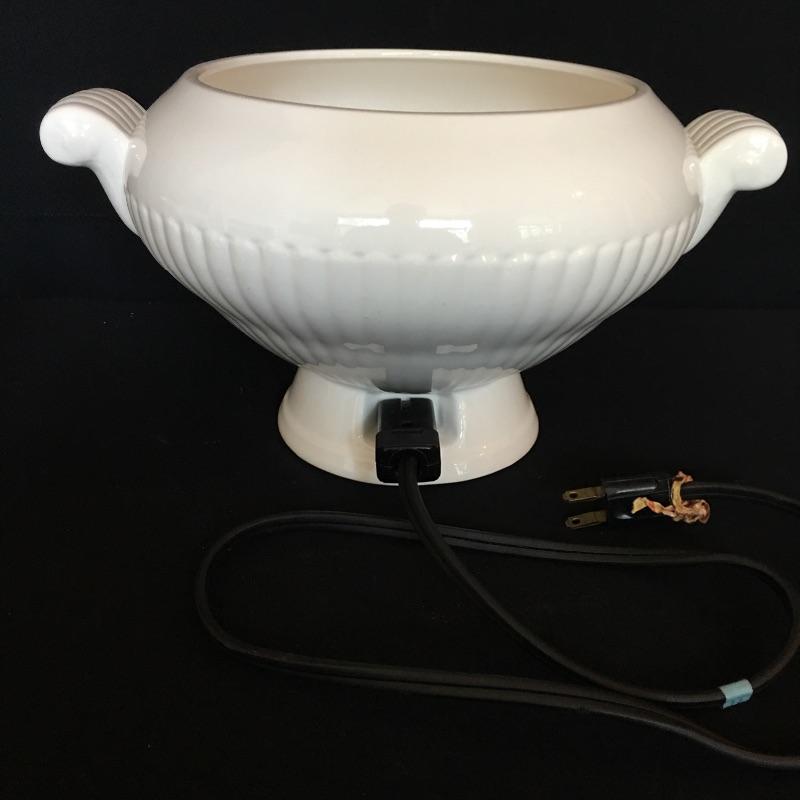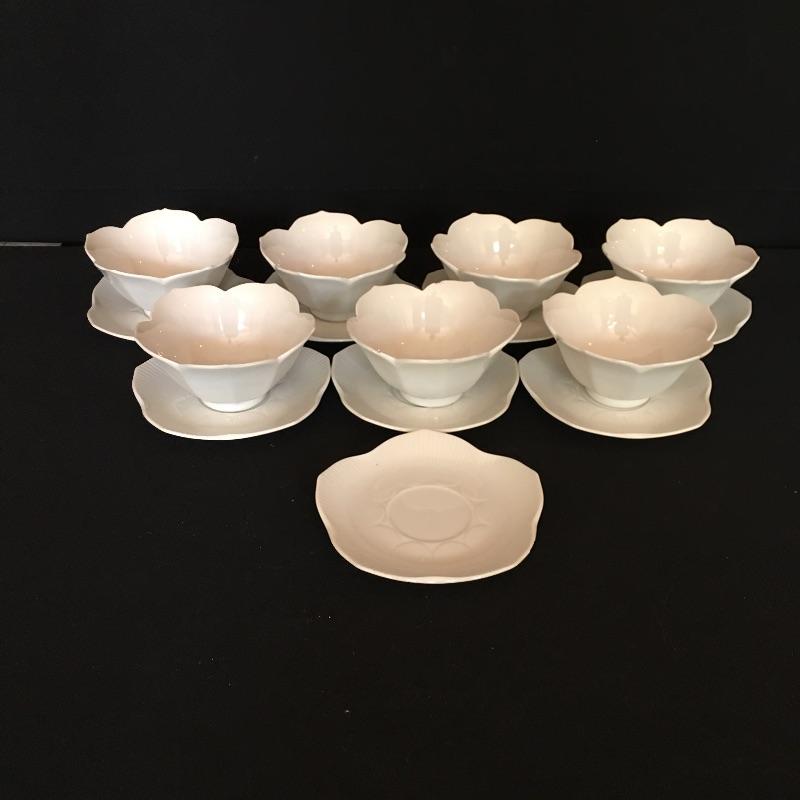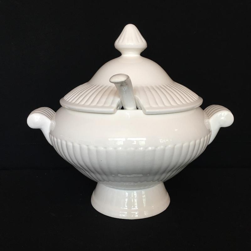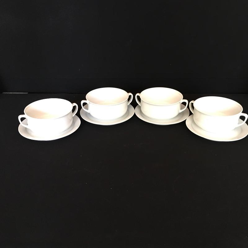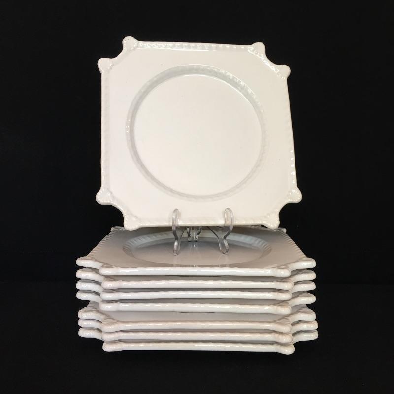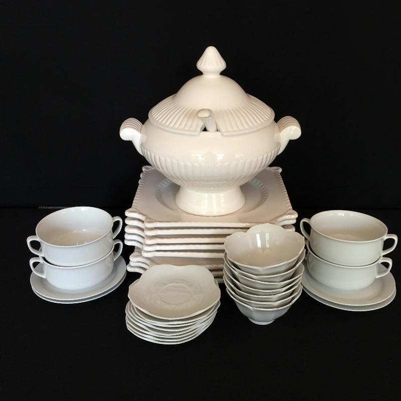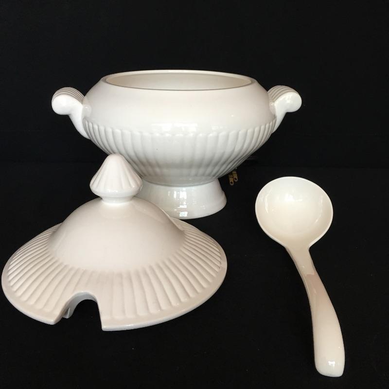 Crisp array of white dishes including electric Japanese turrine, eight large plates, four soup bowls, four small plates, seven bowls and eight small plates. Largest plates measure 10.75” x 10.75”.