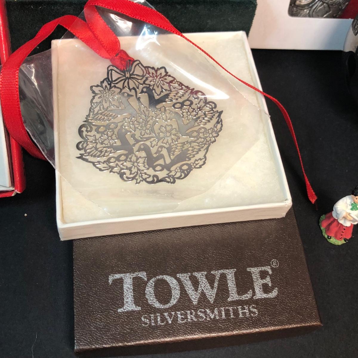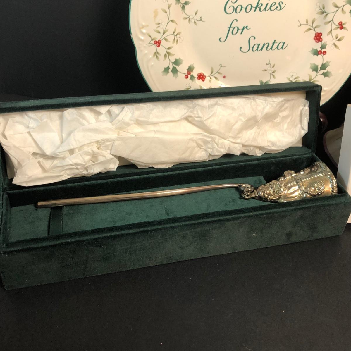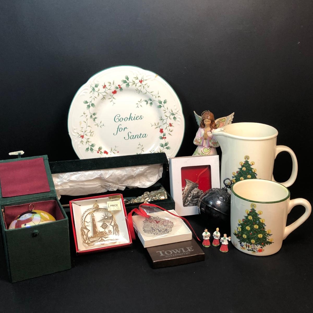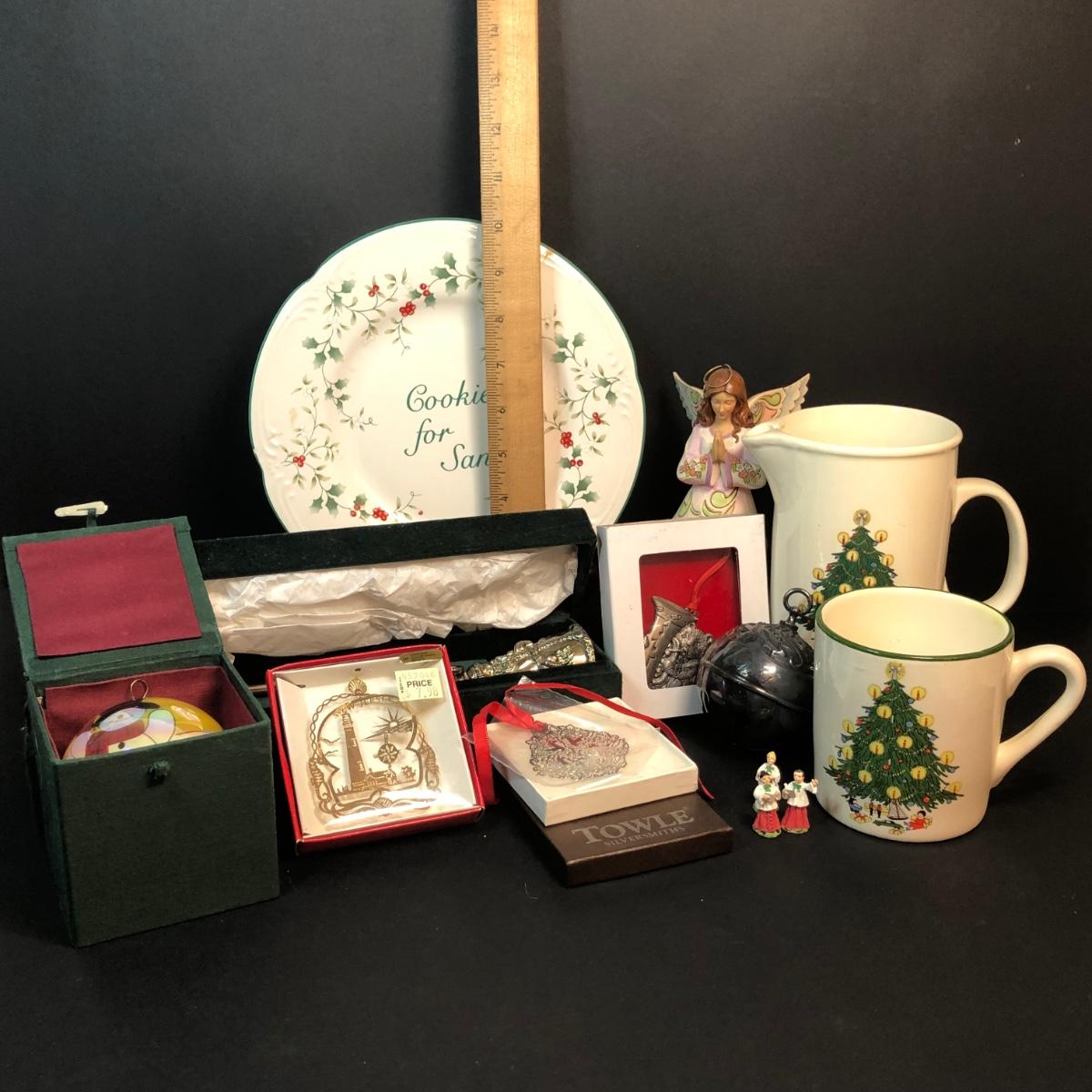 LOT 389M: Christmas Decor Collection - Jim Shore Angel, Stengl Pottery, Pfaltzgraff Plate, Towle Ornament, Reed & Barton Holy Bell, Godinger Candle Snuffer, Hand Painted Bulb & More