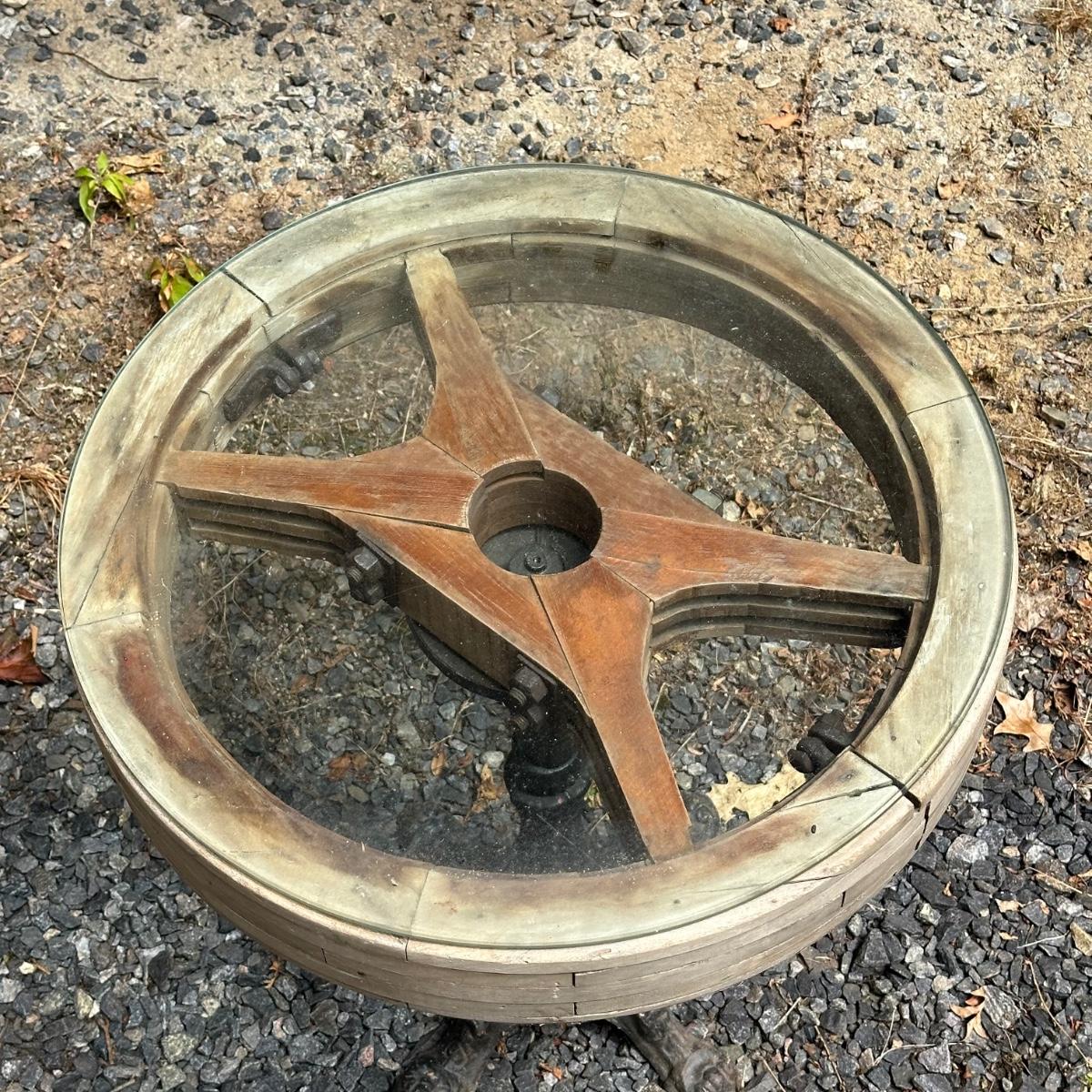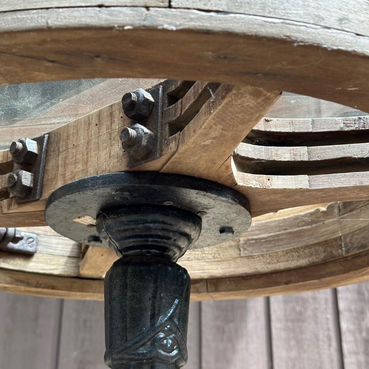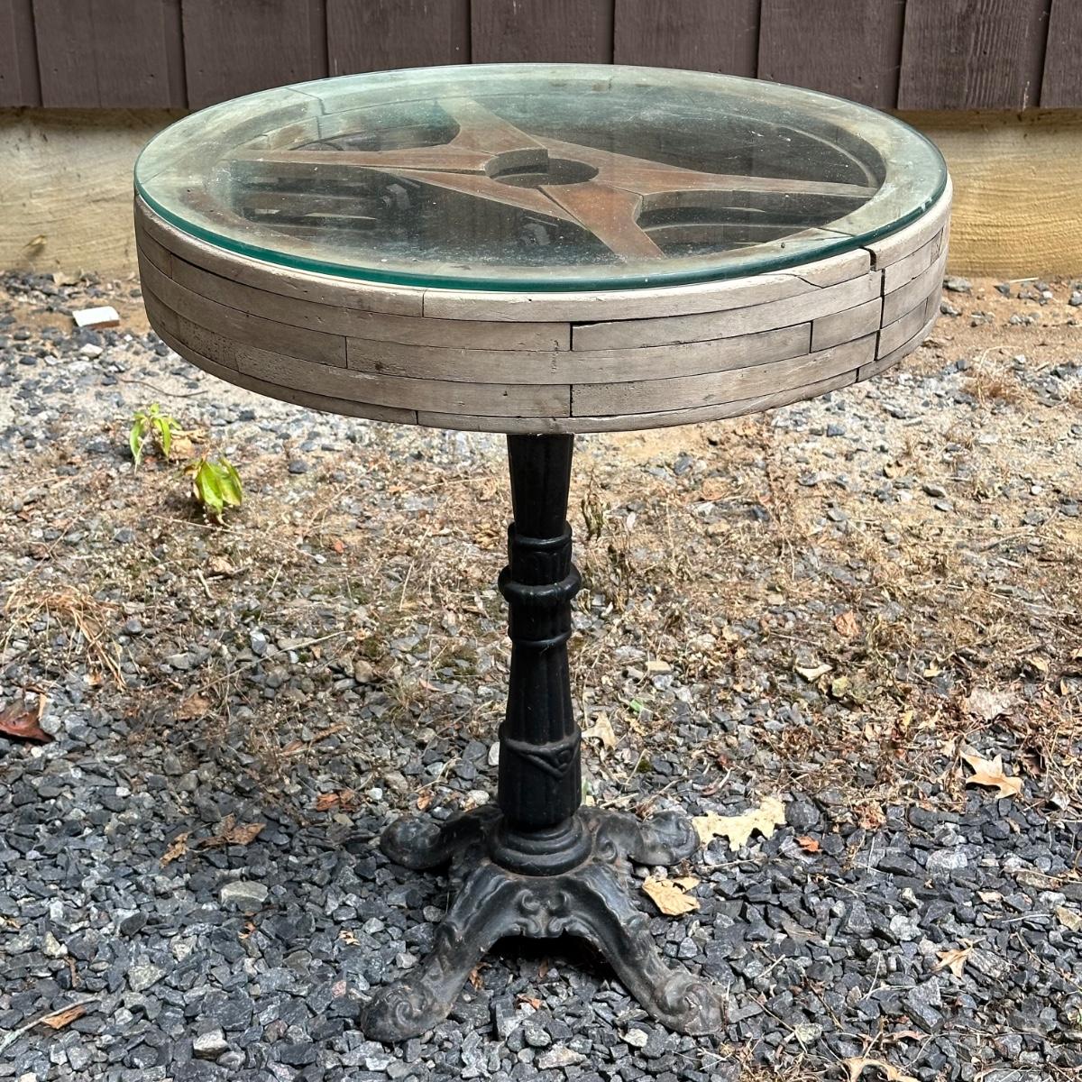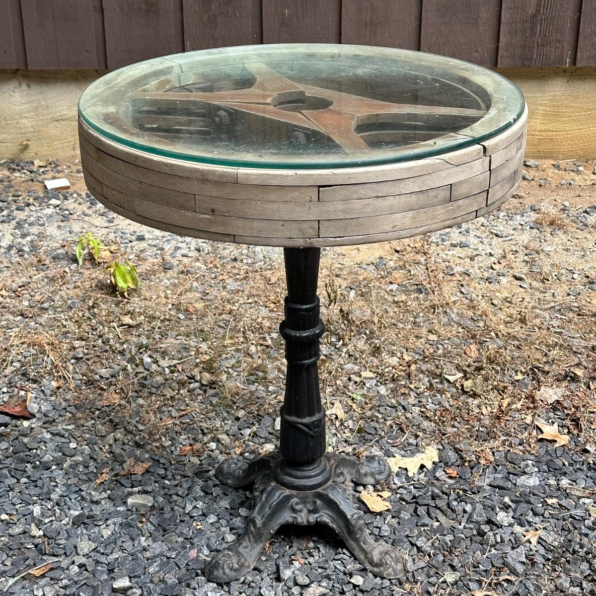 LOT 38G: Antique Belt Pulley & Beam Glass Top Table with cast iron base