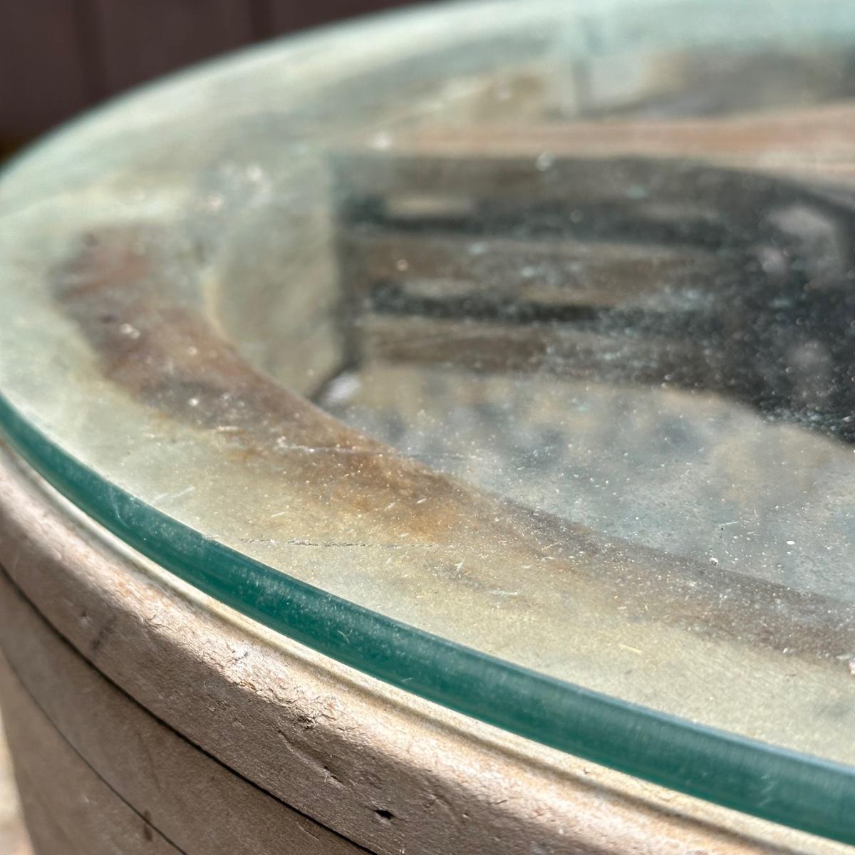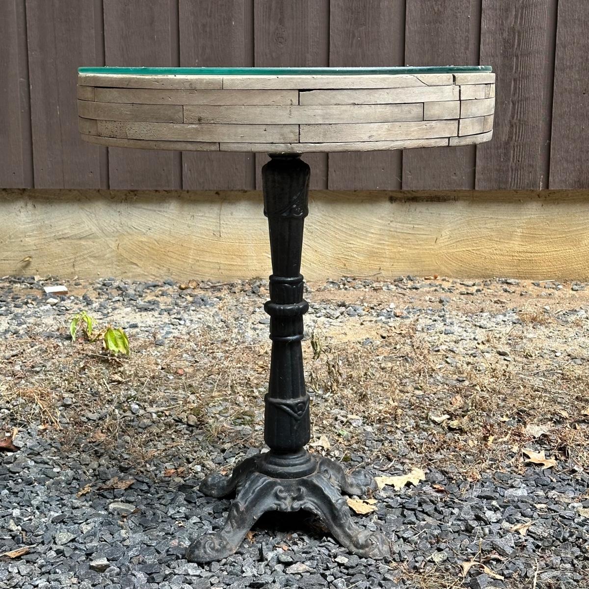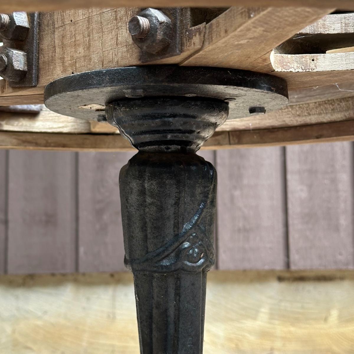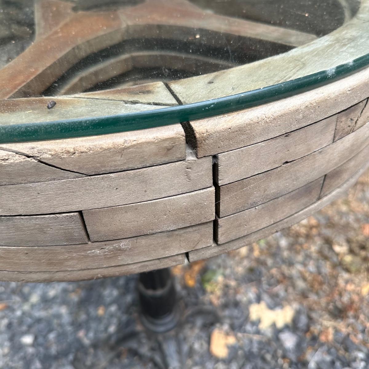 LOT 38G: Antique Belt Pulley & Beam Glass Top Table with cast iron base