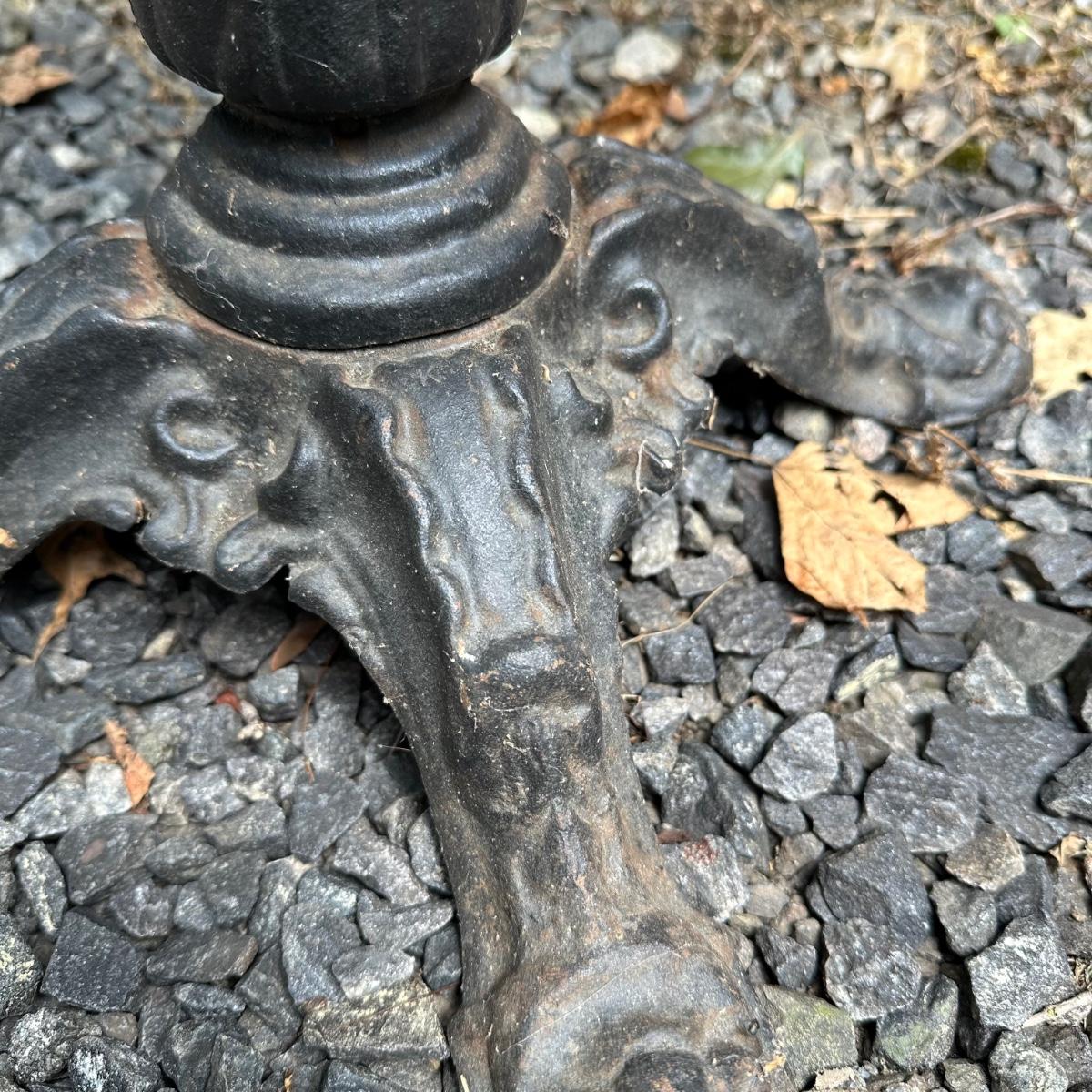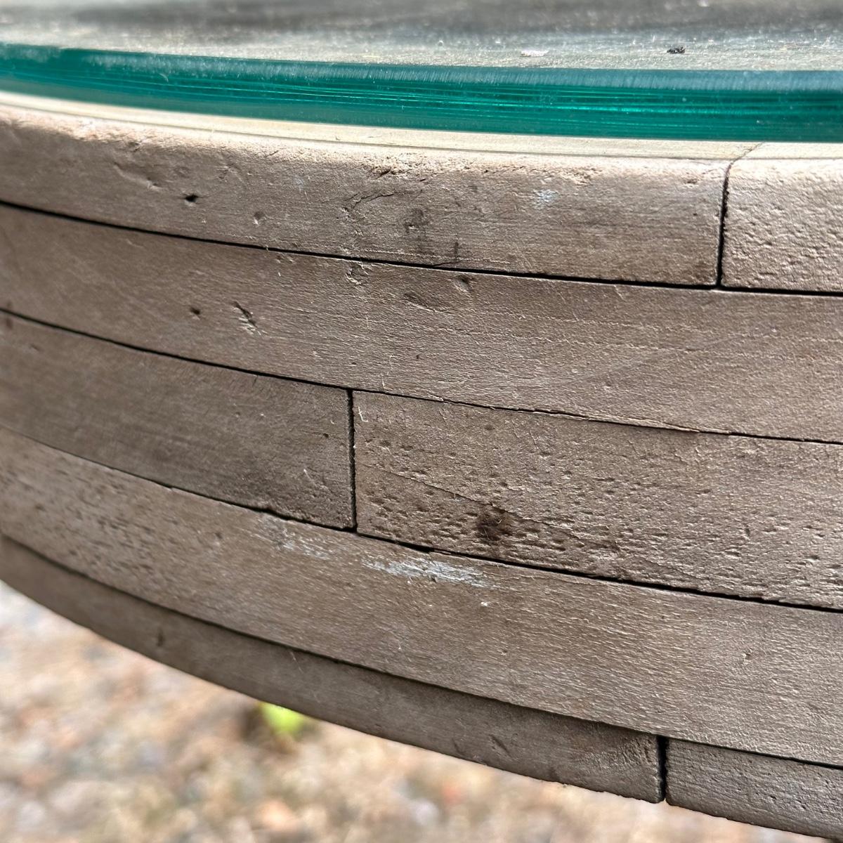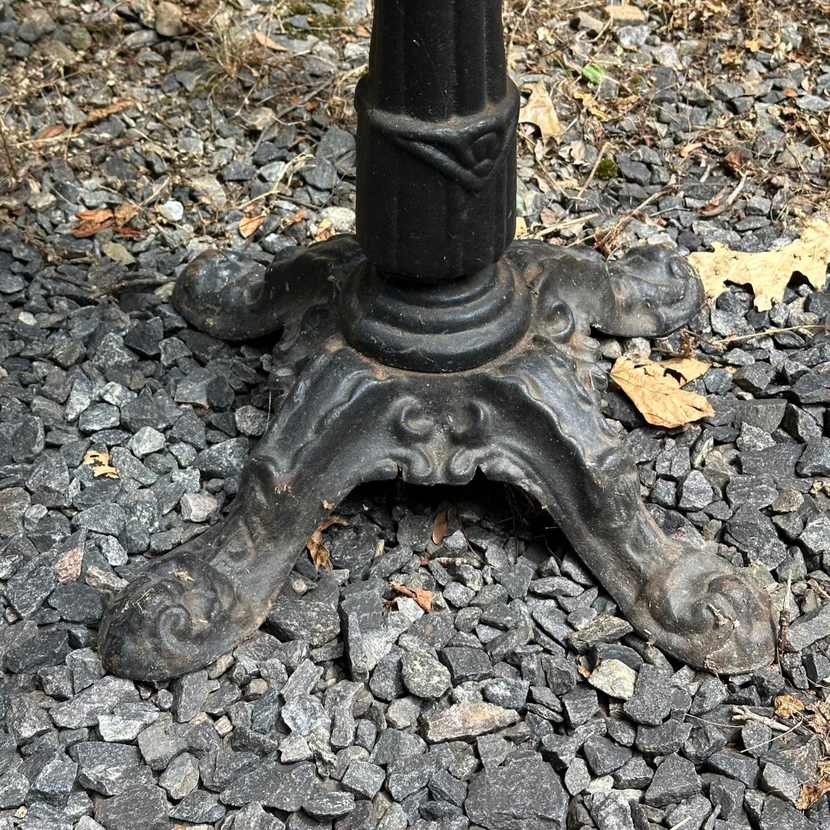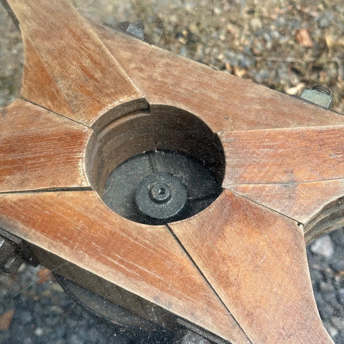 LOT 38G: Antique Belt Pulley & Beam Glass Top Table with cast iron base