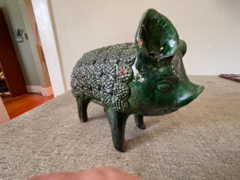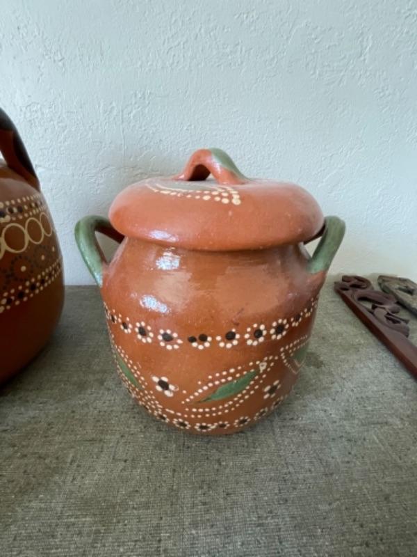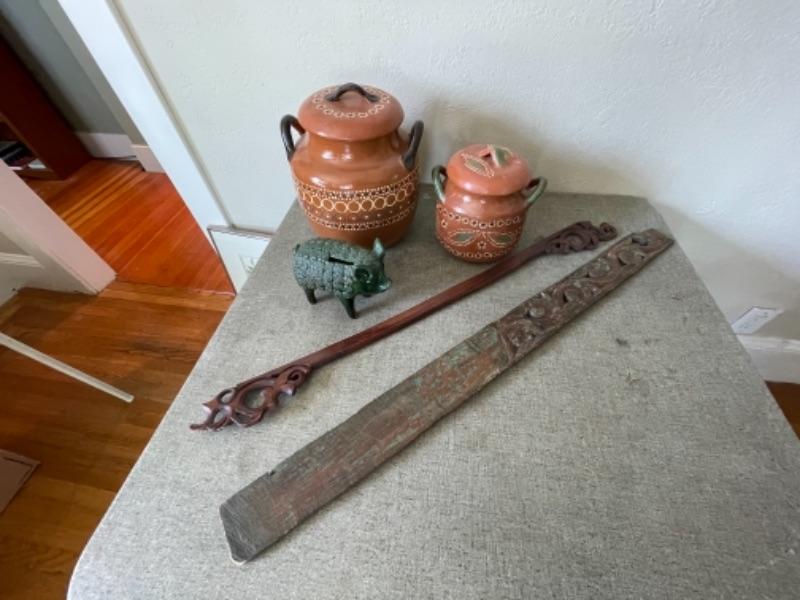 Lot 38LD. Tlaquepaque redware pottery, wooden wall décor, ceramic pig--$125