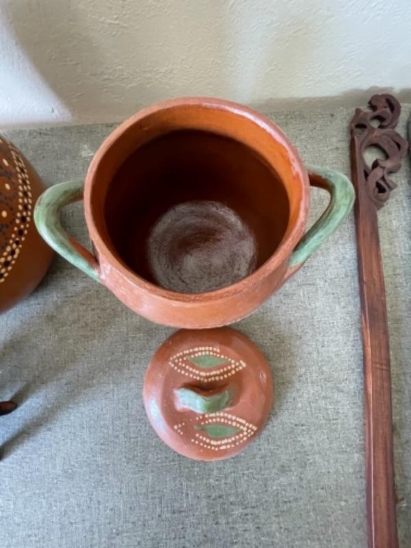 Lot 38LD. Tlaquepaque redware pottery, wooden wall décor, ceramic pig--$75