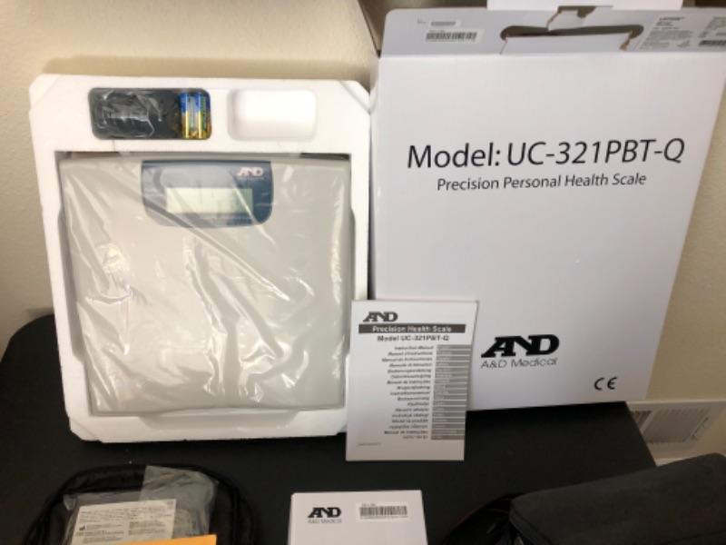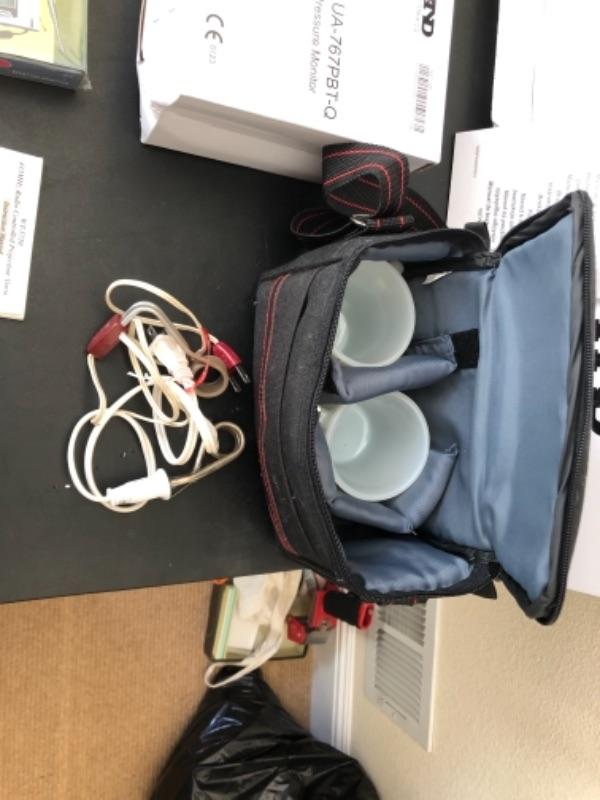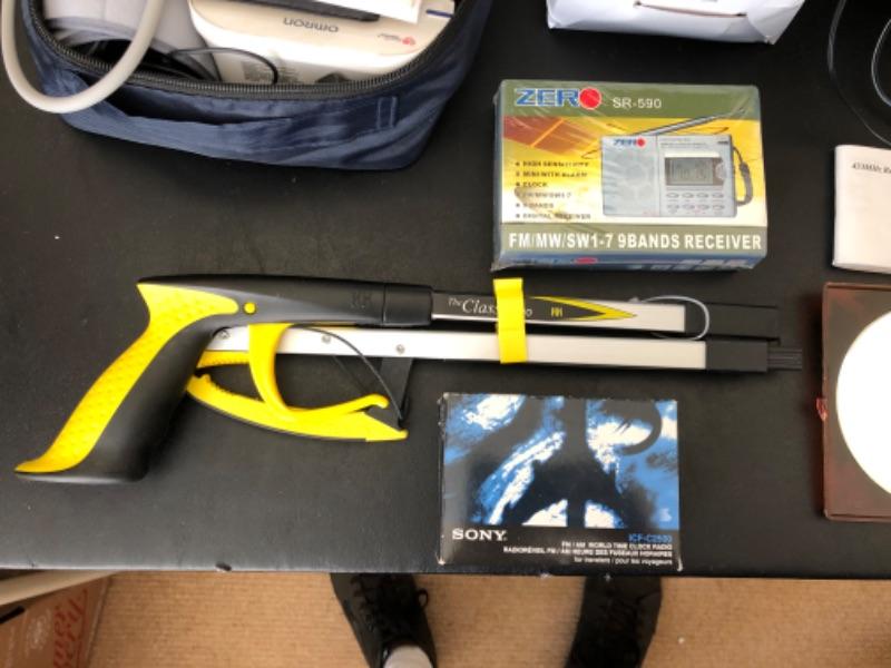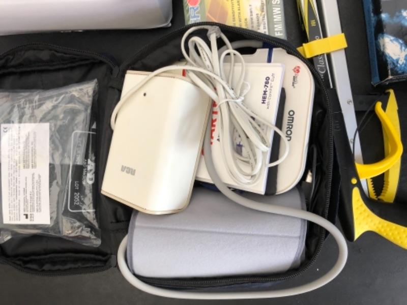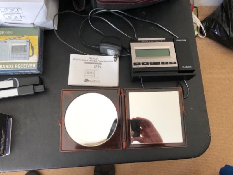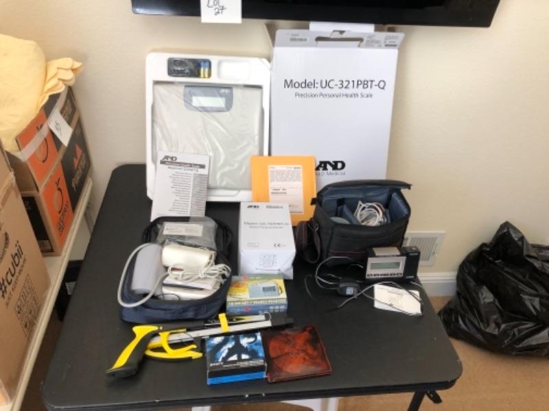 Lot 38U. Travel and Health accessories“”mugs and heater, 2 blood pressure monitors (new), travel clocks, scale, mirror foldable grabber, new scale, LaCross alarm clock and projector--$60