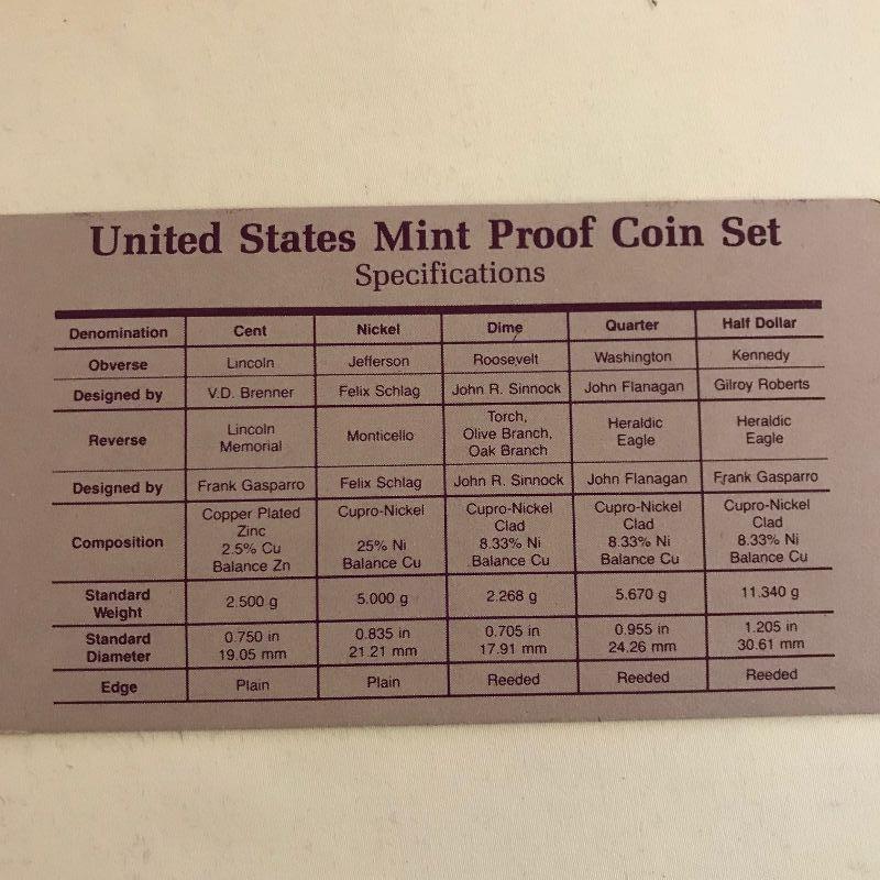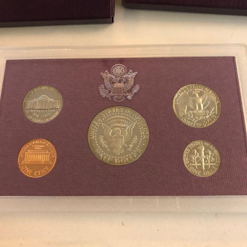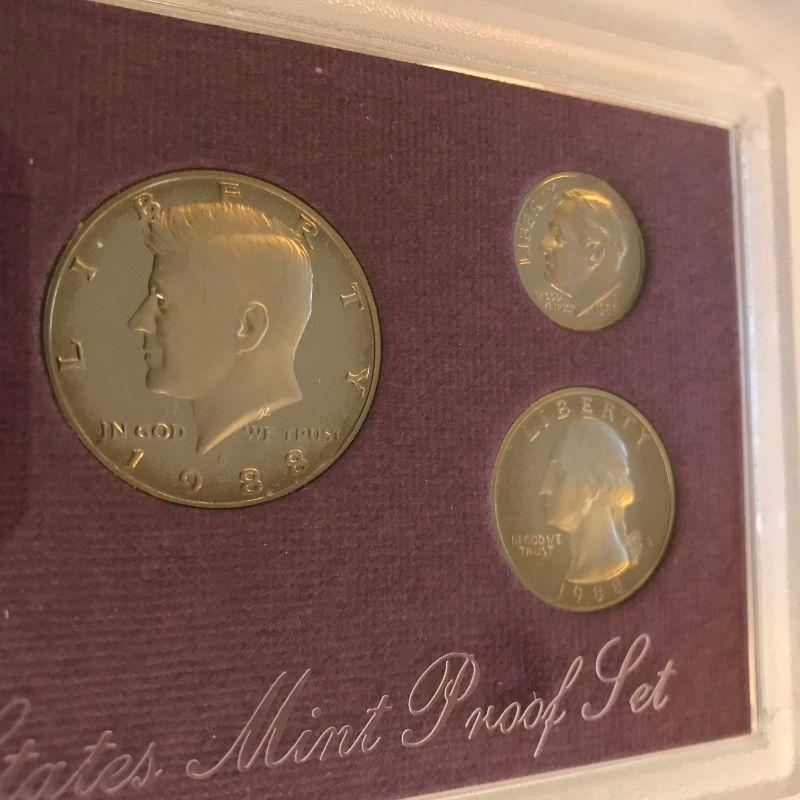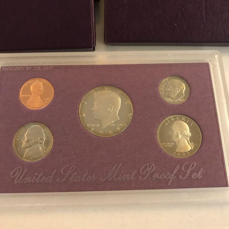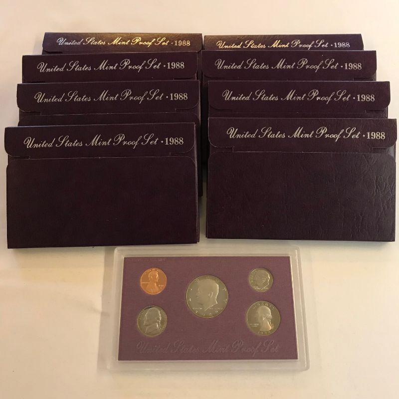 Nine 1988 Proof Sets. One set is missing it’s purple box. Some coins appear to have a darker outer rim, see photos.
