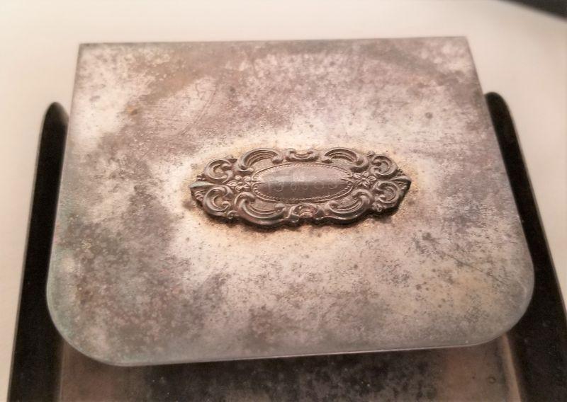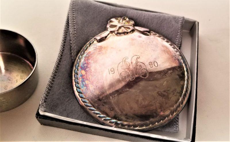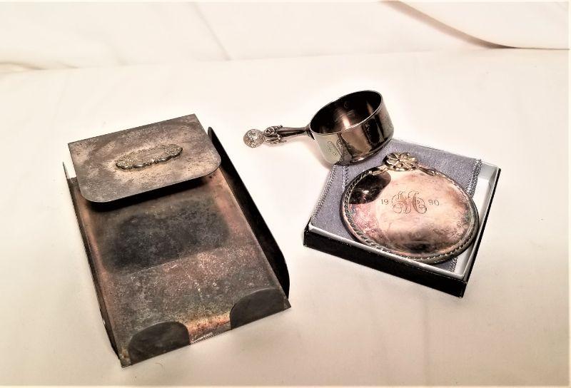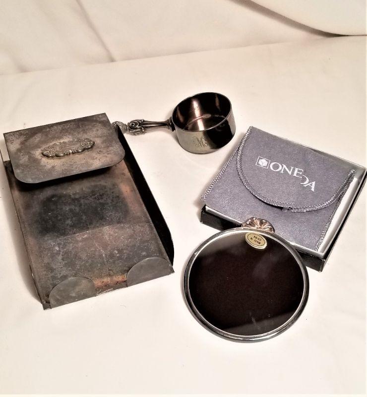 Three silverplate Mystery krewe favors here: 1983 Noteholder, 1985 coffee scoop, and 1990 purse mirror. MIrror in original box. All need a polish.