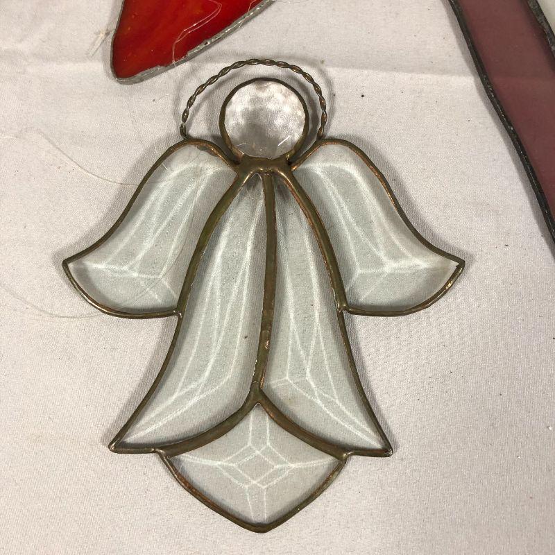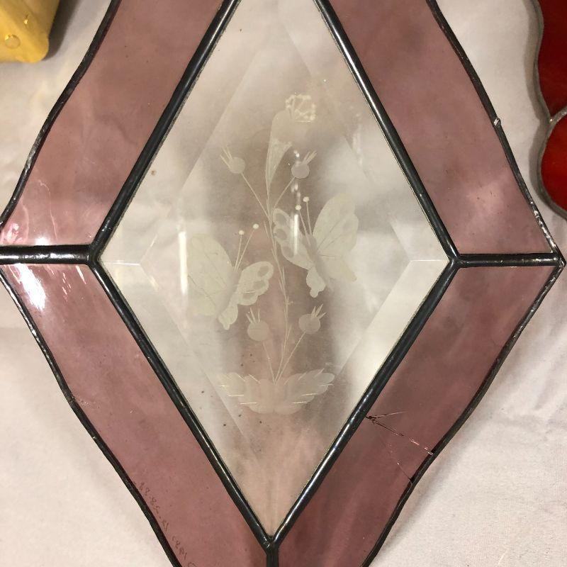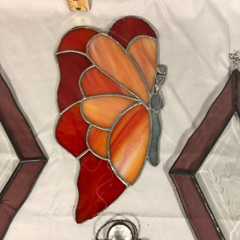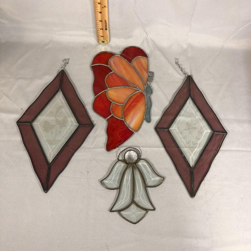 Three of these are butterfly themed and the fourth is an angel. The butterfly is about 11" long, the diamond shaped suncatchers are about 11.5" long, and the angel is about 6". All are in excellent condition.