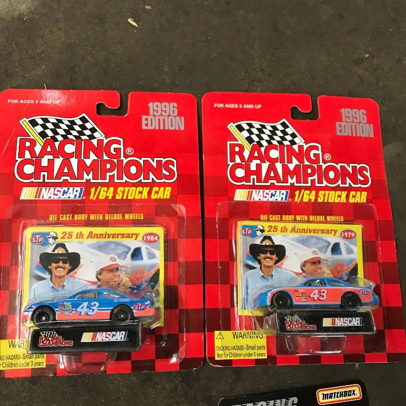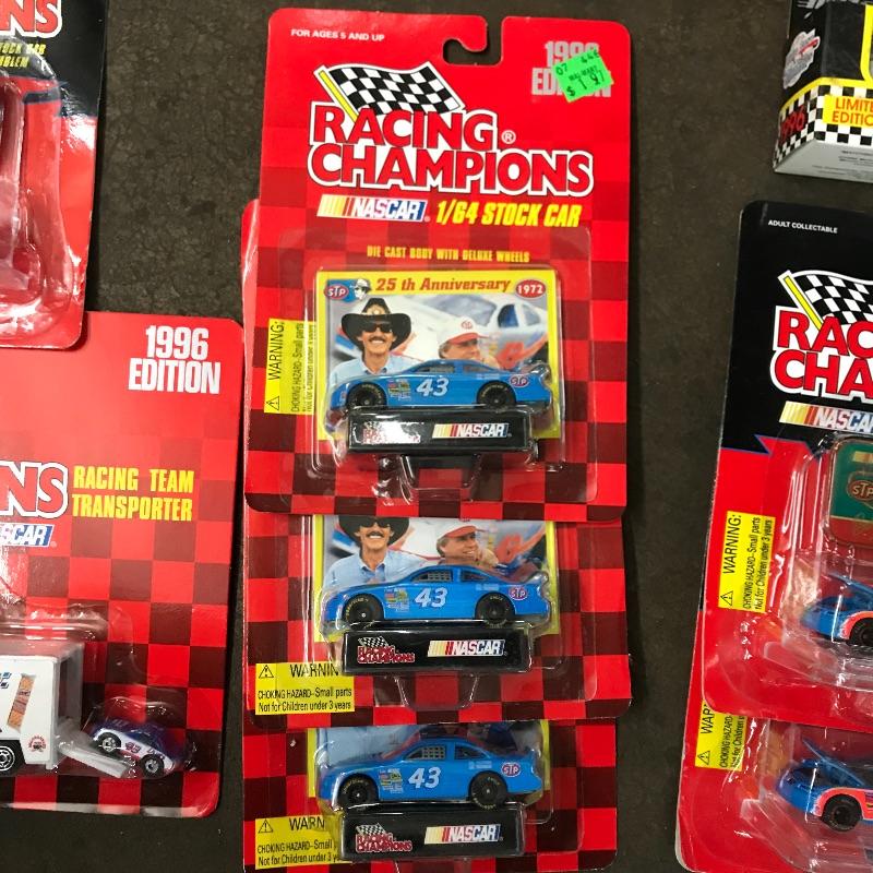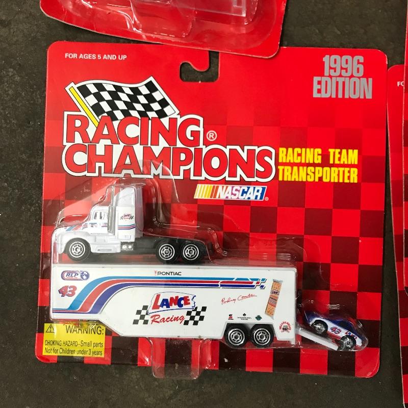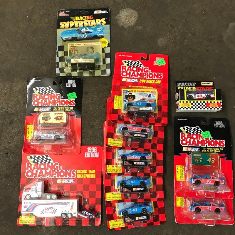 Ten collectible cars with a Race Team Transporter. All cars by Racing Champions except one Matchbox. Most cars are #43 with one #40. Drivers include Bobby Hamilton, Rodney Combs (Matchbox car and Transporter), and lastly the #40 car driver is Pete Hamilton. See photos. Winning bidder may ship this lot, please contact Sterling Transitions by phone after receiving winning bid email if you would like items shipped.