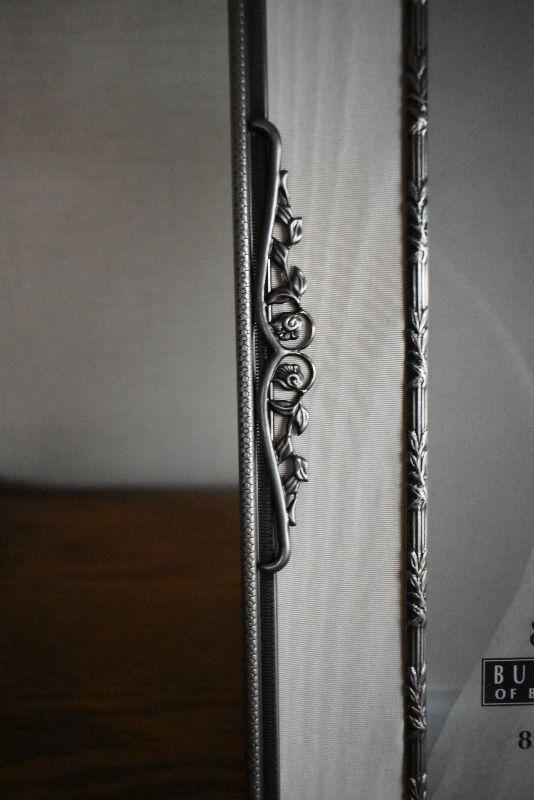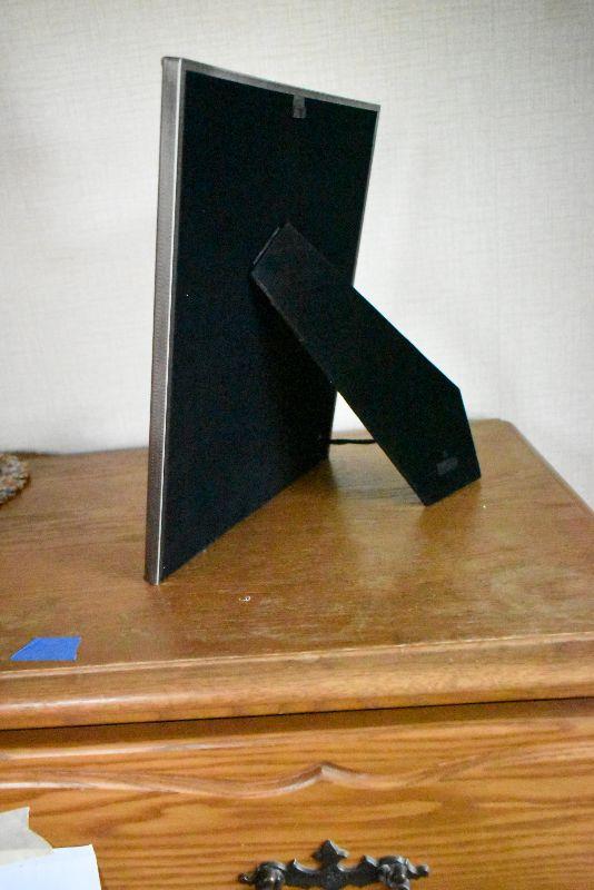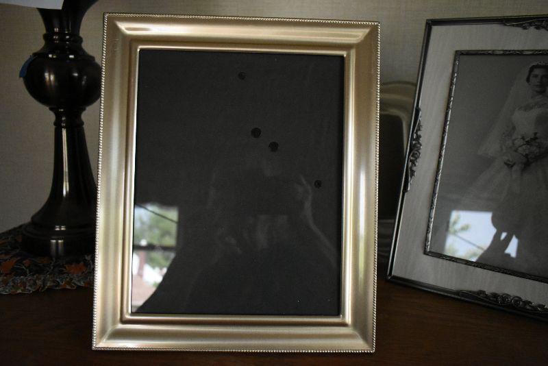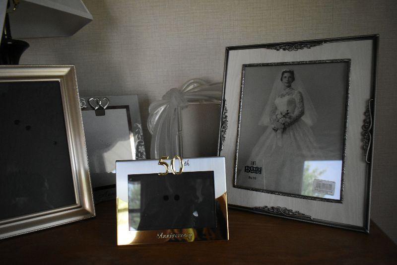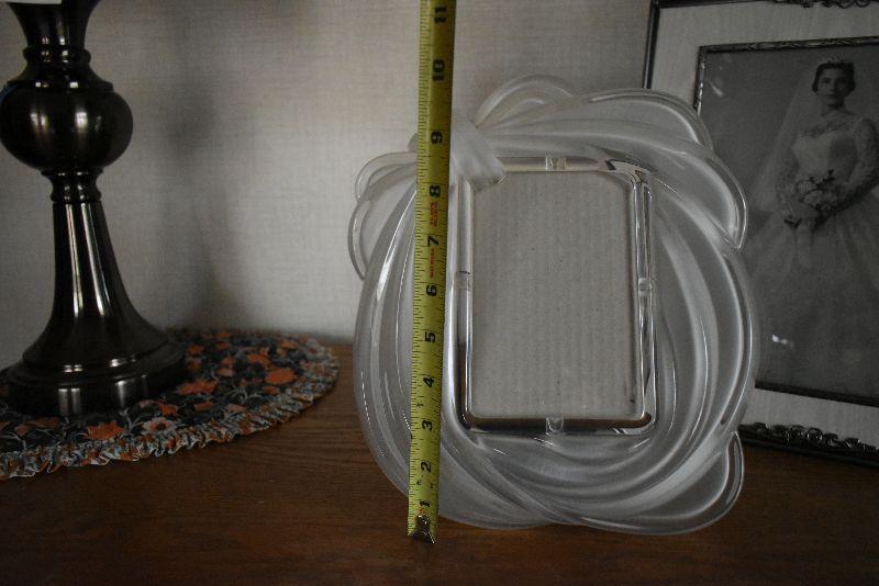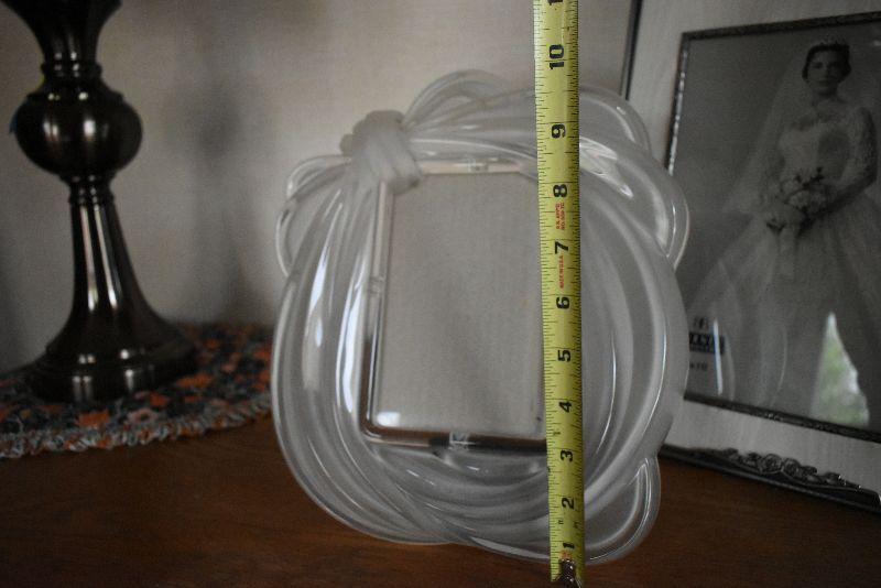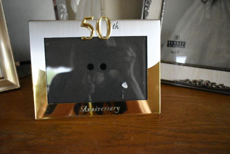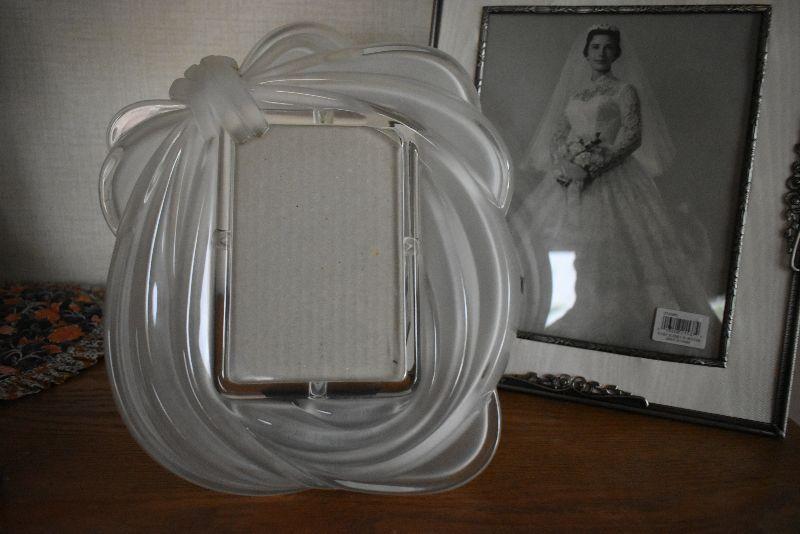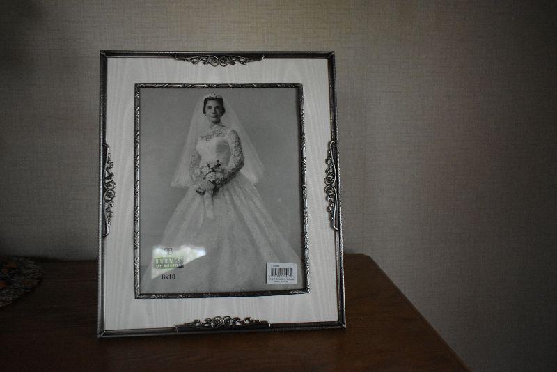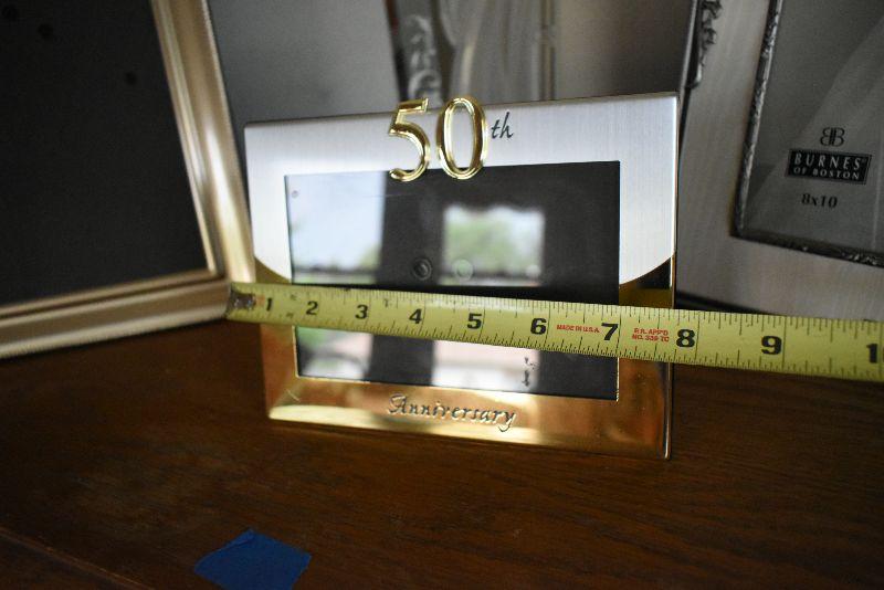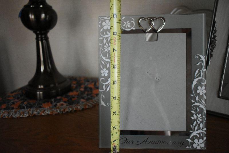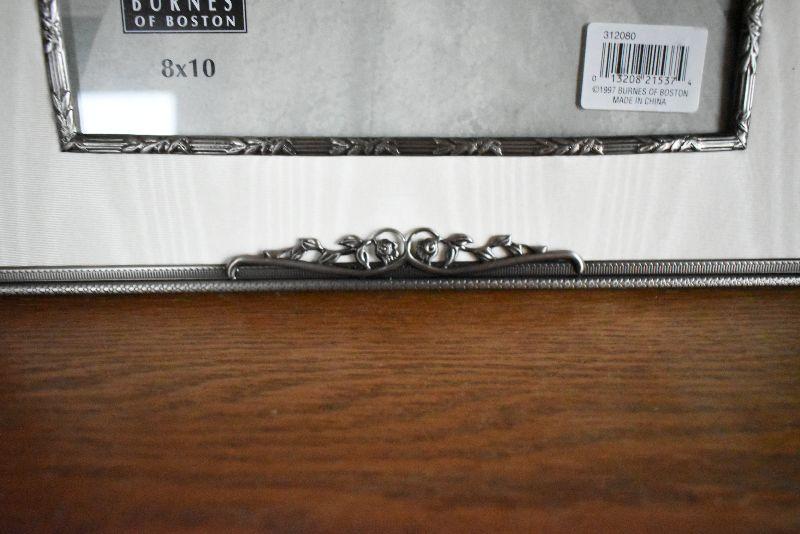Metal anniversary frame, glass frame with hearts, swirled, frosted glass frame, a metal Burns of Boston frame with scroll work and flowers, new in box.and an 8x10 silver toned frame.