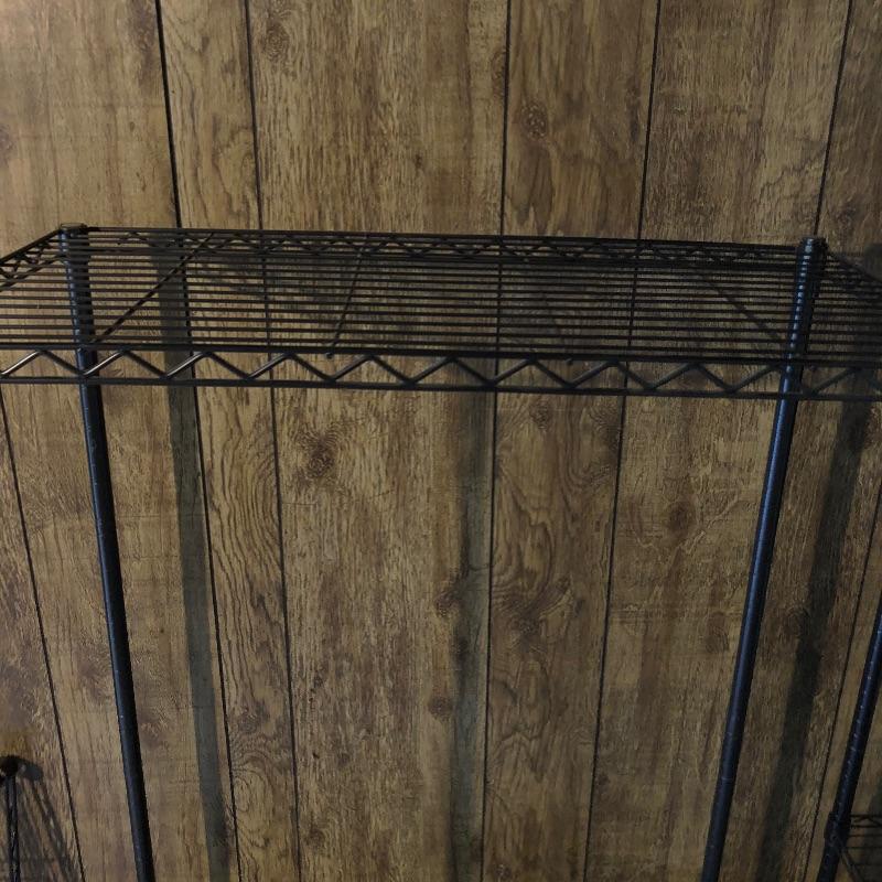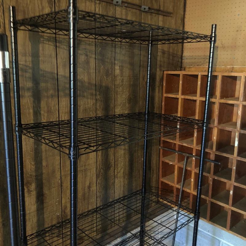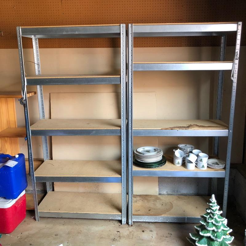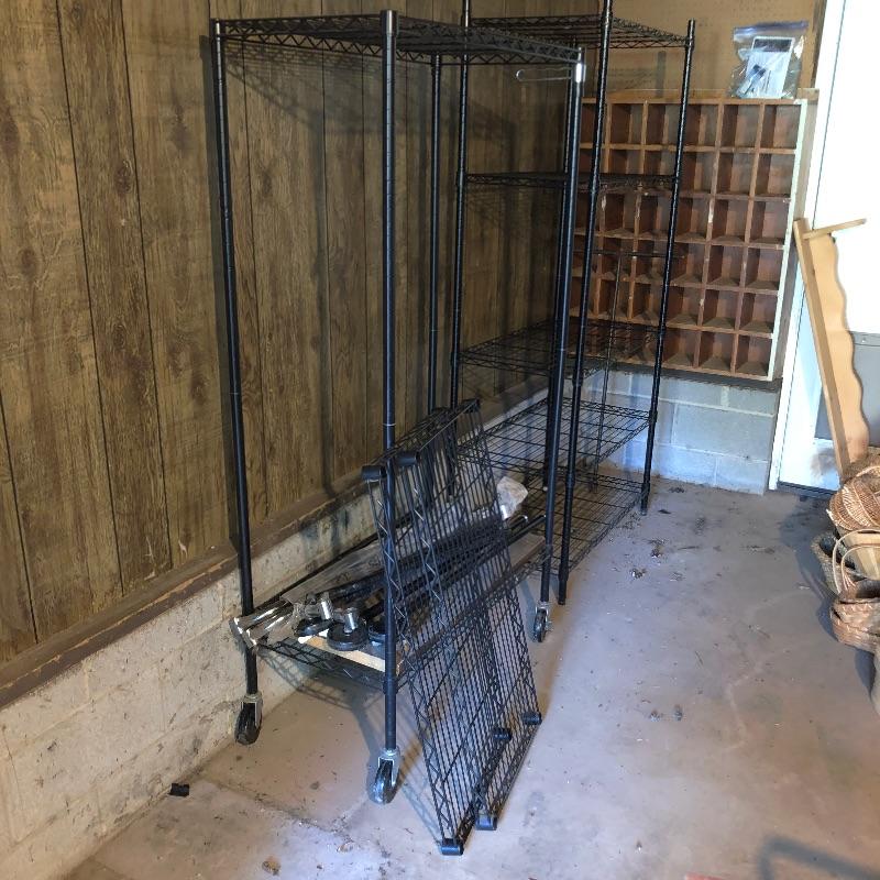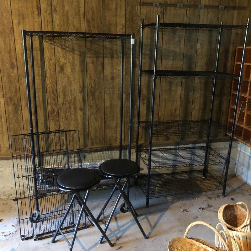 Organize your closet, pantry or garage with this great assortment of shelving units that includes a total of 4 large units. Of the two black, one is on wheels and there are four extra wheels that could go on the second unit, see images. The other two units are heavy duty with 4 shelves each with cork bases, see images as two shelves in particular have stains. These shelves measure 15” deep x 35” wide x 72” tall. Black units measure 18” deep x 35” tall, (the rolling unit is 6” shorter). We have thrown in a few storage tubs, two folding black metal stools and more to this handy lot. Plates displayed on heavy duty shelves are not included in this lot.