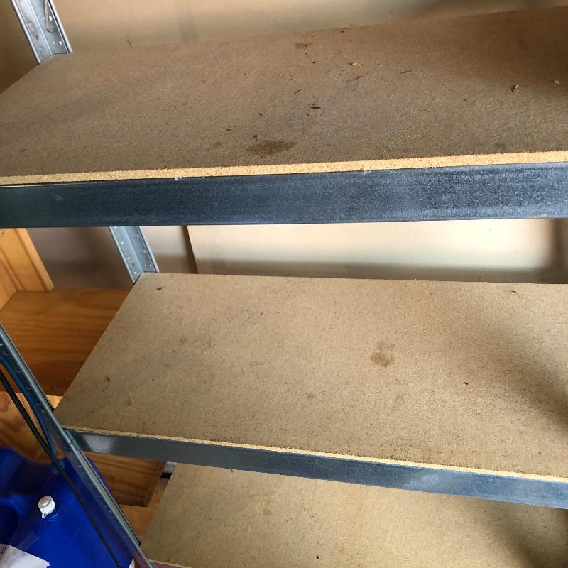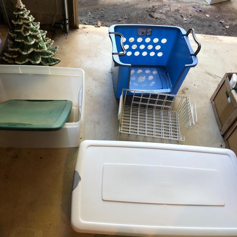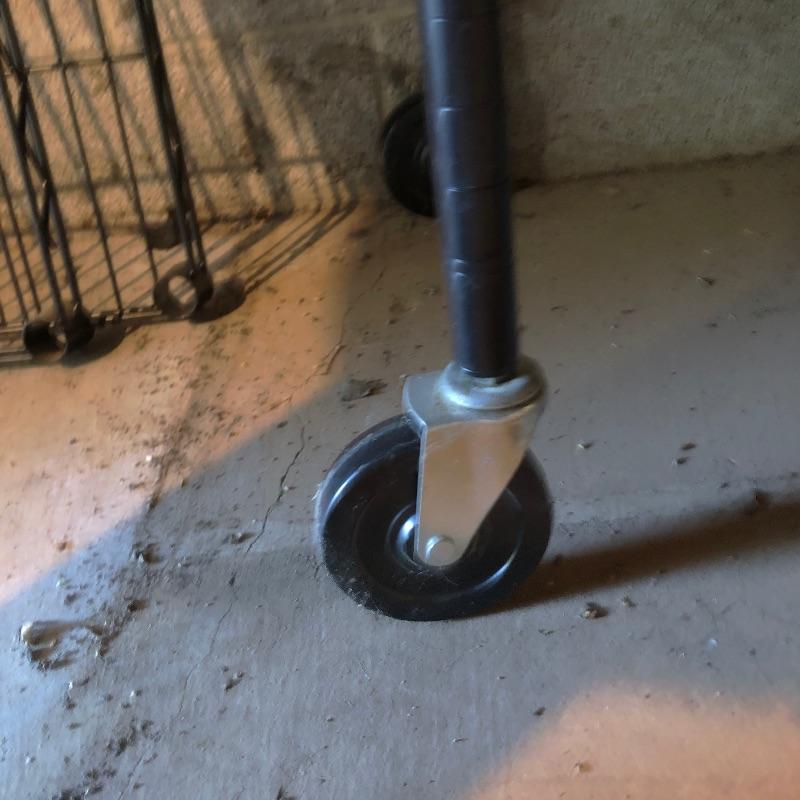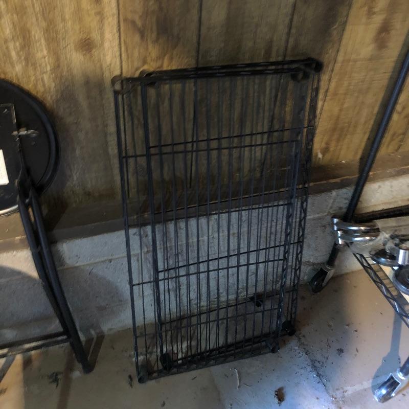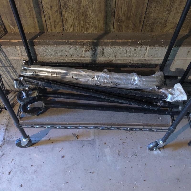 Organize your closet, pantry or garage with this great assortment of shelving units that includes a total of 4 large units. Of the two black, one is on wheels and there are four extra wheels that could go on the second unit, see images. The other two units are heavy duty with 4 shelves each with cork bases, see images as two shelves in particular have stains. These shelves measure 15” deep x 35” wide x 72” tall. Black units measure 18” deep x 35” tall, (the rolling unit is 6” shorter). We have thrown in a few storage tubs, two folding black metal stools and more to this handy lot. Plates displayed on heavy duty shelves are not included in this lot.