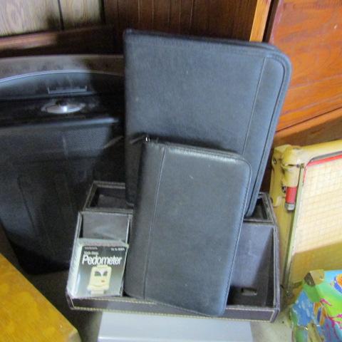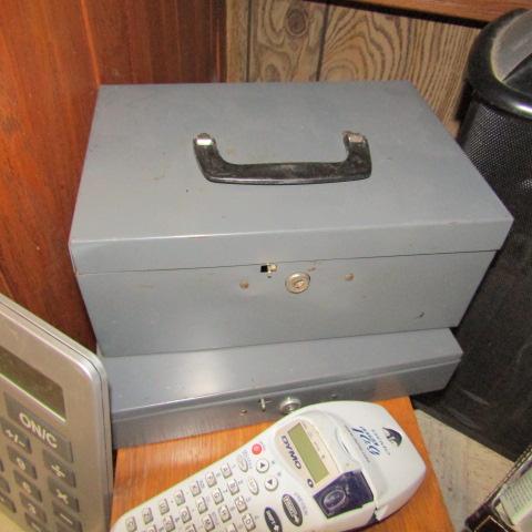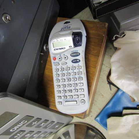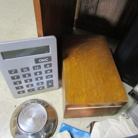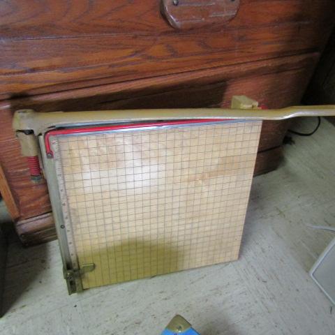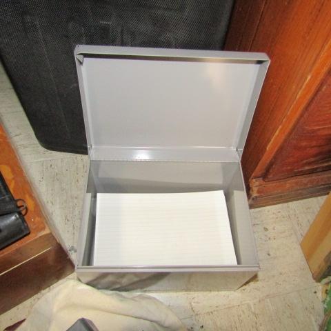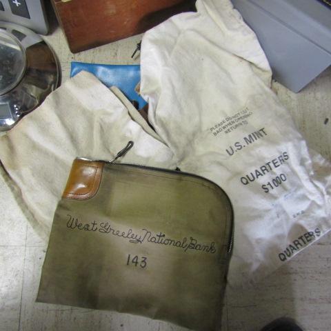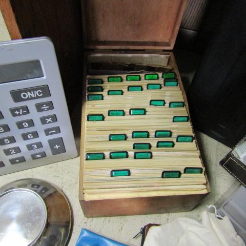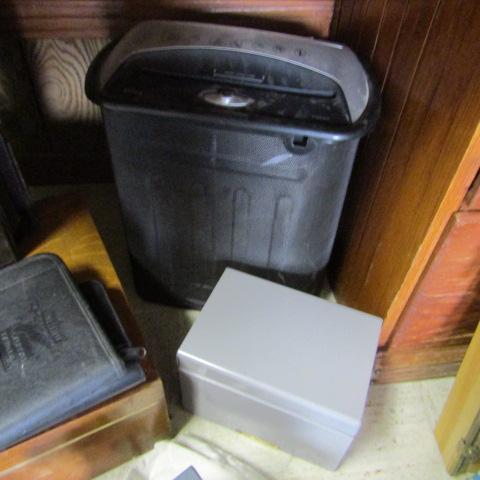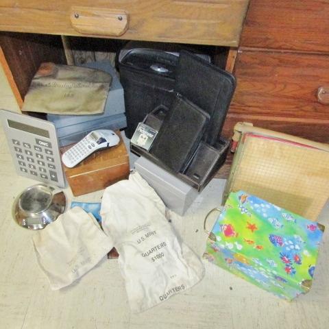 VINTAGE PAPER CUTTER, PAPER SHREDDER, WOODEN & METAL INDEX FILING BOXES, POSTAGE SCALE, LABEL MAKER, METAL FILE BOXES, BANK BAGS AND MORE