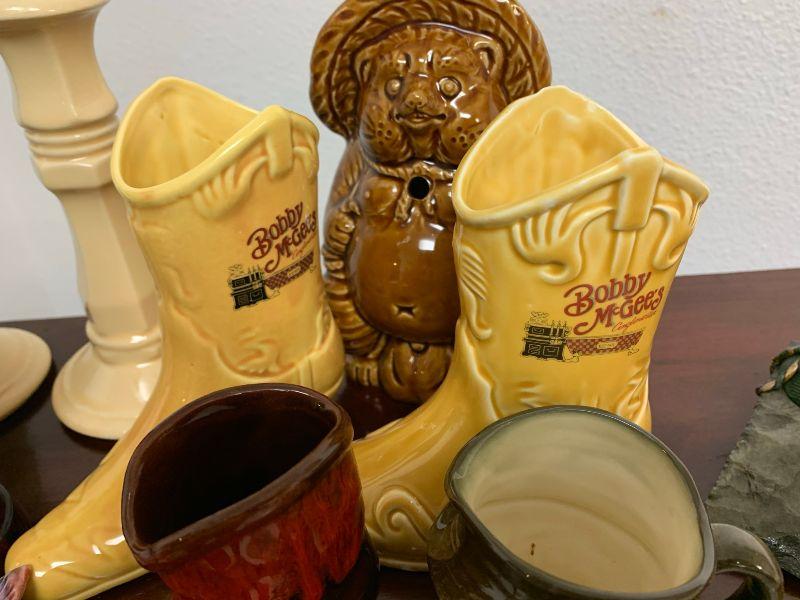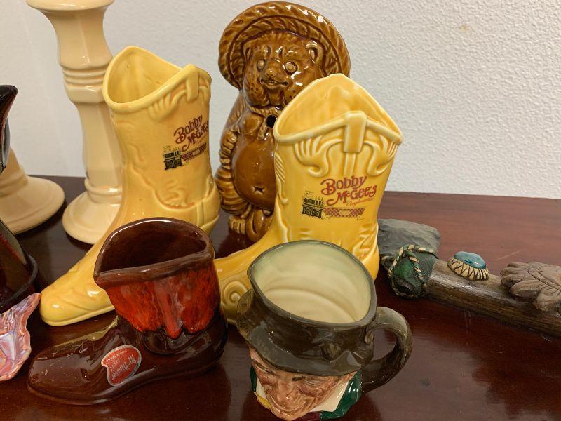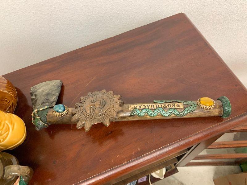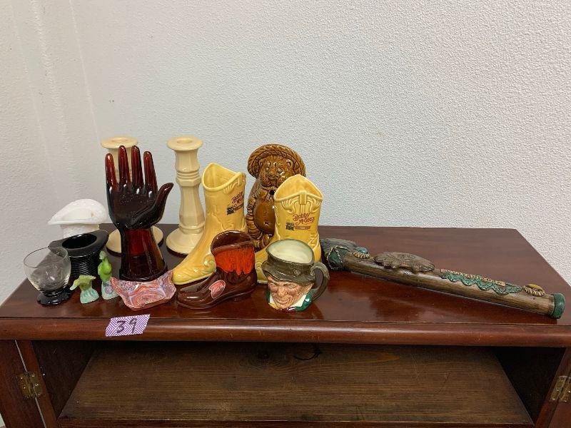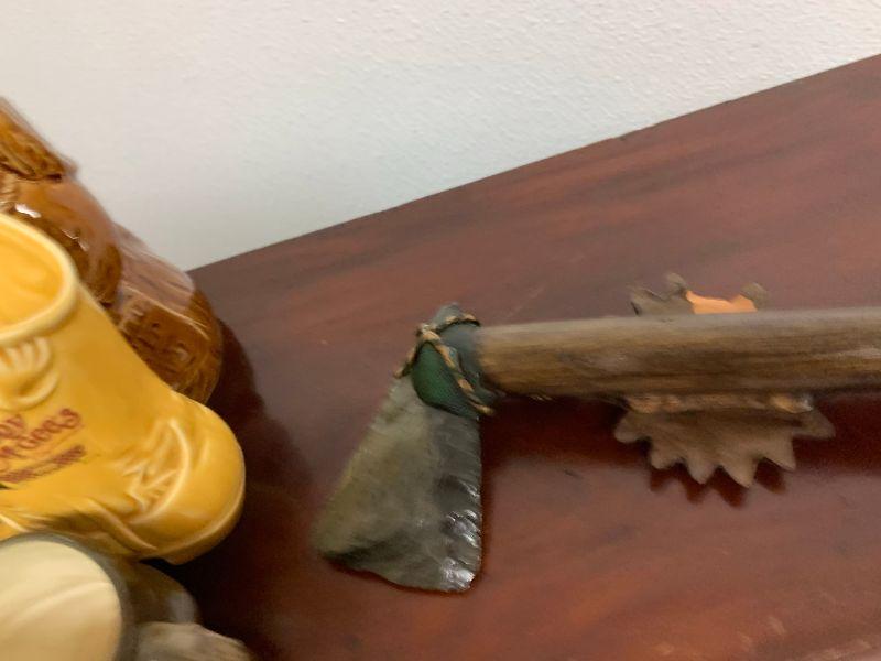 Misc. items/glass ware tiki, tomahawk as is, and more. 14 items total