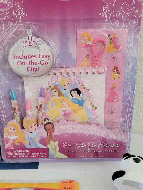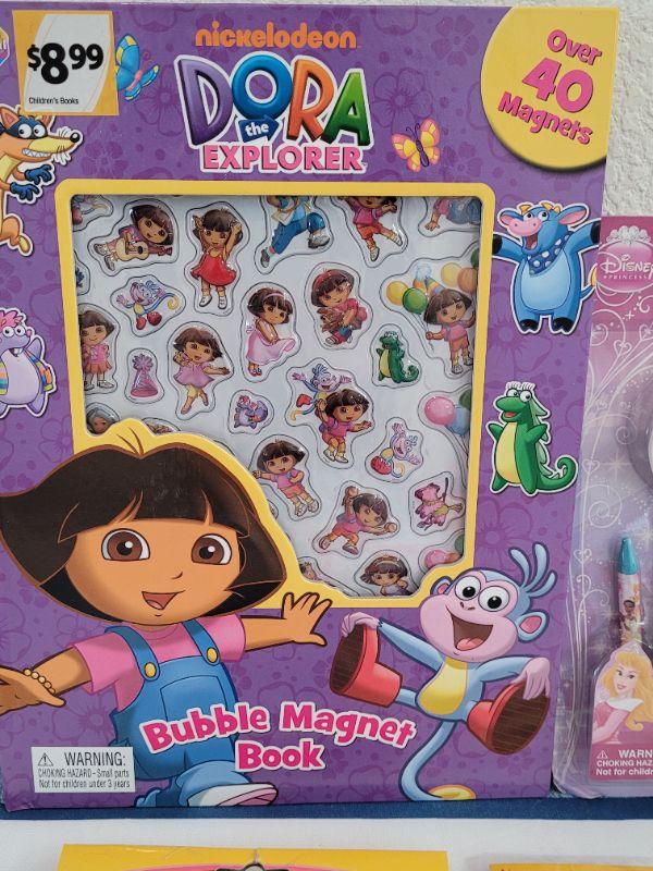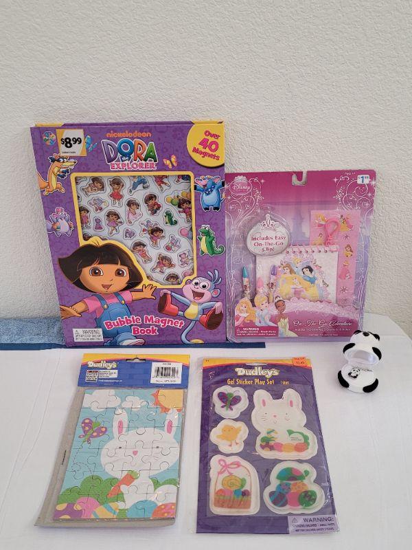 Lot 39: New Dora the Explorer Bubble Magnet Book, Disney Princess Activity Set, Window Gels, Puzzle and Panda Bear Necklace
