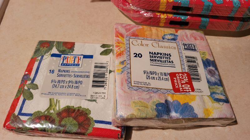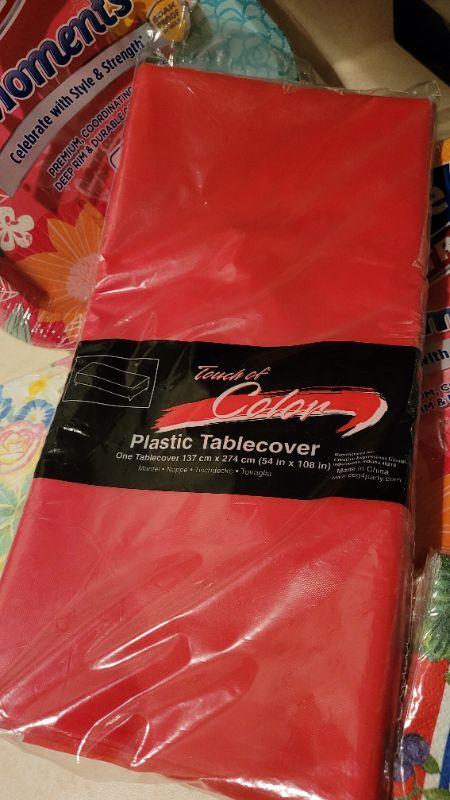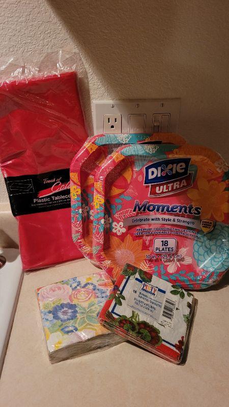Lot 39: Assorted Disposable Plates, Napkins + Tablecloth