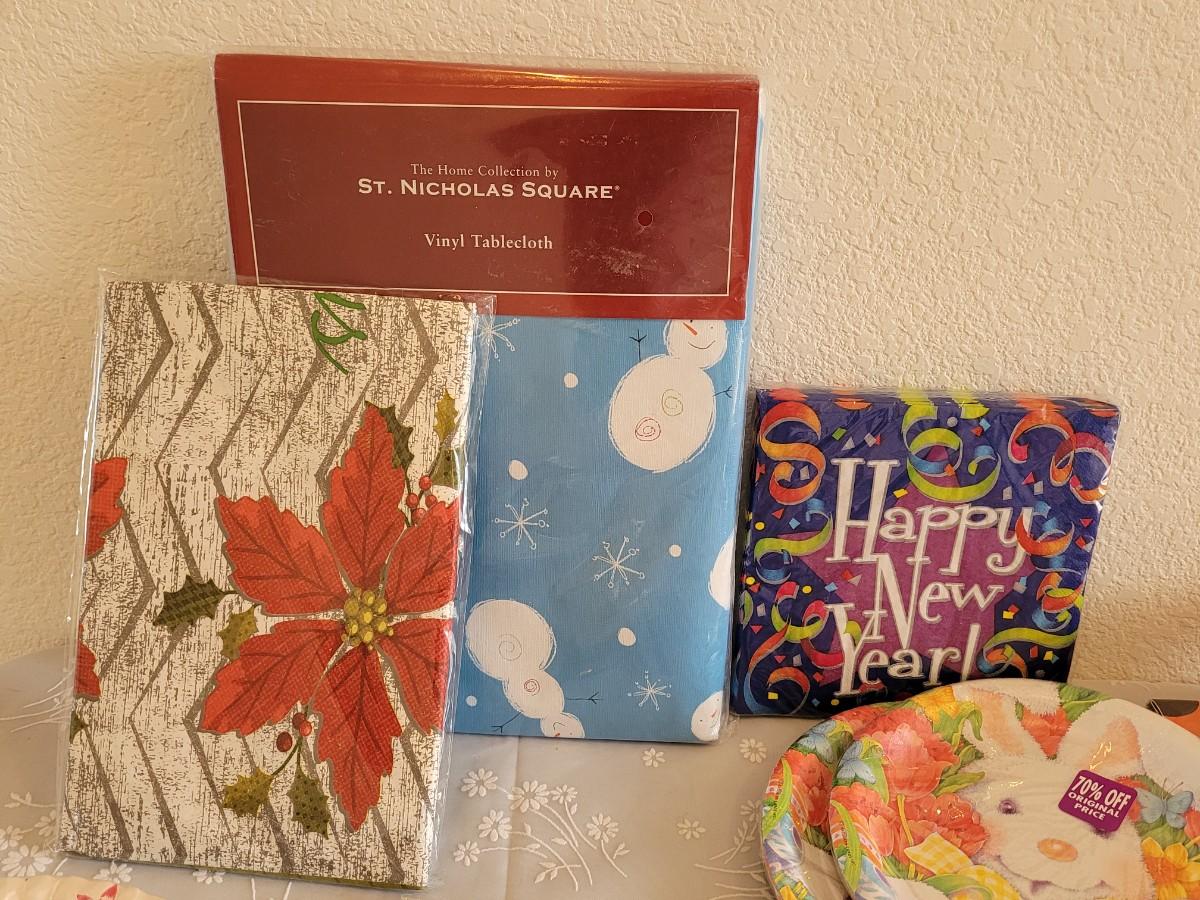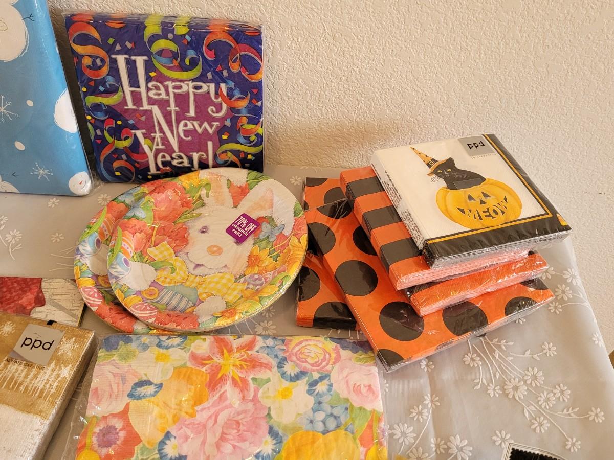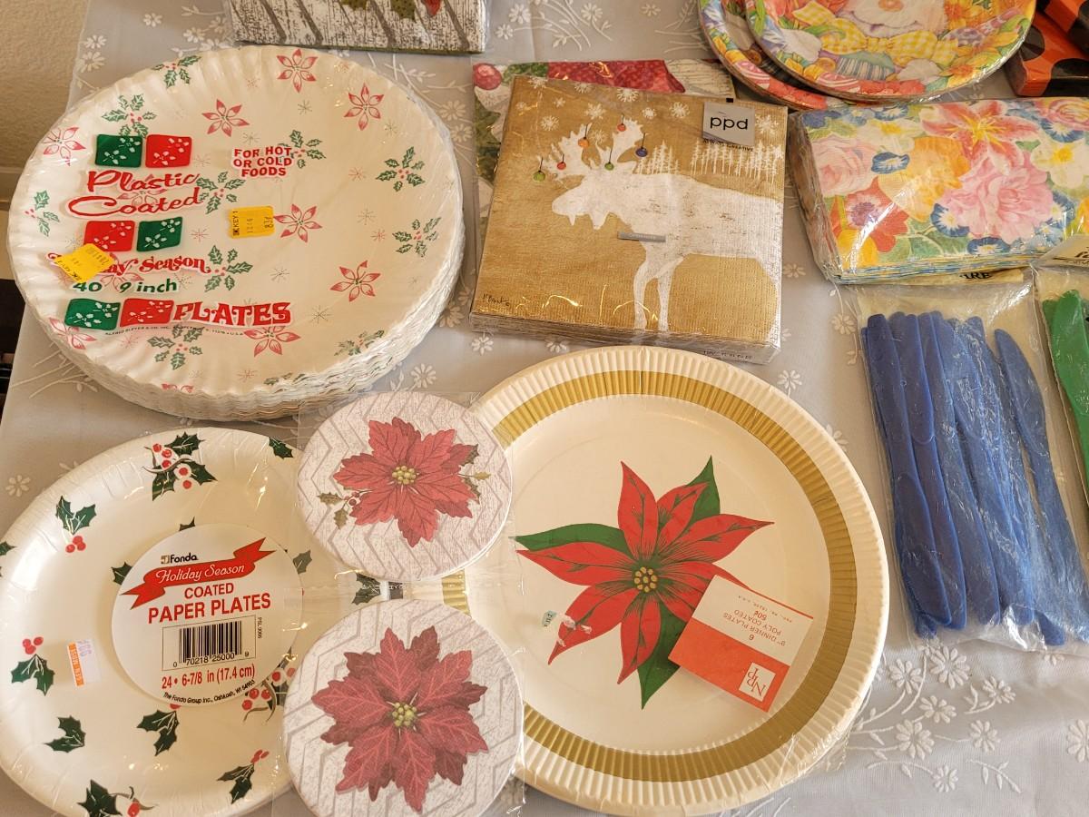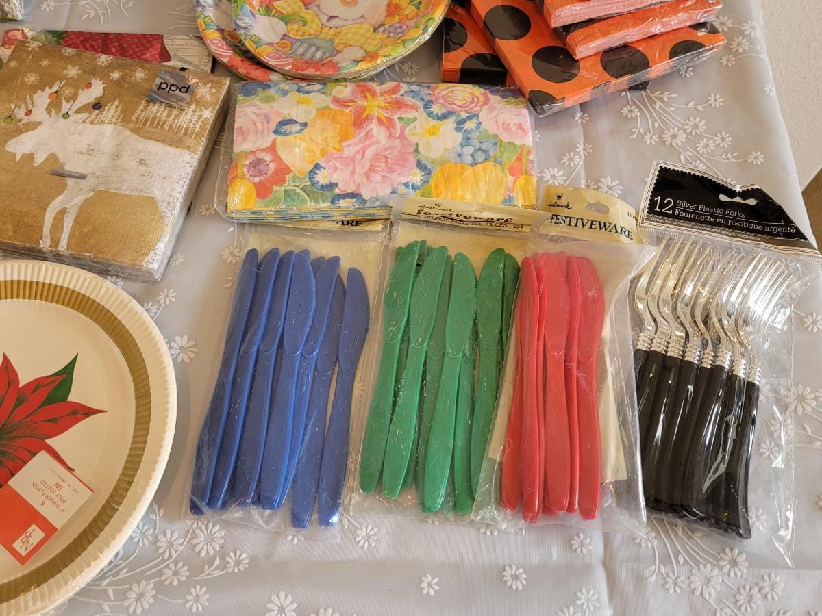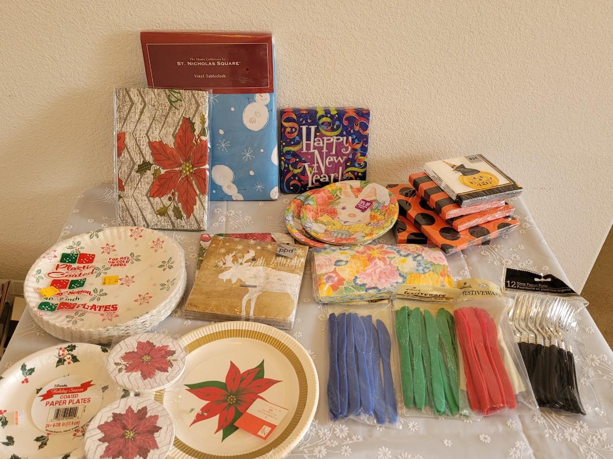 Lot 39: Disposable Plates Napkins, Coasters, Tablecloth and Flatware