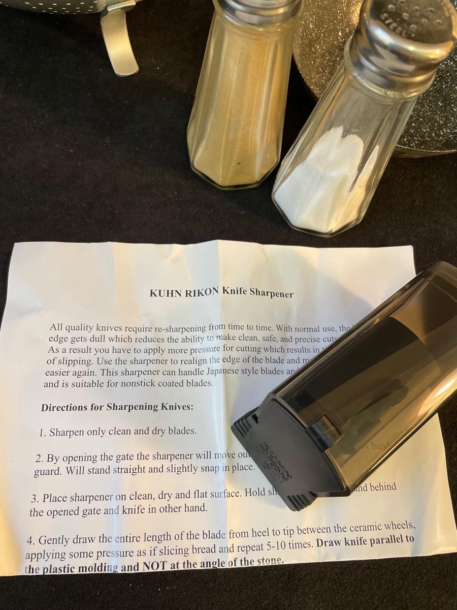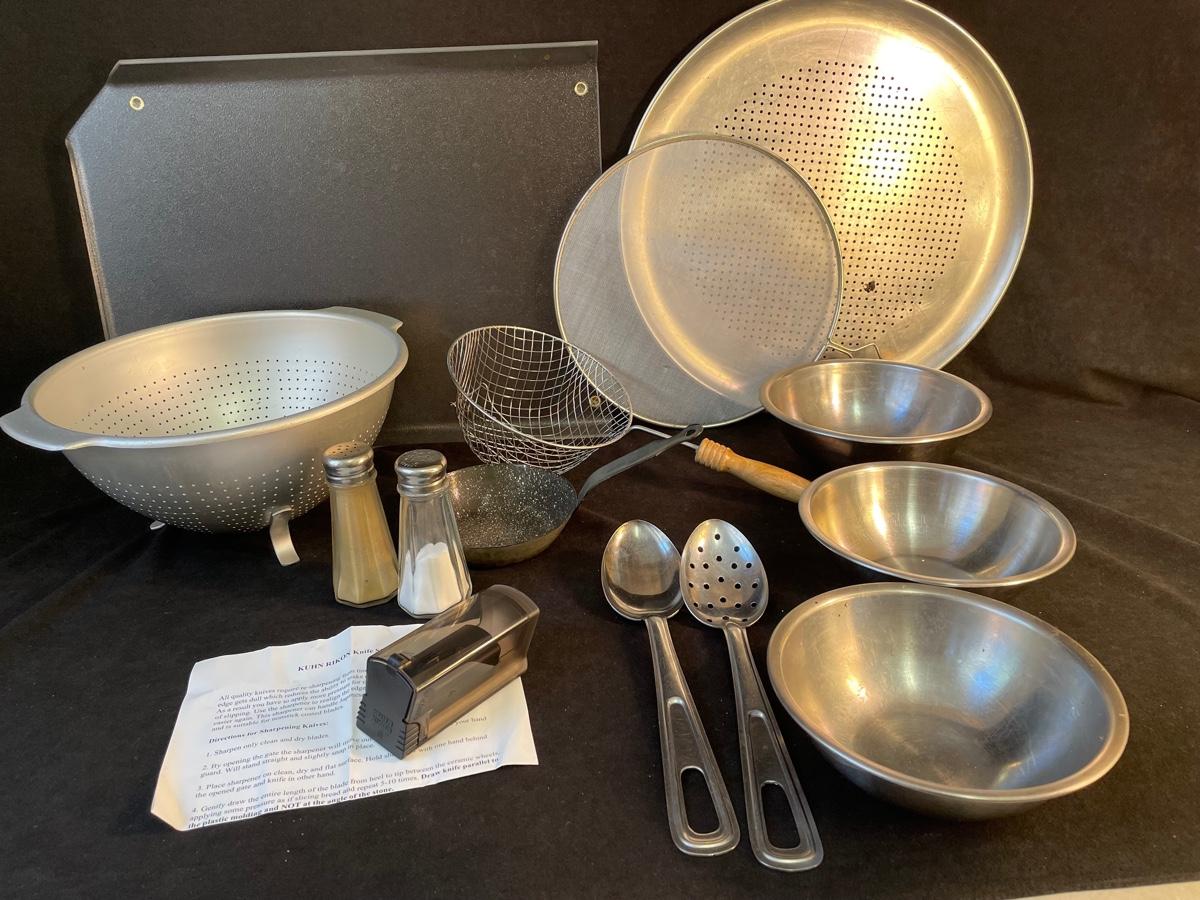 Perforated round pizza pan, collander, spatter screen, deep fry basket, set of 3 mixing bowls, salt and pepper set, Kuhn Rikon knife sharpener, and a textured Plexiglas dish-drying drain tray