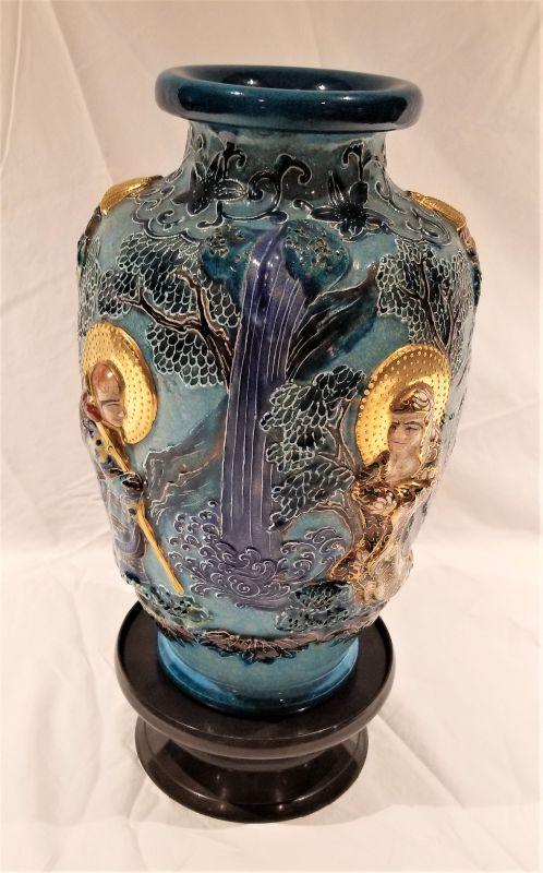 A real treasure. Heavily embellished Antique Satsuma vase on metal stand. Deep cobalt blue background. A few minor blemishes commensurate with age (nothing major - no chips). Wonderfully tactile. Stands 12" tall, not counting stand. Stand is 2 3/4 inches tall.