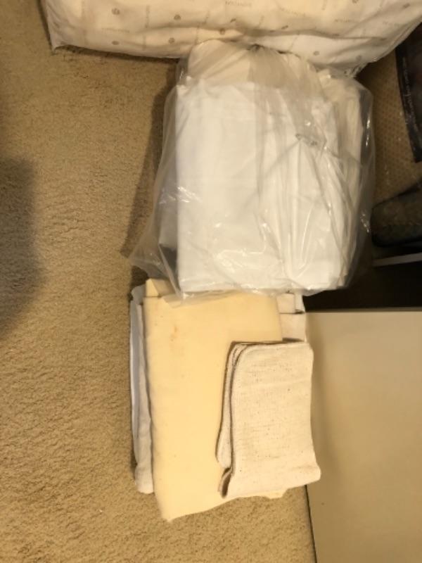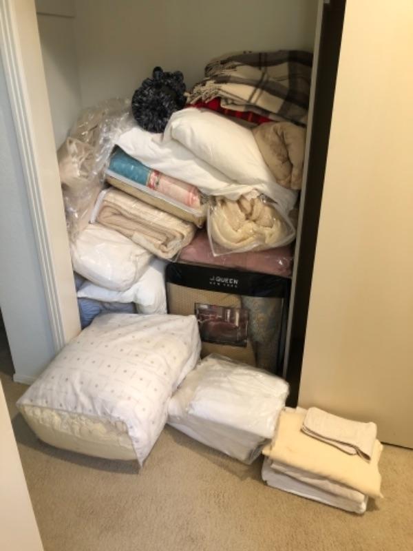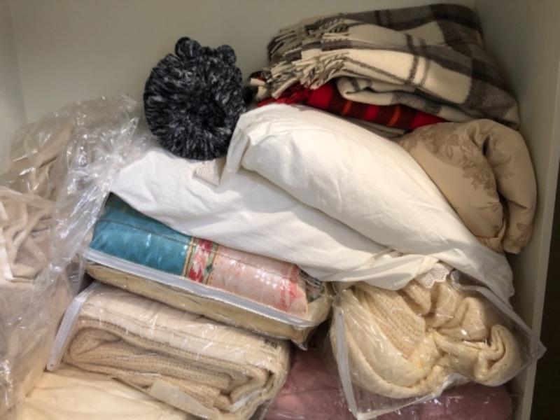 Lot 39. Assorted bedding, new queen set, new throw, 11 pillows,5 blankets, 2 flat sheets, bag of sheets and blankets--WAS $75““NOW $37.50