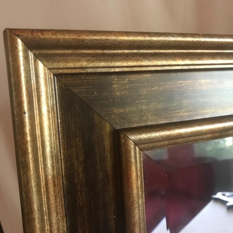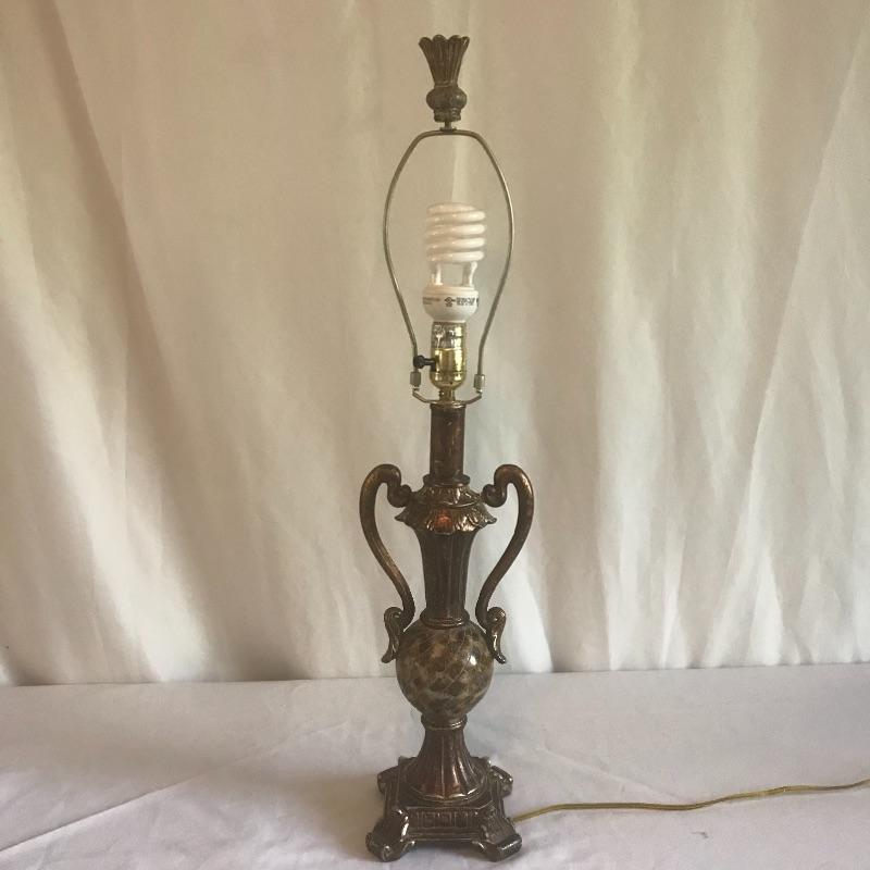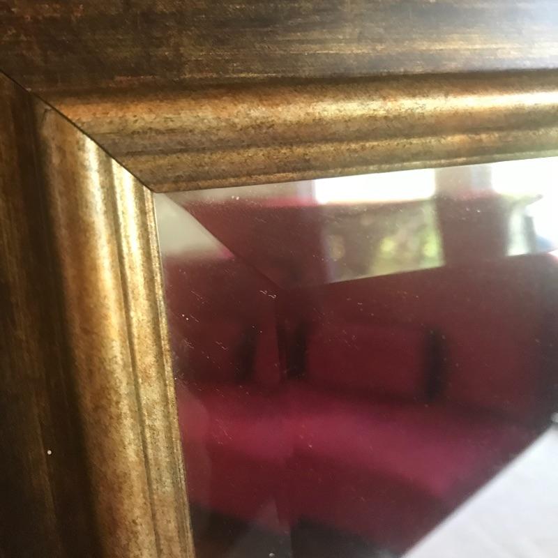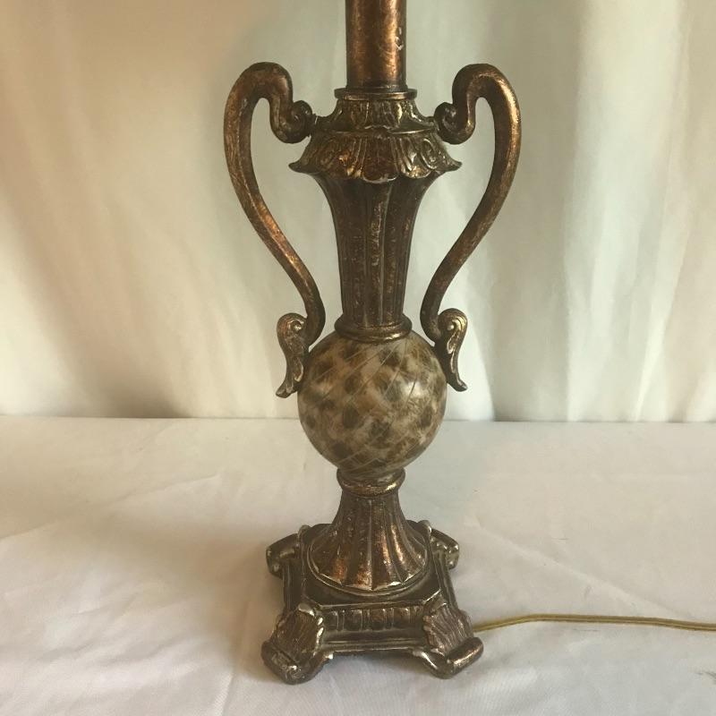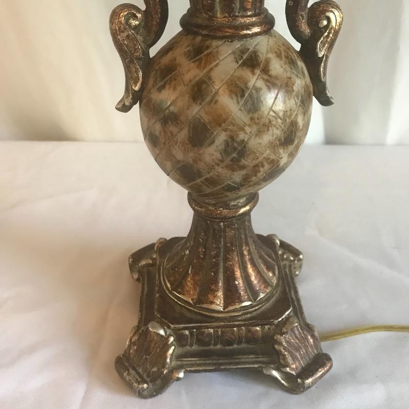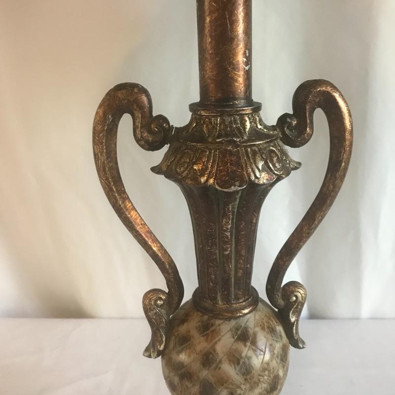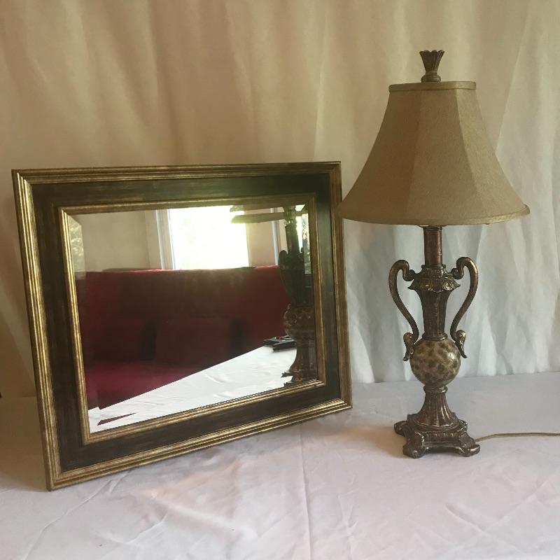 Two modern pieces to style up your area. A lovely beveled mirror with a painted faux gold and wood design. The frame is of unknown material. It’s in great condition, with what could be tiny white paint splatter only noticeable with up close inspection. This mirror works wonderfully well with a modern Grecian urn style lamp. Lamp is also an unknown material mixed with metal, but looks like marble and vintage metal. It works when prompted and has a golden colored fabric shade in nice condition. Mirror measures approximately 22” x 26” and the lamp is about 29.25” tall to the top of the crown like finial. See photos. Local pick up only.