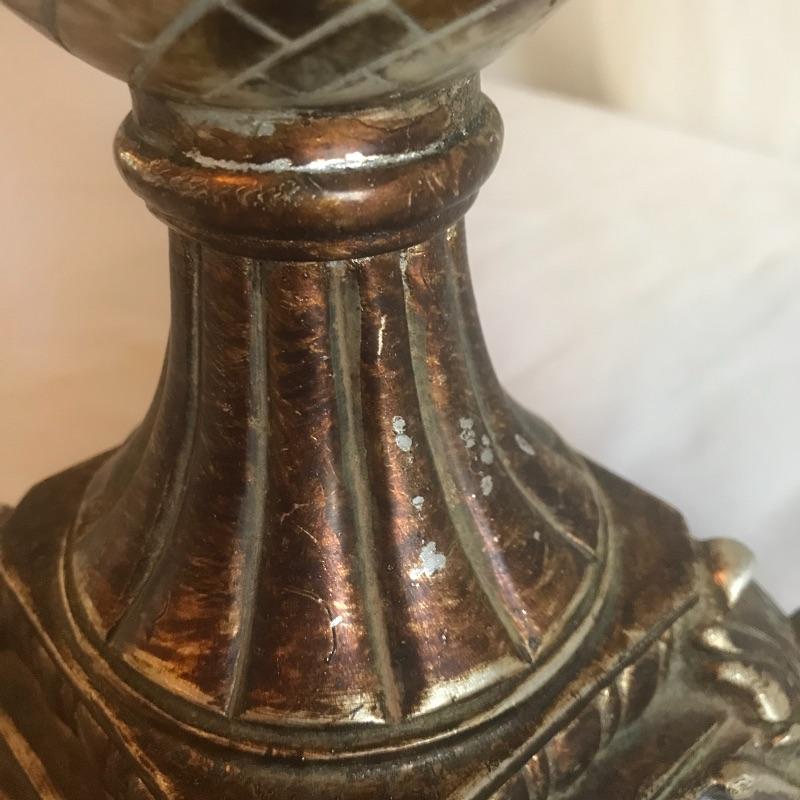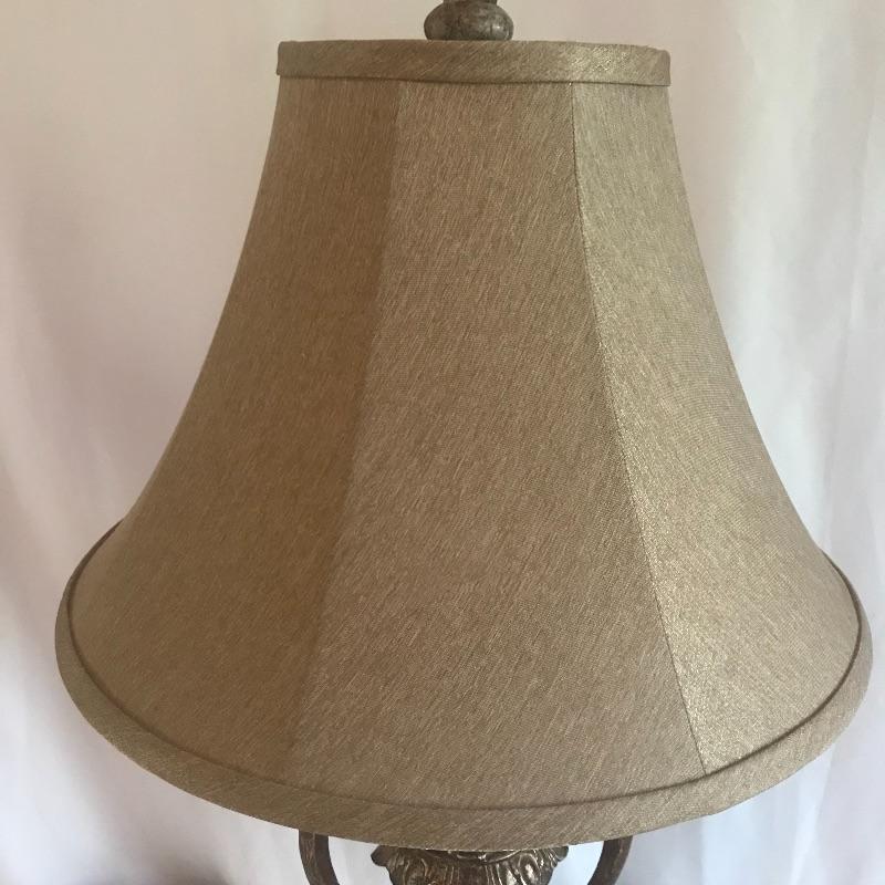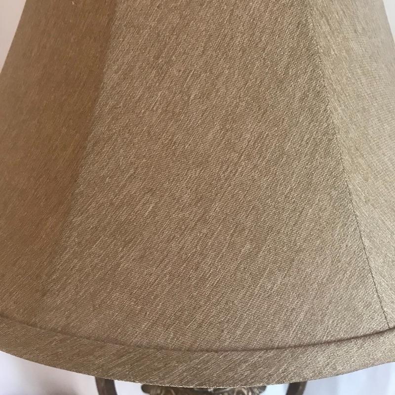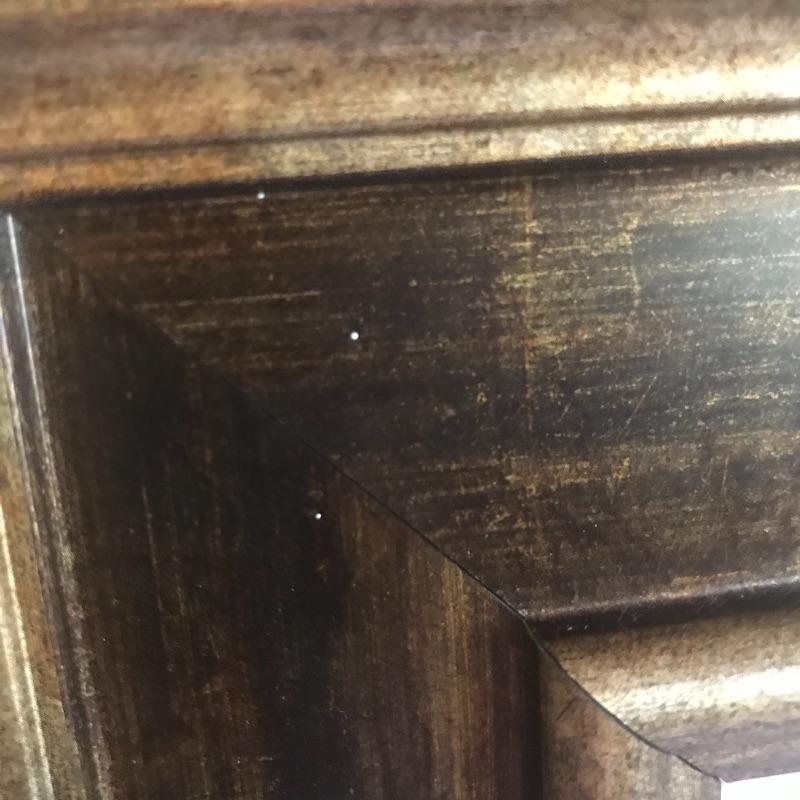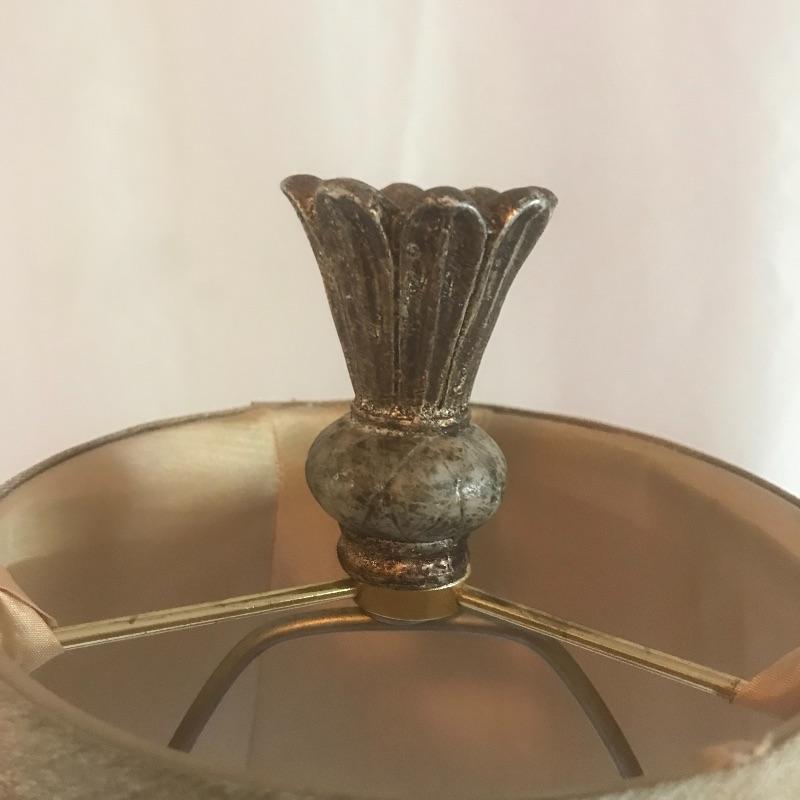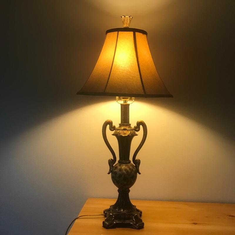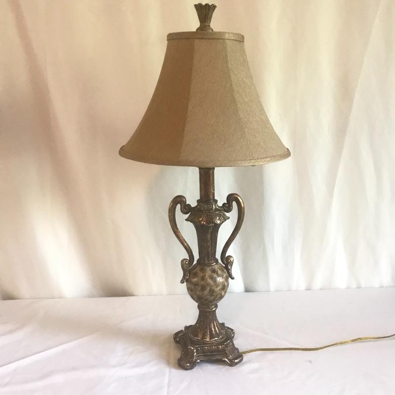 Two modern pieces to style up your area. A lovely beveled mirror with a painted faux gold and wood design. The frame is of unknown material. It’s in great condition, with what could be tiny white paint splatter only noticeable with up close inspection. This mirror works wonderfully well with a modern Grecian urn style lamp. Lamp is also an unknown material mixed with metal, but looks like marble and vintage metal. It works when prompted and has a golden colored fabric shade in nice condition. Mirror measures approximately 22” x 26” and the lamp is about 29.25” tall to the top of the crown like finial. See photos. Local pick up only.
