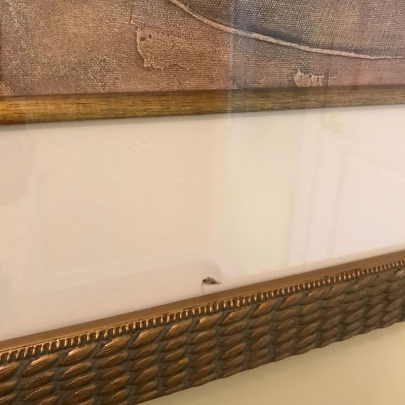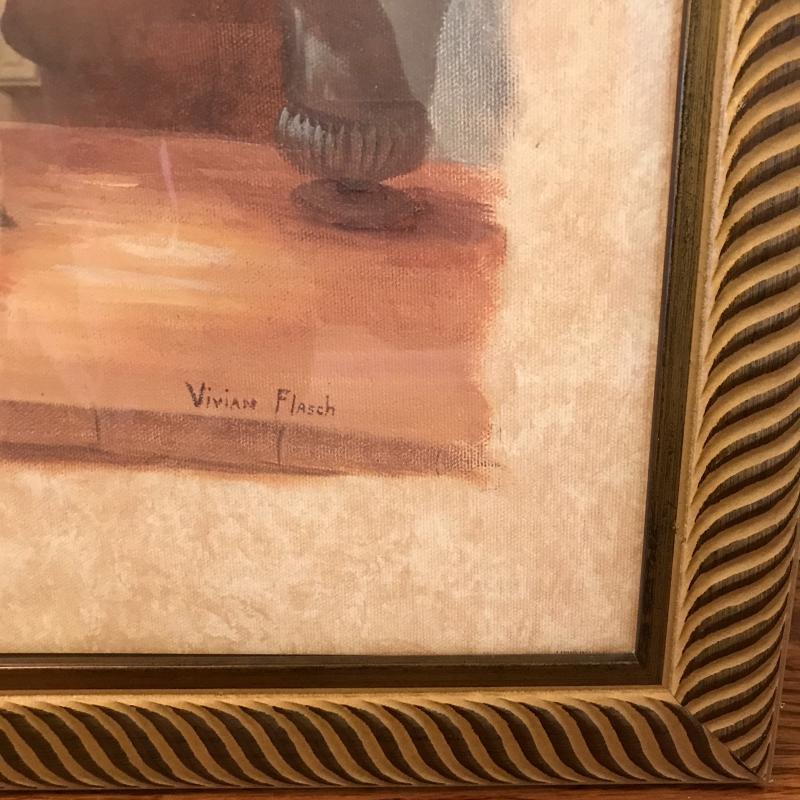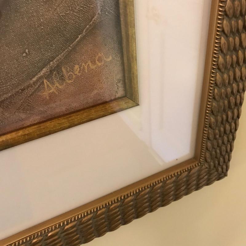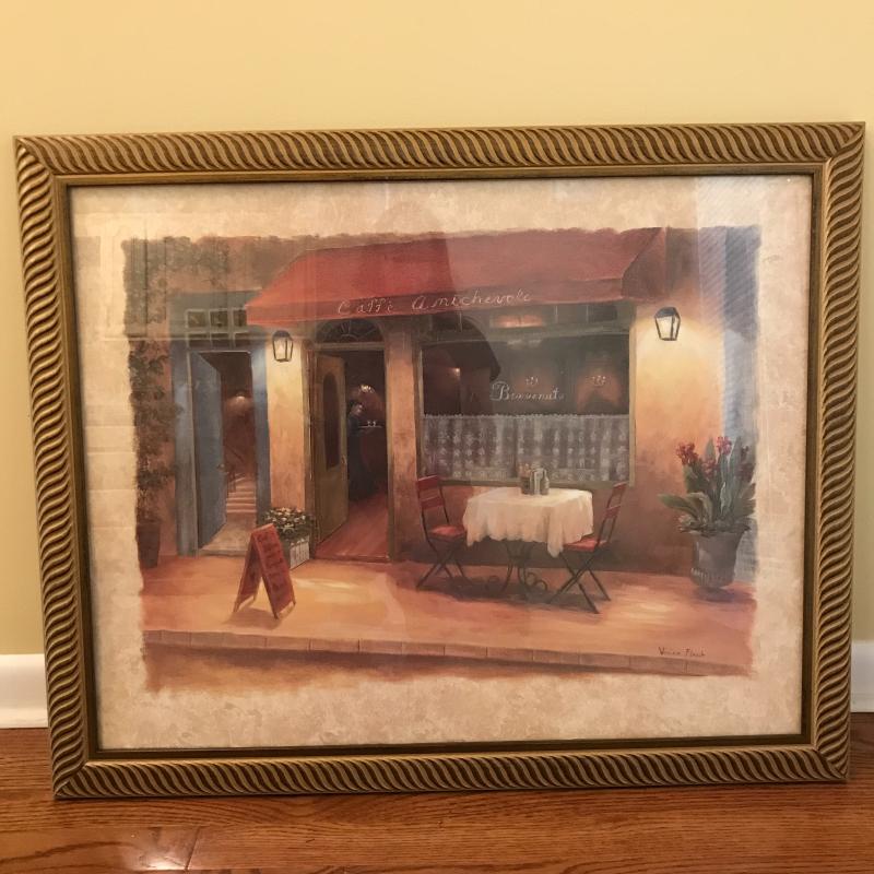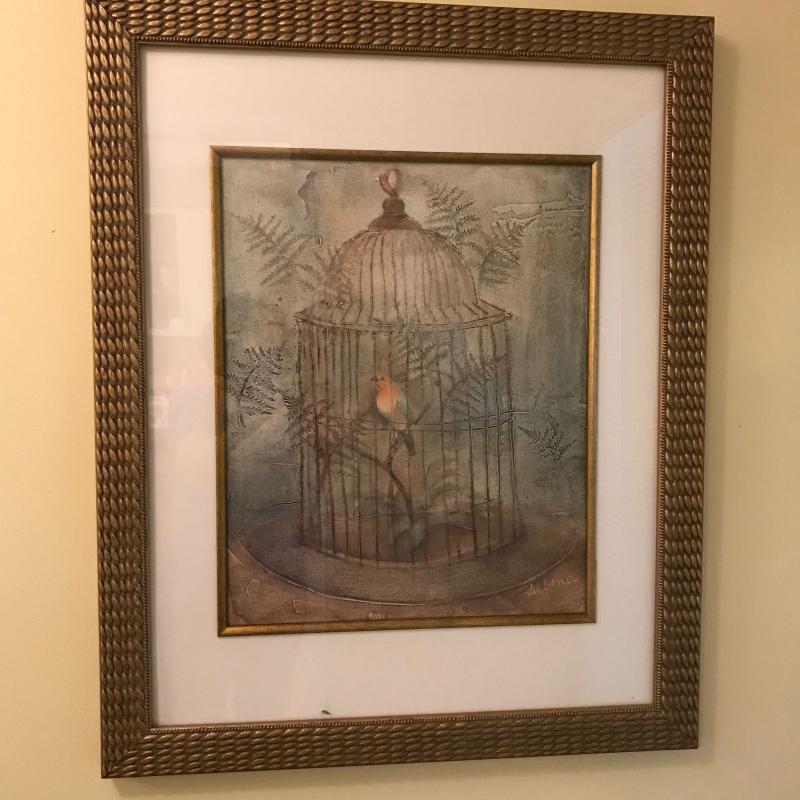 Large print of a bird cage measures 25.5” by 31.5” and is signed “Albena”. Another framed print of a cafe scene is also included in this lot and measures 31” x 25”. No shipping.
