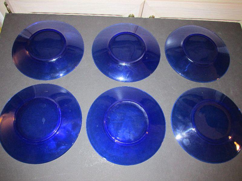 Set of Eight Blue Glass plates. Only 6 are shown in photos due to frame size but there are 8 total. Unknown maker. No chips or cracks.