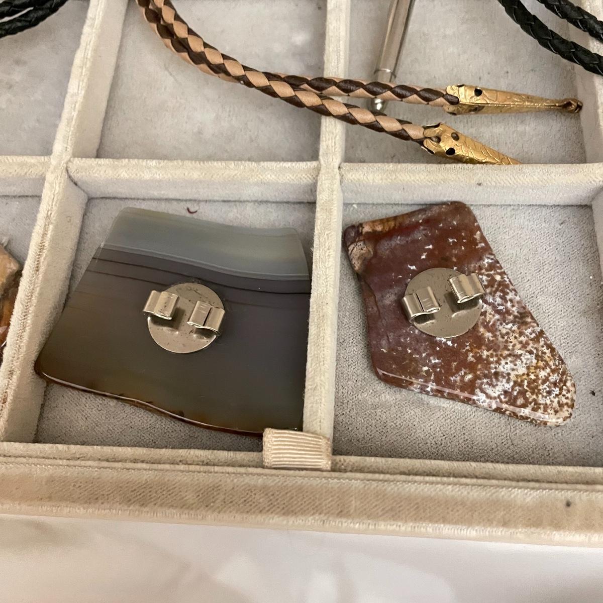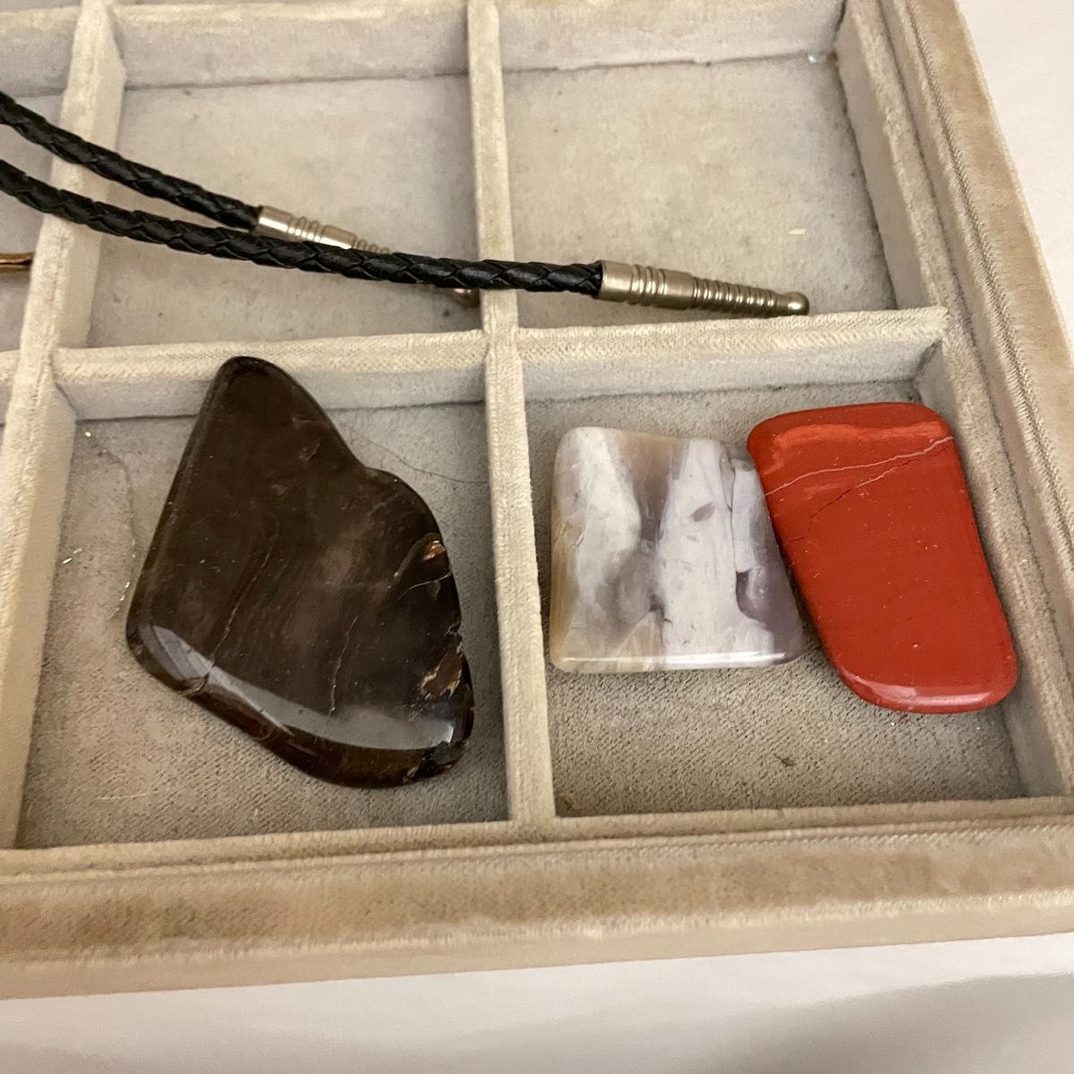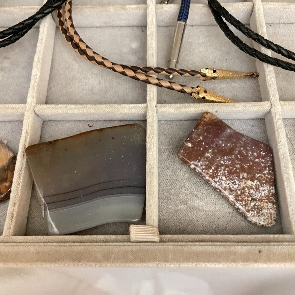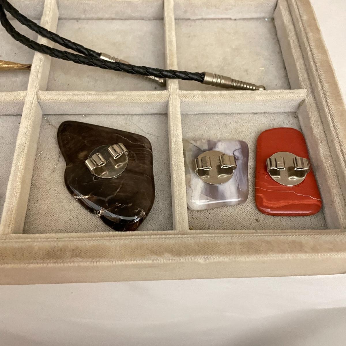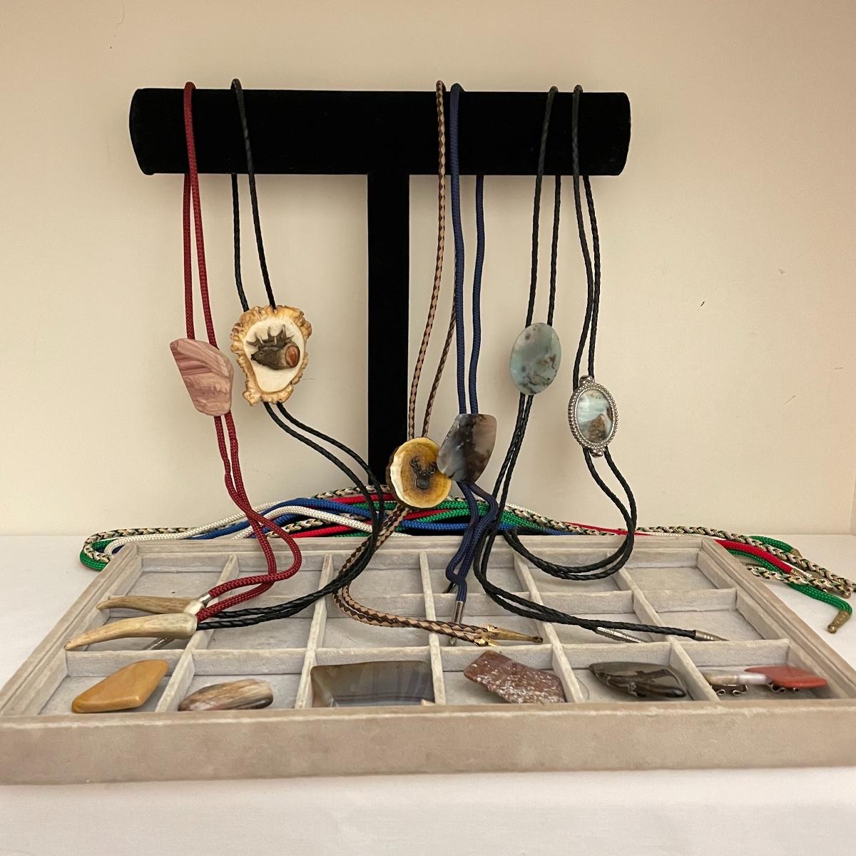 Here’s a very nice selection of Bolo ties full of beautiful polished stones and more. Lot features four braided leather and seven cord ties with thirteen clasps. Most clasps are stunning polished stones with the exceptions of the Buck embellishments which appear to be resin based. All cords except the multi-colored and the claw like leather cord, have metal aiguillettes. Sizes range from 36” to 44”, the leather cords are about 42”. The drawer organizer is included, measuring 15” x 8.5” x 1”. See images. Shipping available.