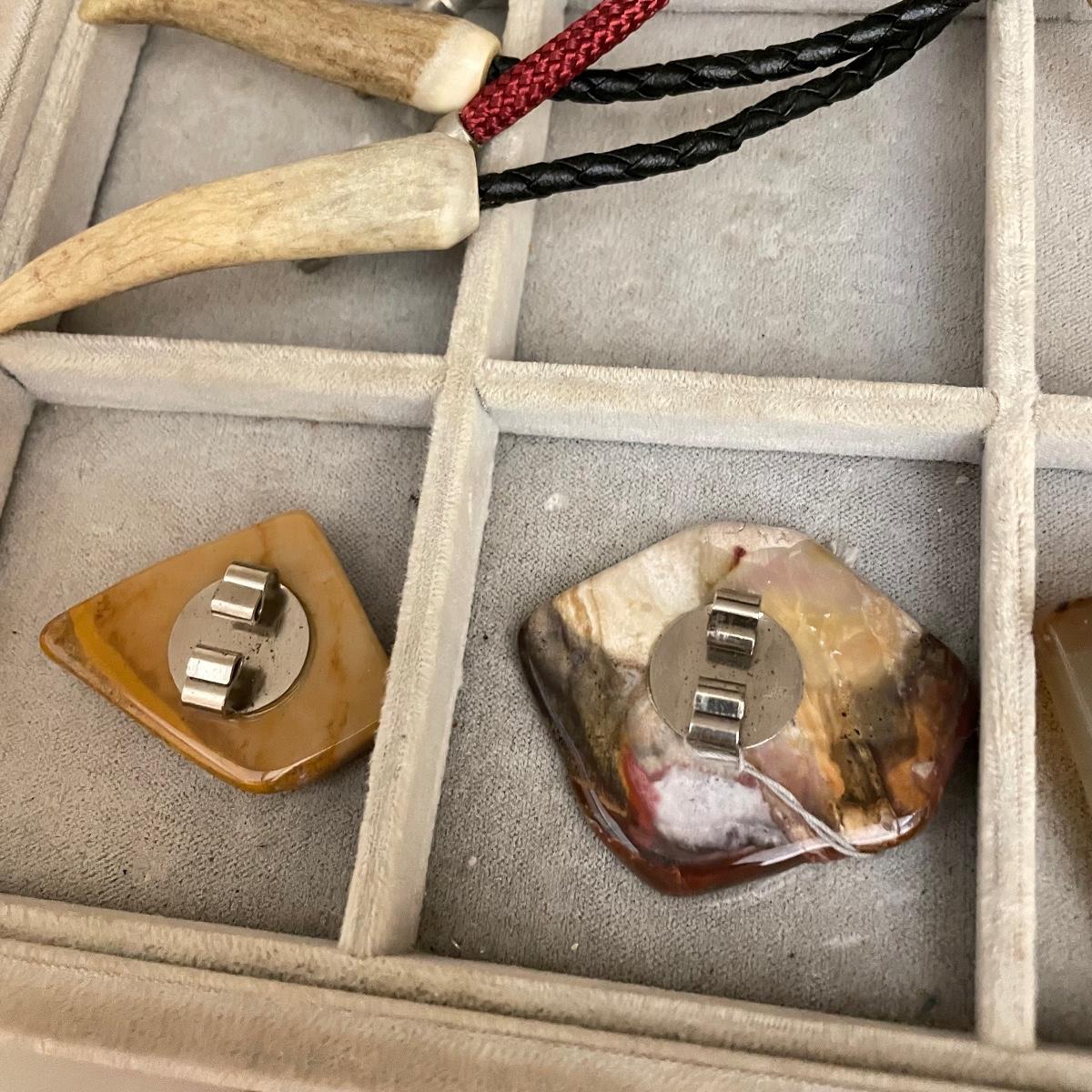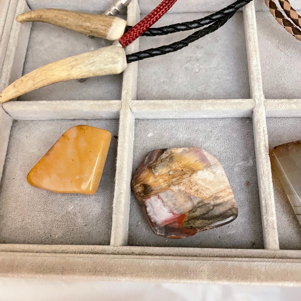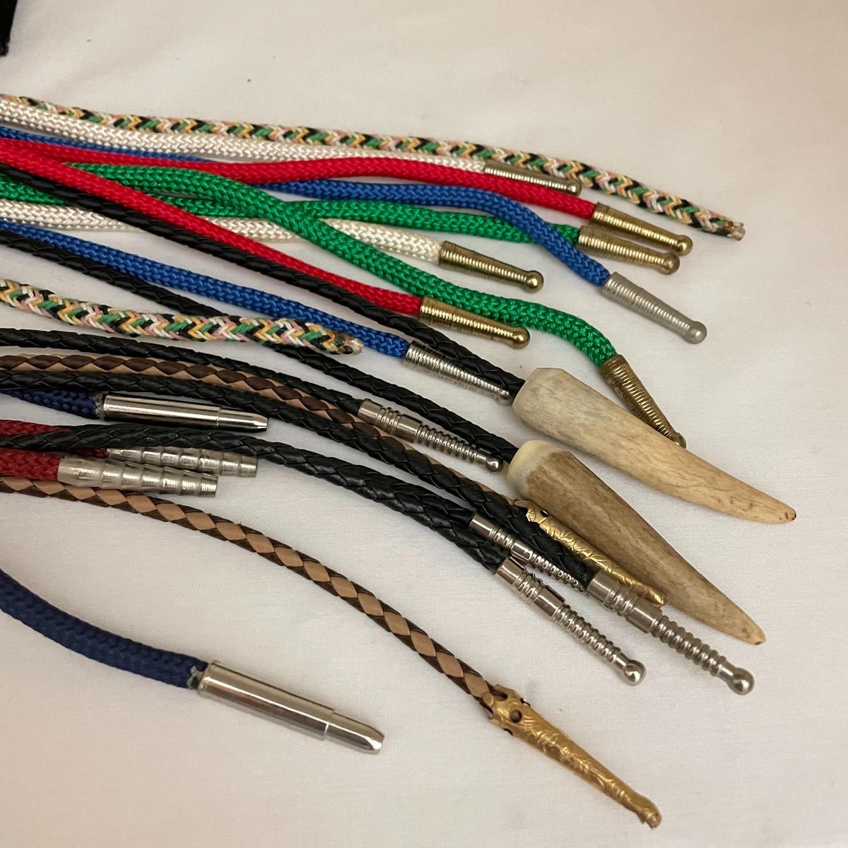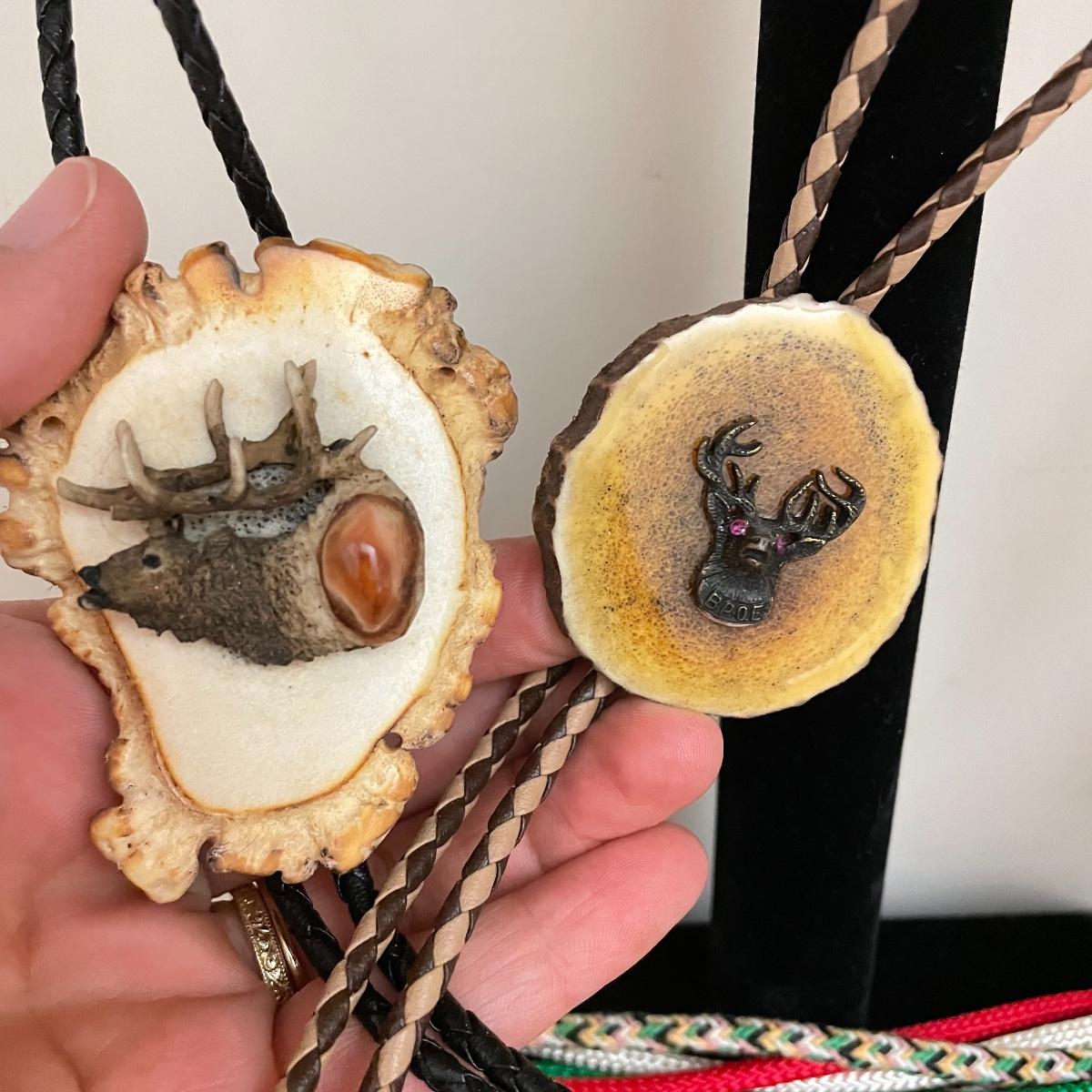 Here’s a very nice selection of Bolo ties full of beautiful polished stones and more. Lot features four braided leather and seven cord ties with thirteen clasps. Most clasps are stunning polished stones with the exceptions of the Buck embellishments which appear to be resin based. All cords except the multi-colored and the claw like leather cord, have metal aiguillettes. Sizes range from 36” to 44”, the leather cords are about 42”. The drawer organizer is included, measuring 15” x 8.5” x 1”. See images. Shipping available.