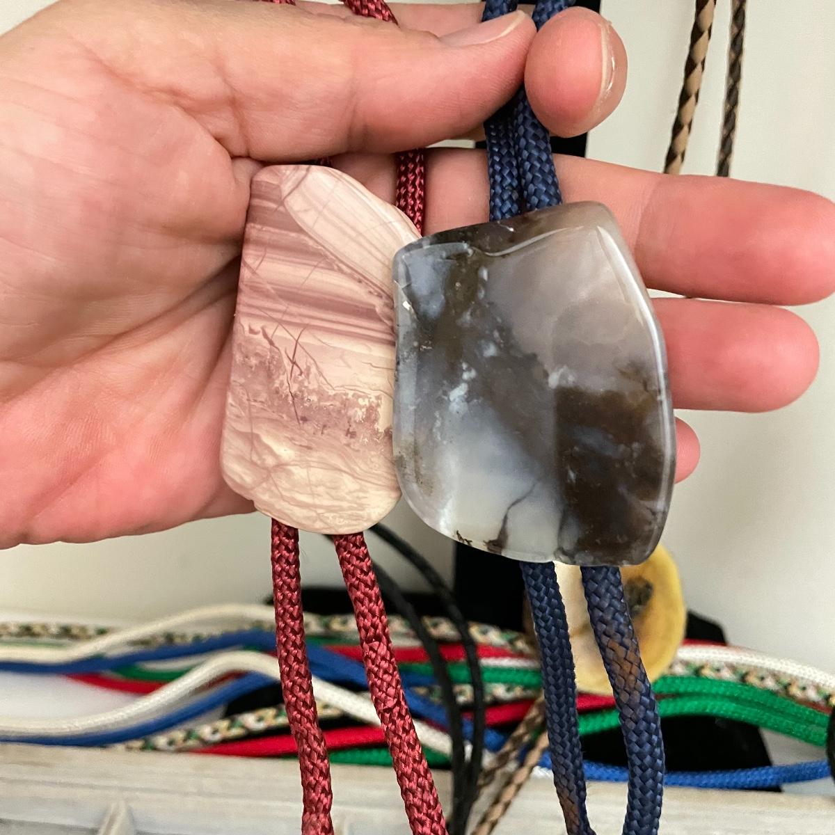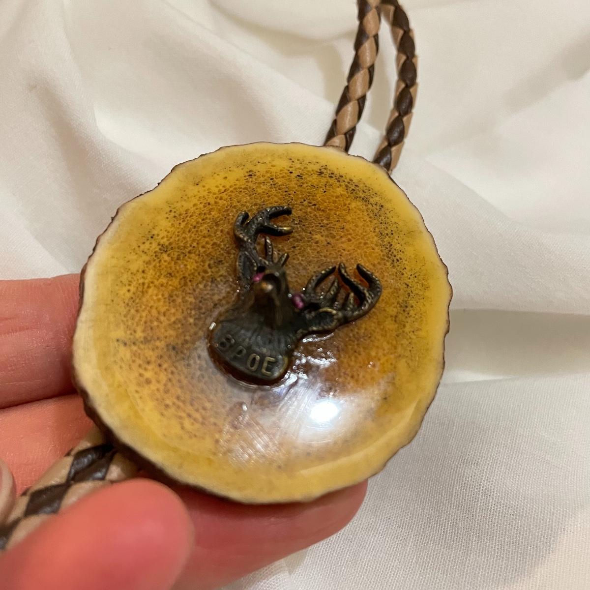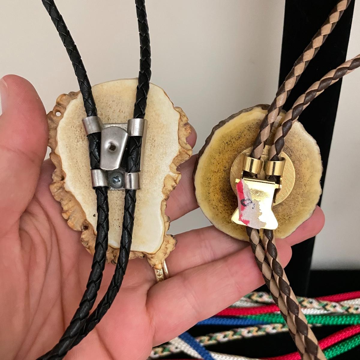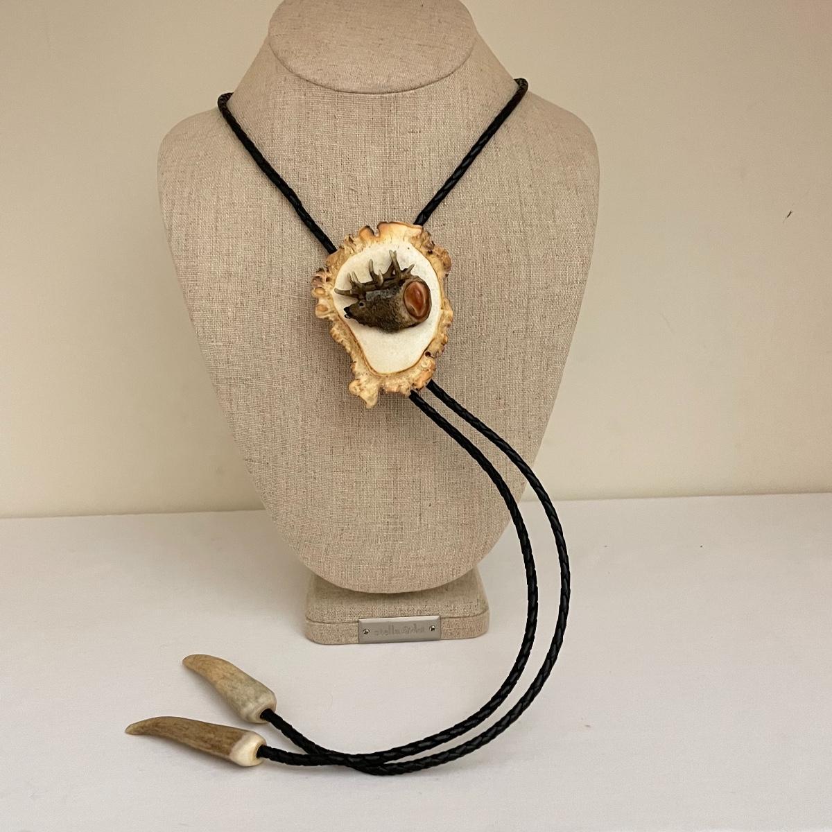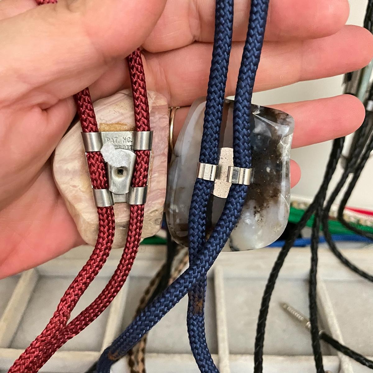 Here’s a very nice selection of Bolo ties full of beautiful polished stones and more. Lot features four braided leather and seven cord ties with thirteen clasps. Most clasps are stunning polished stones with the exceptions of the Buck embellishments which appear to be resin based. All cords except the multi-colored and the claw like leather cord, have metal aiguillettes. Sizes range from 36” to 44”, the leather cords are about 42”. The drawer organizer is included, measuring 15” x 8.5” x 1”. See images. Shipping available.