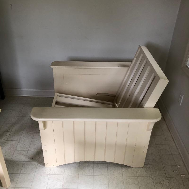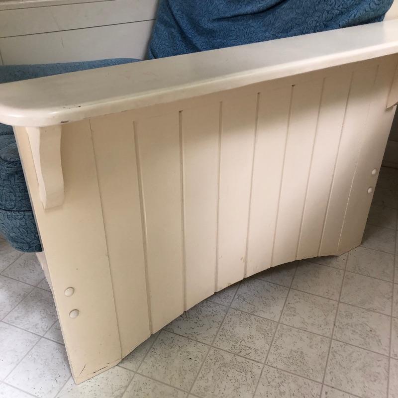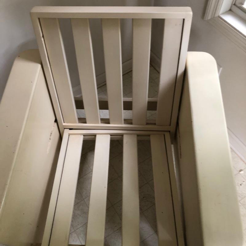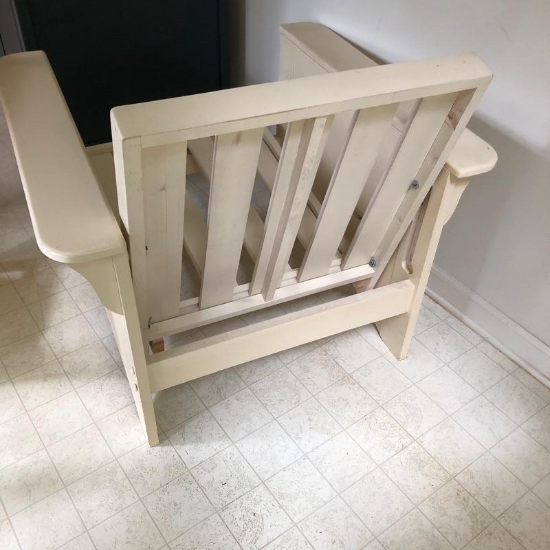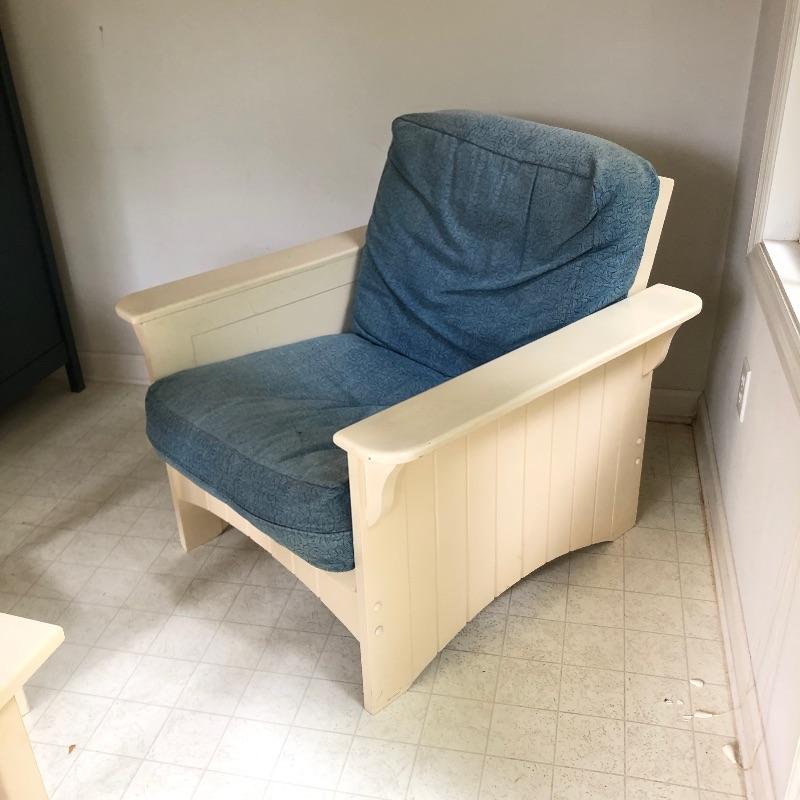 design together. All pieces are a creamy eggshell color. The comfortable chair cushion could do with a new seat cover as the current one has faded from the sun and has a small stain. The cover has a zipper and could be easily removed and replaced. See lots 45 & 135 for matching pieces.